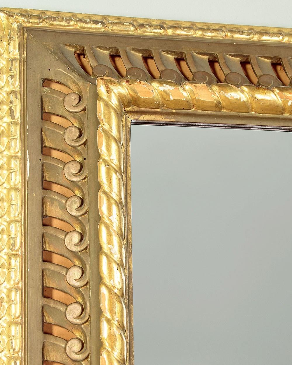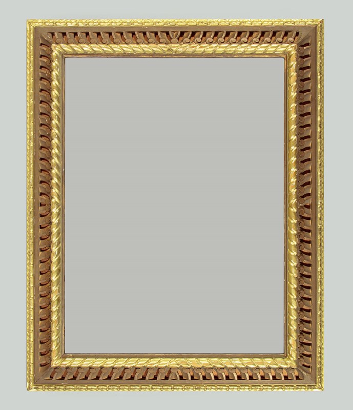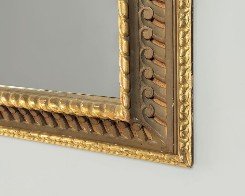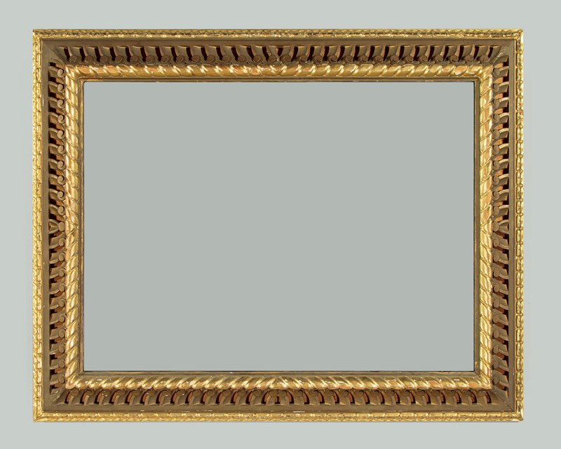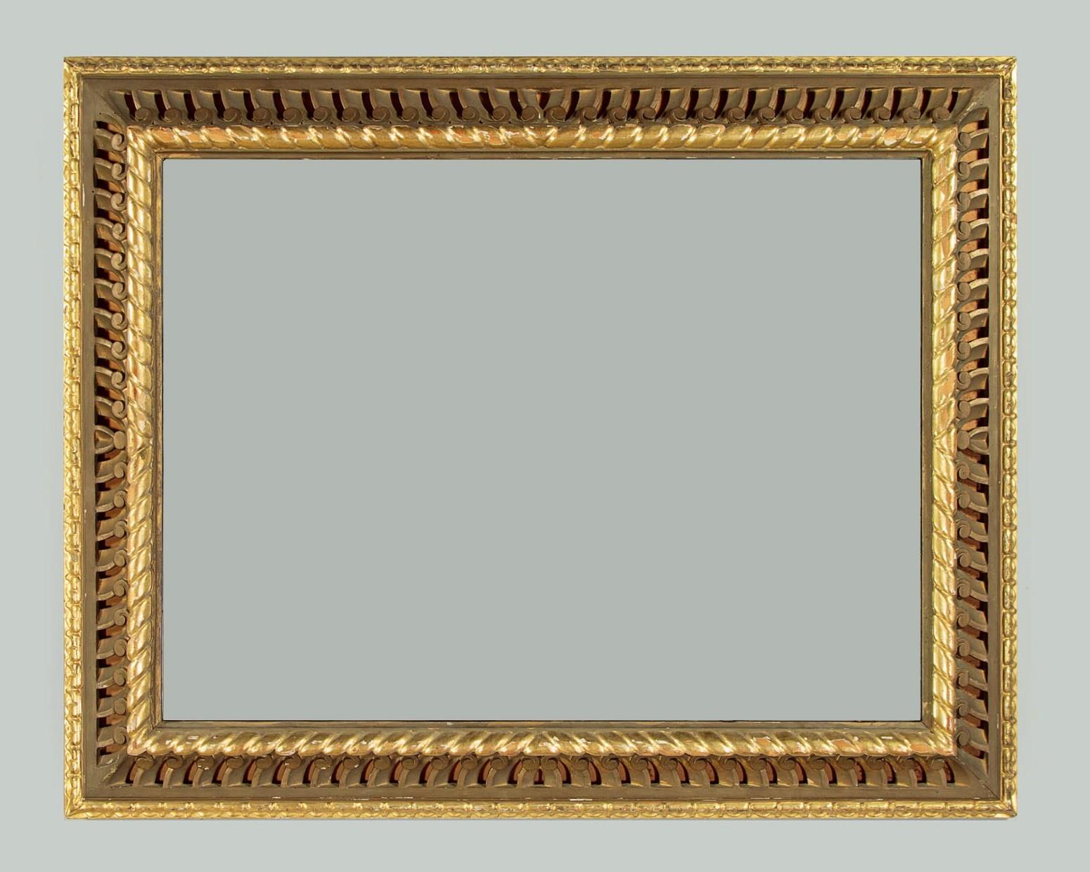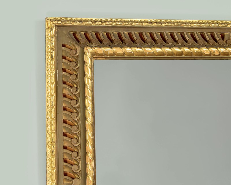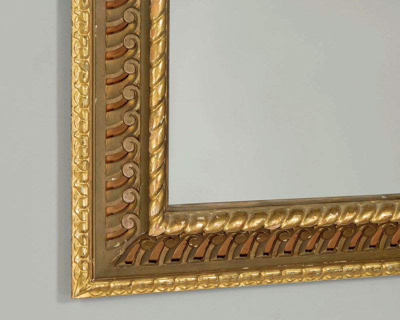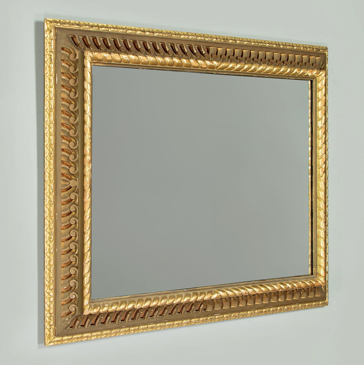Large carved and gilded cushion frame wall mirror. 35" x 26" mirror plate within a carved and pierced cushion frame of scrolling forms between two bands of gilding. Obvious wear to the gilding on the rope twist inner moulding where it is missing in large portions exposing the wood below. Otherwise good condition, fitted with a new mirror plate. Could be hung either landscape or portrait aspect.