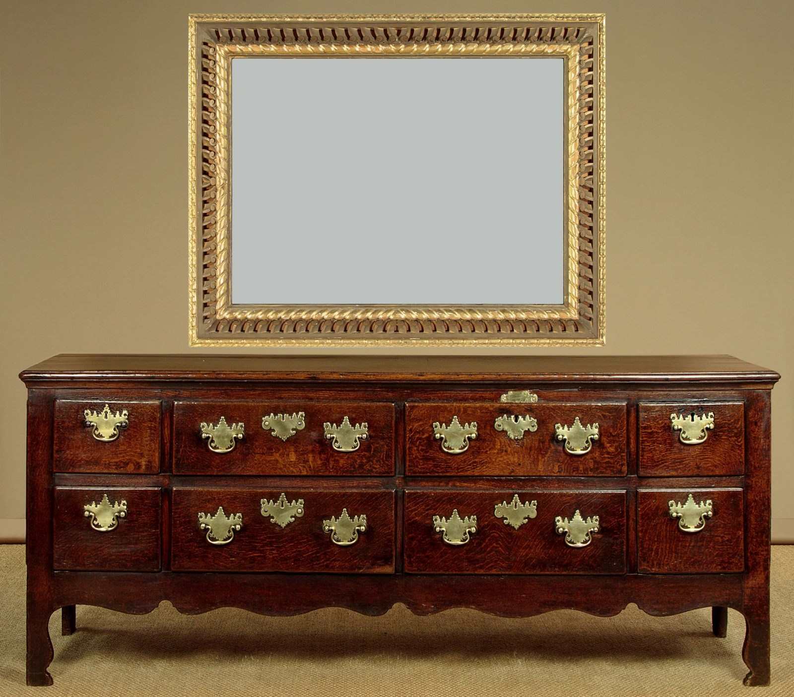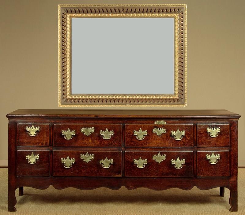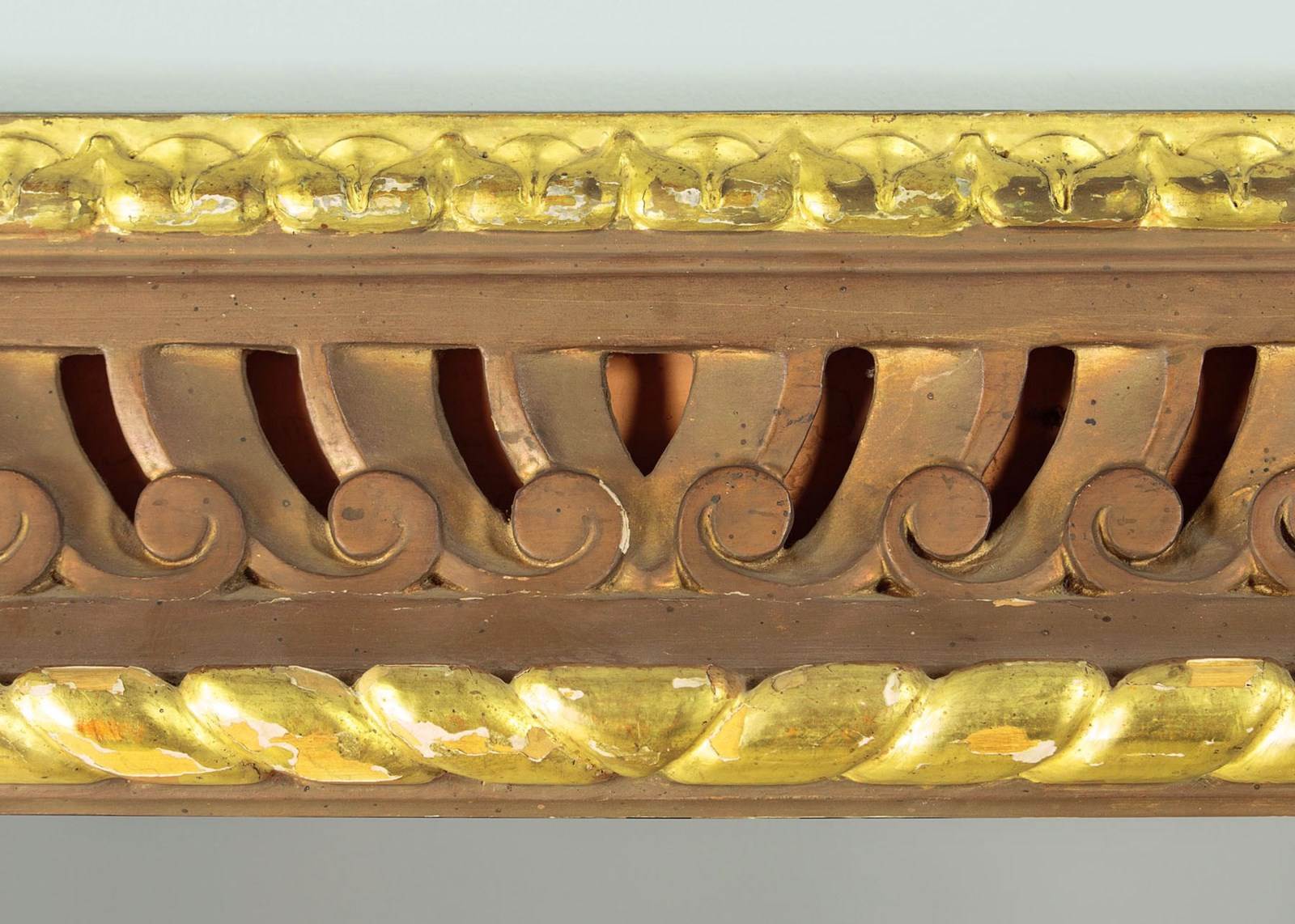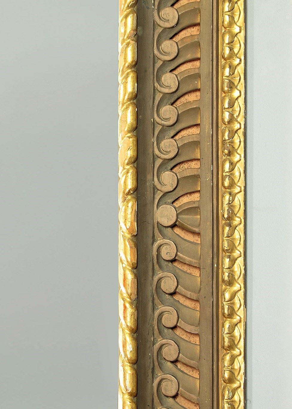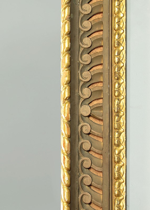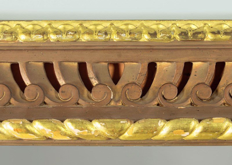 Large carved and gilded cushion frame wall mirror. 35" x 26" mirror plate within a carved and pierced cushion frame of scrolling forms between two bands of gilding. Obvious wear to the gilding on the rope twist inner moulding where it is missing in large portions exposing the wood below. Otherwise good condition, fitted with a new mirror plate. Could be hung either landscape or portrait aspect.