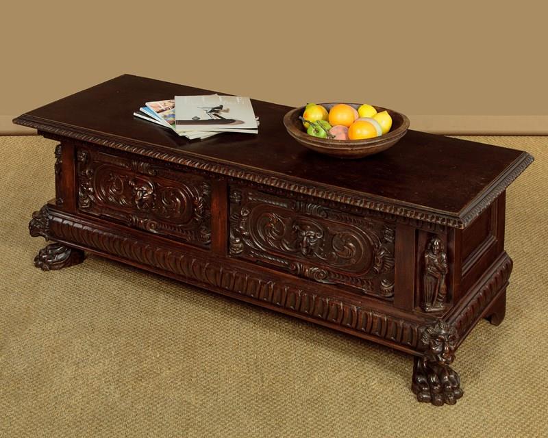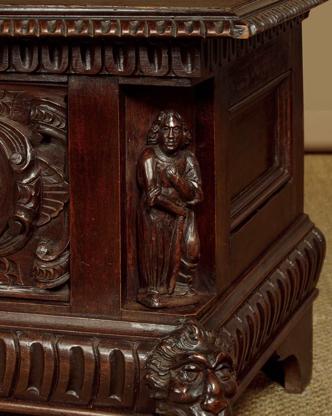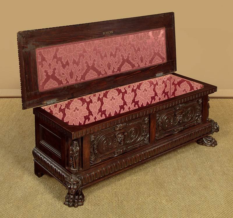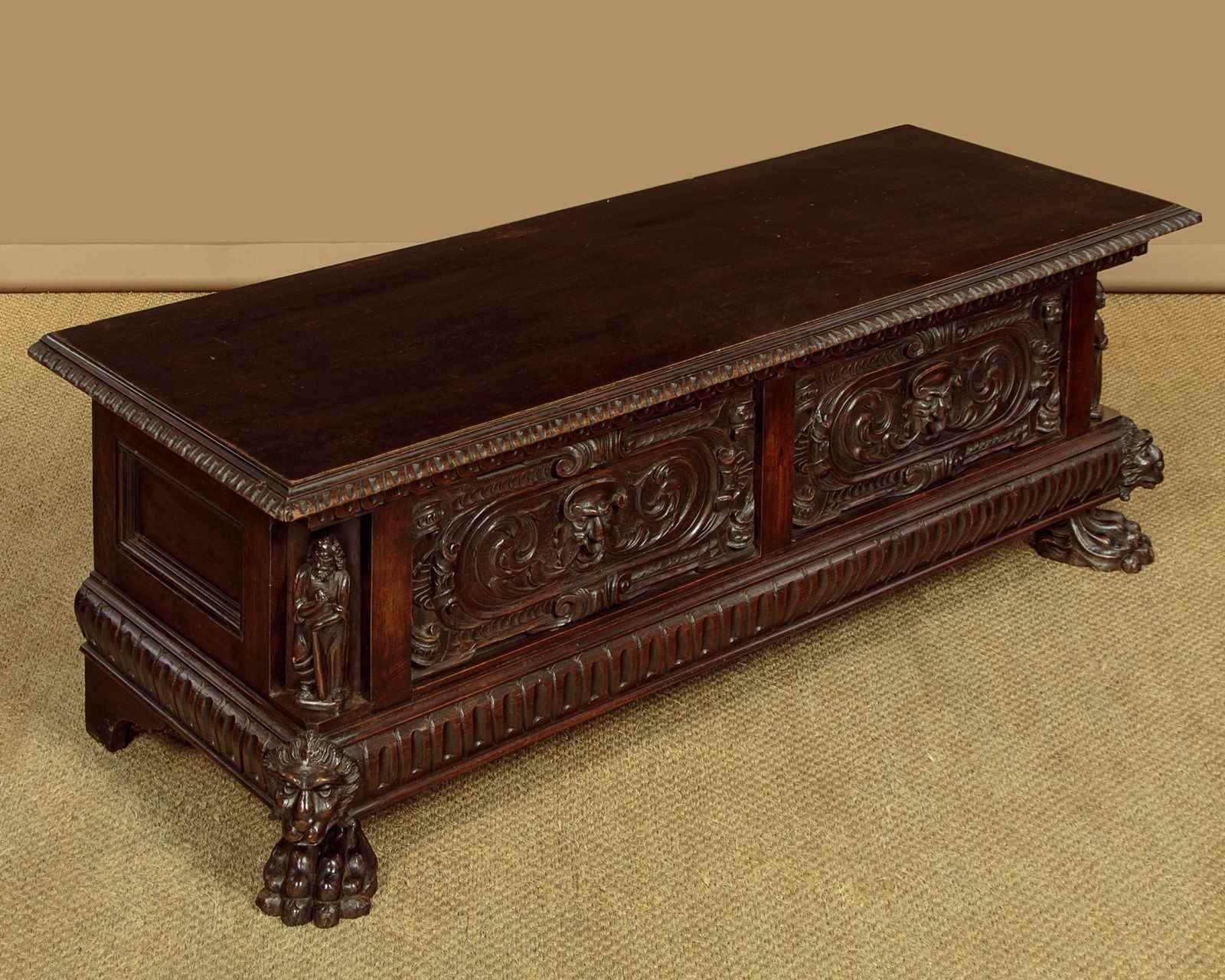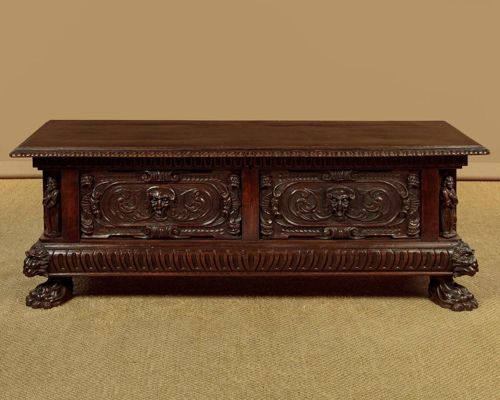 Good looking Renaissance revival carved oak chest or cassone c.1890. Useful flat (rather than panelled) top with a carved and moulded edge, lifting to reveal a silk damask lined interior (internal height 13"). Superb 16th.c. style carved exterior, with grotesque masks and acanthus detail within scrolling cartouches to the panels and flanked with full length male and female carved figures at the corners. Gadroon carved mouldings top and bottom. Lions masks to the front corners of the plinth over large carved claw feet. Very good condition, cleaned and waxed in our workshops.