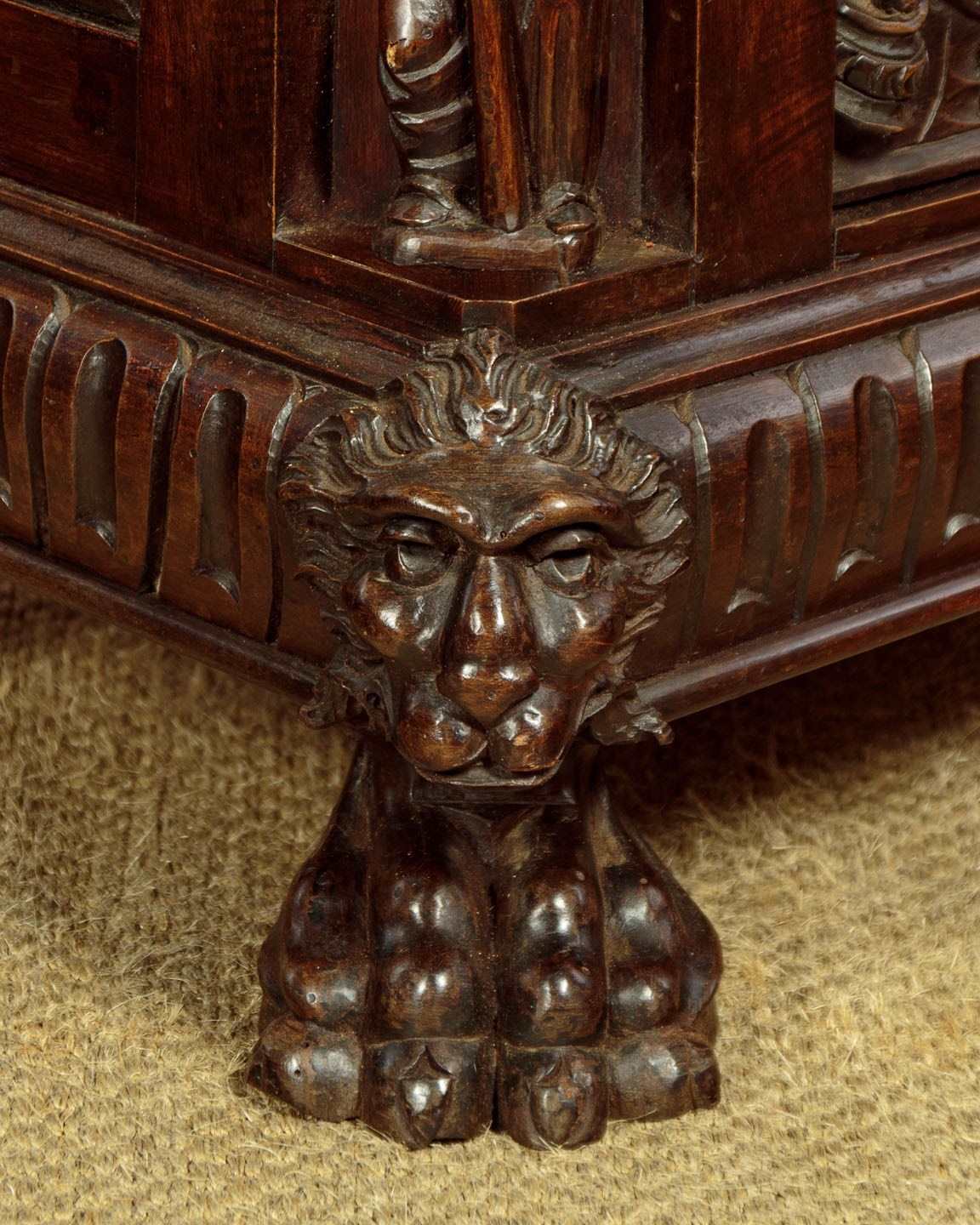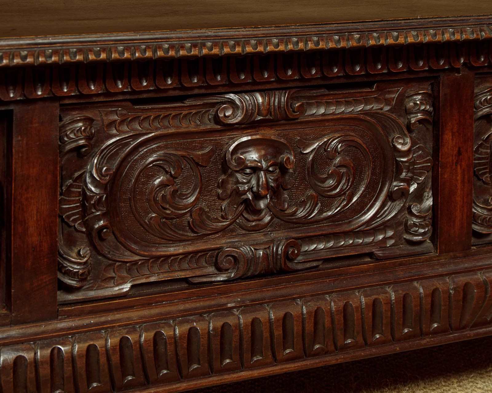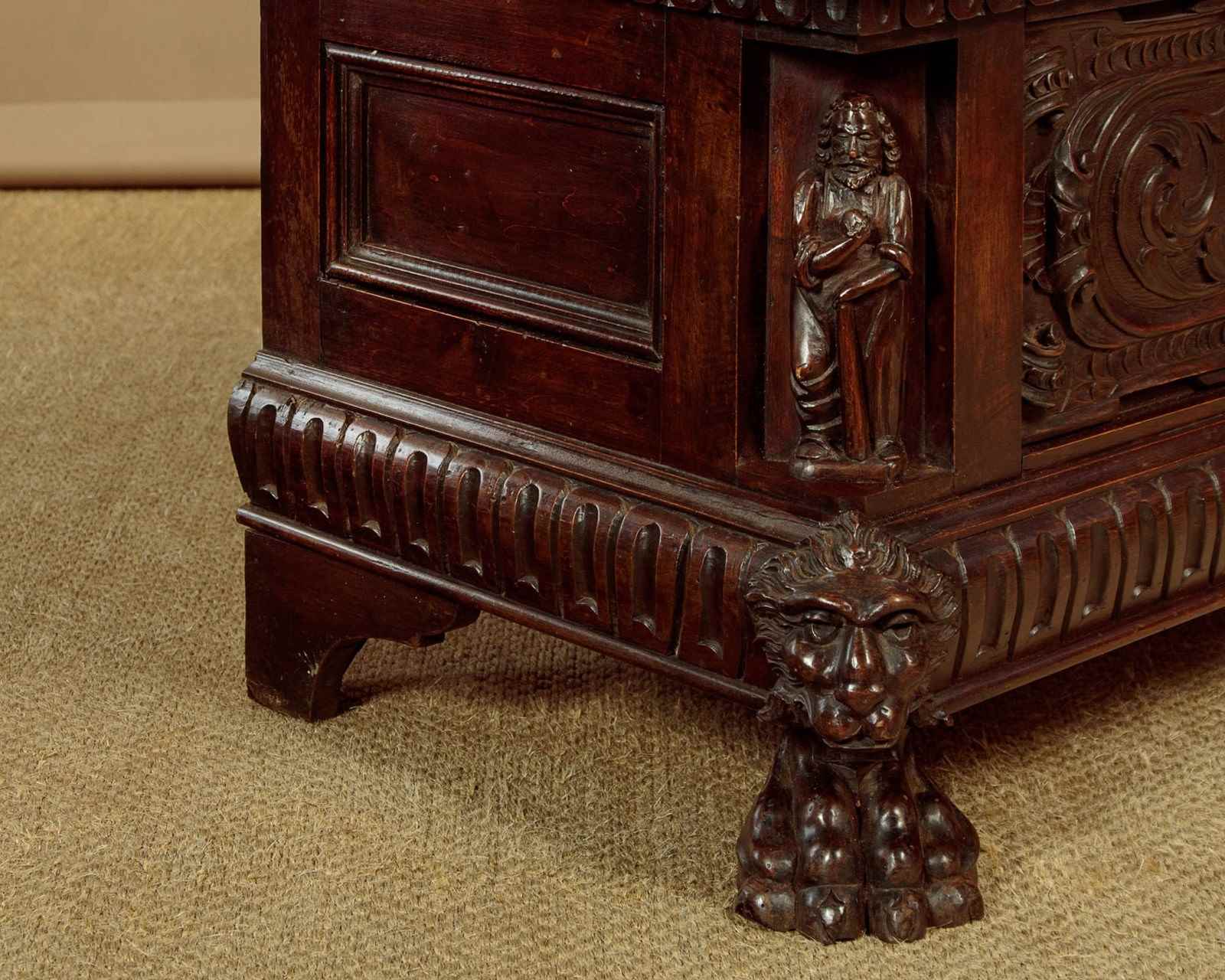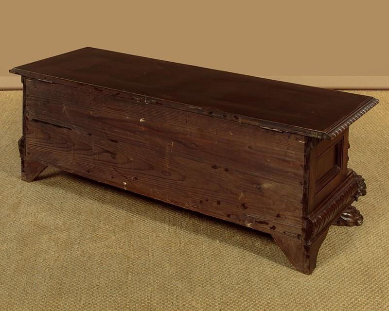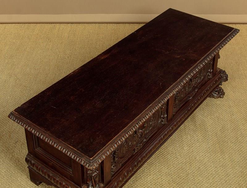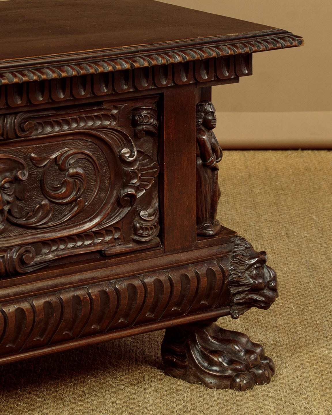 Good looking Renaissance revival carved oak chest or cassone c.1890. Useful flat (rather than panelled) top with a carved and moulded edge, lifting to reveal a silk damask lined interior (internal height 13"). Superb 16th.c. style carved exterior, with grotesque masks and acanthus detail within scrolling cartouches to the panels and flanked with full length male and female carved figures at the corners. Gadroon carved mouldings top and bottom. Lions masks to the front corners of the plinth over large carved claw feet. Very good condition, cleaned and waxed in our workshops.