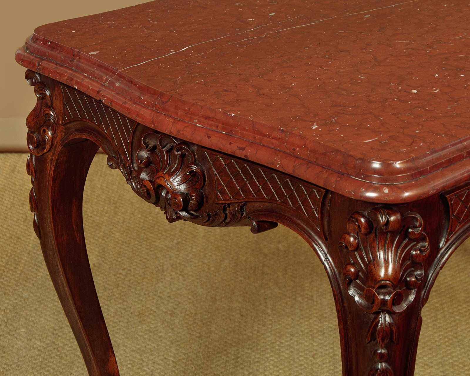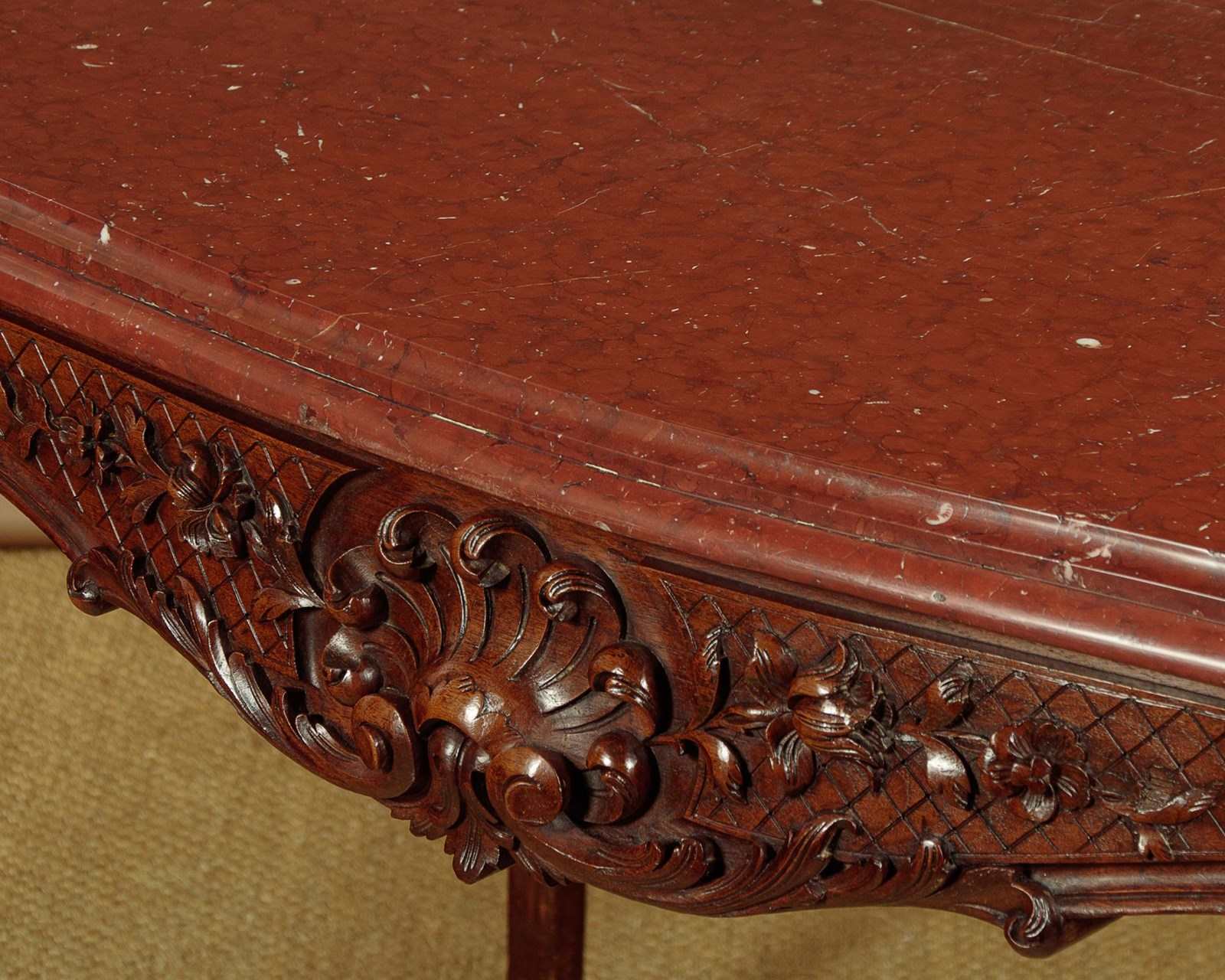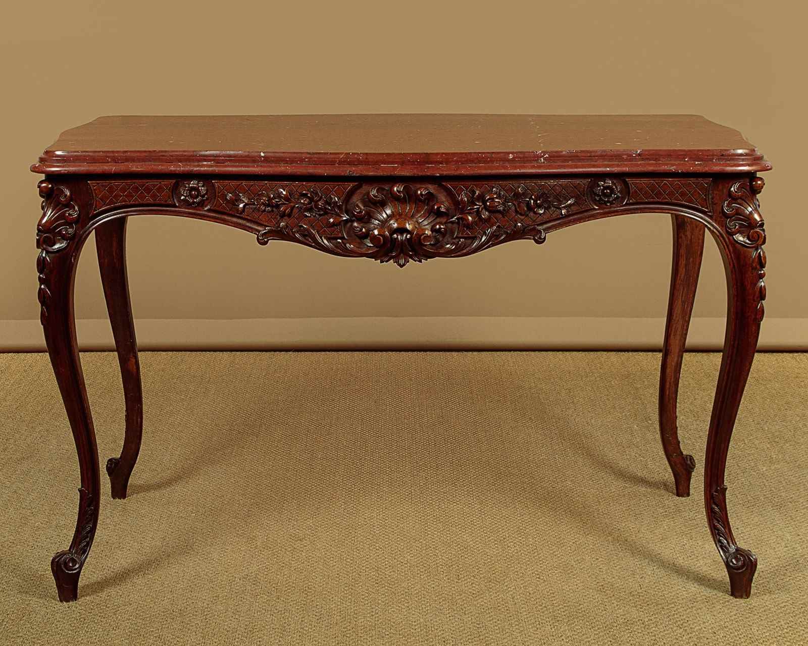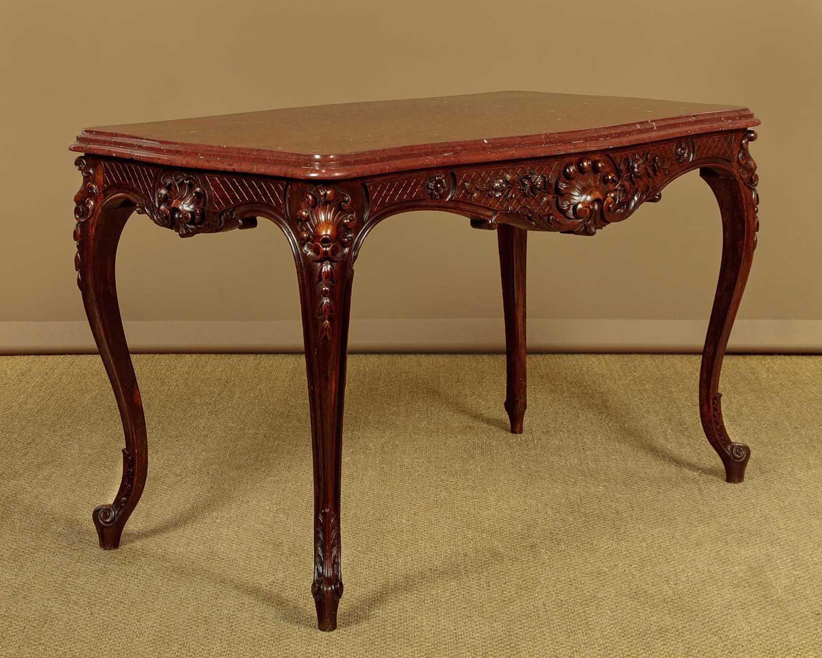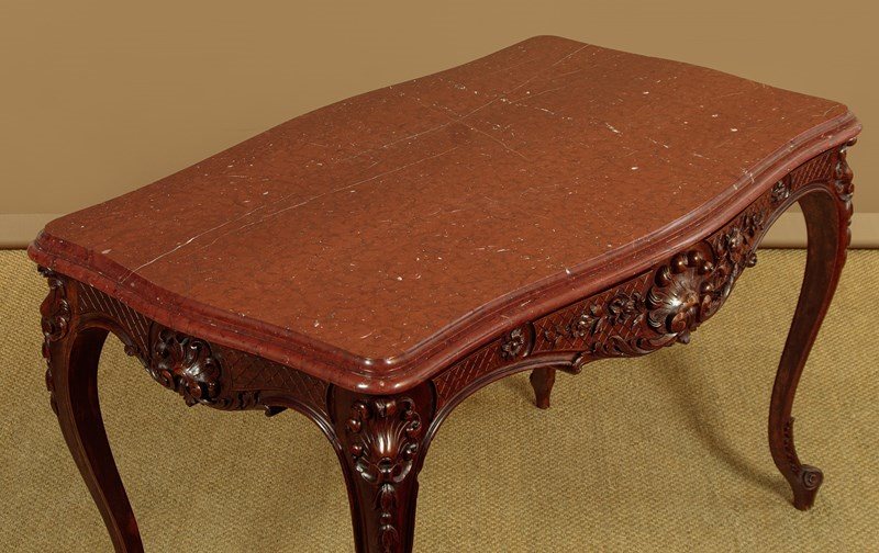 Splendid late 19th.c. French carved walnut and marble top centre table c.1890. 1½" thick rouge griotte marble top with a deep moulded and serpentine shaped edge. On a conforming base in solid walnut with crisply carved scallop, flower and foliate detail to the apron on each side. Curving cabriole legs with further carving to the knees and feet. Crossed stretchers below the marble for extra strength. Excellent colour and condition, cleaned and waxed in our workshops.