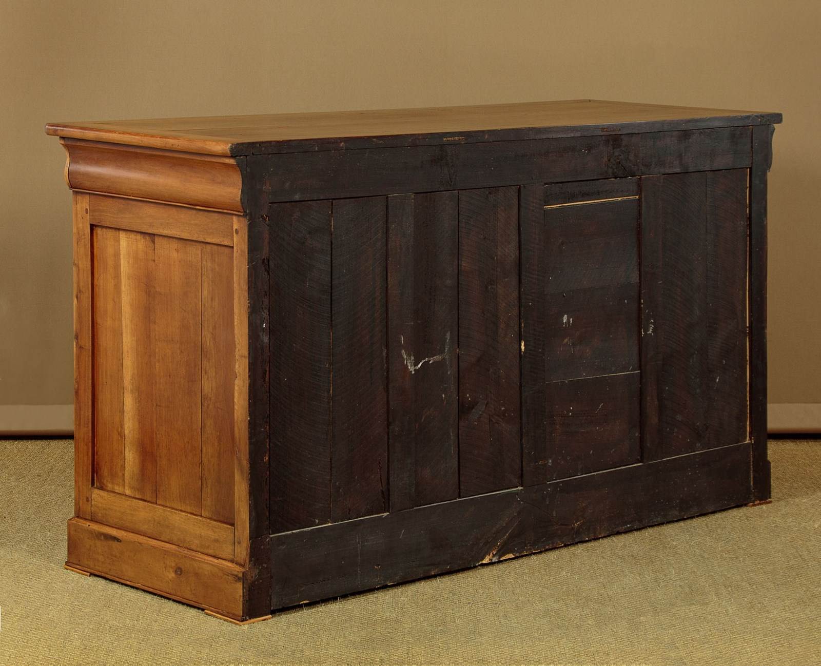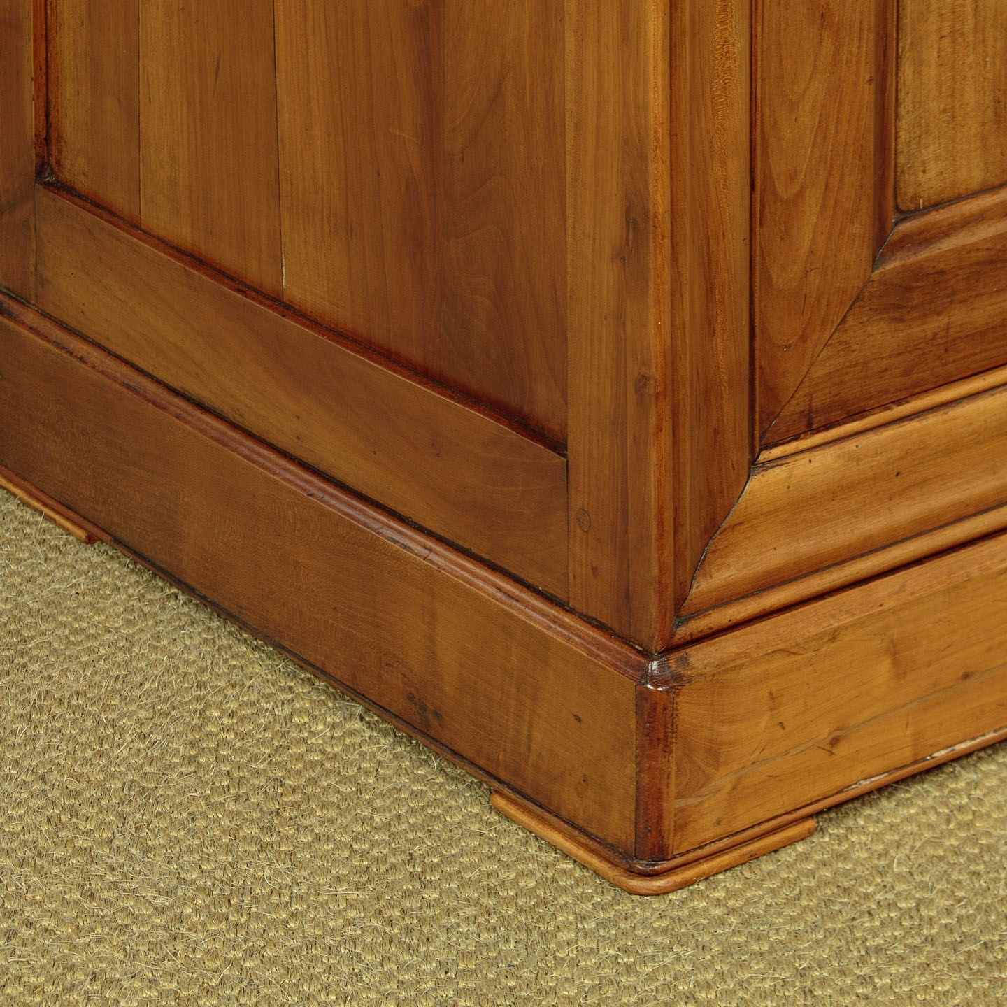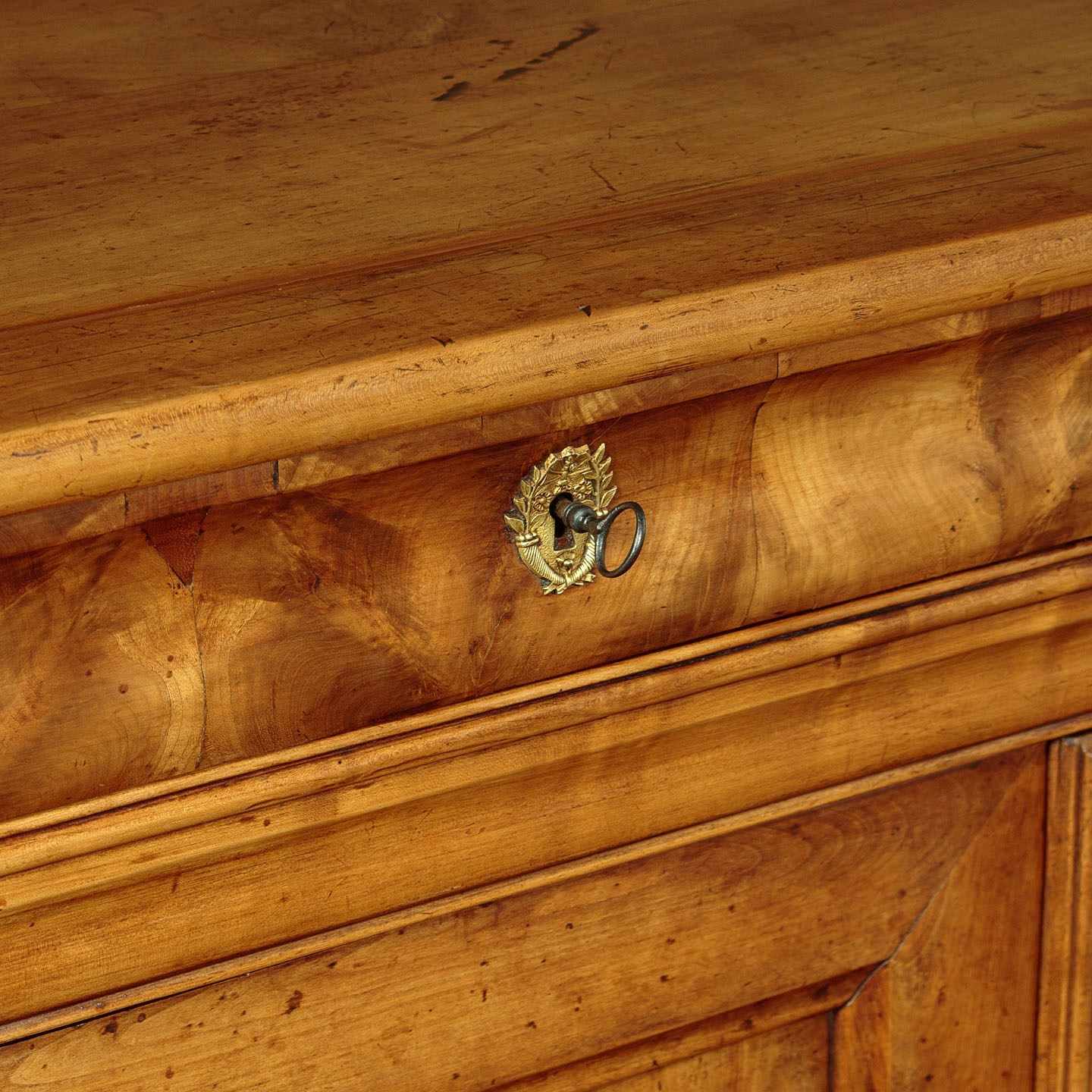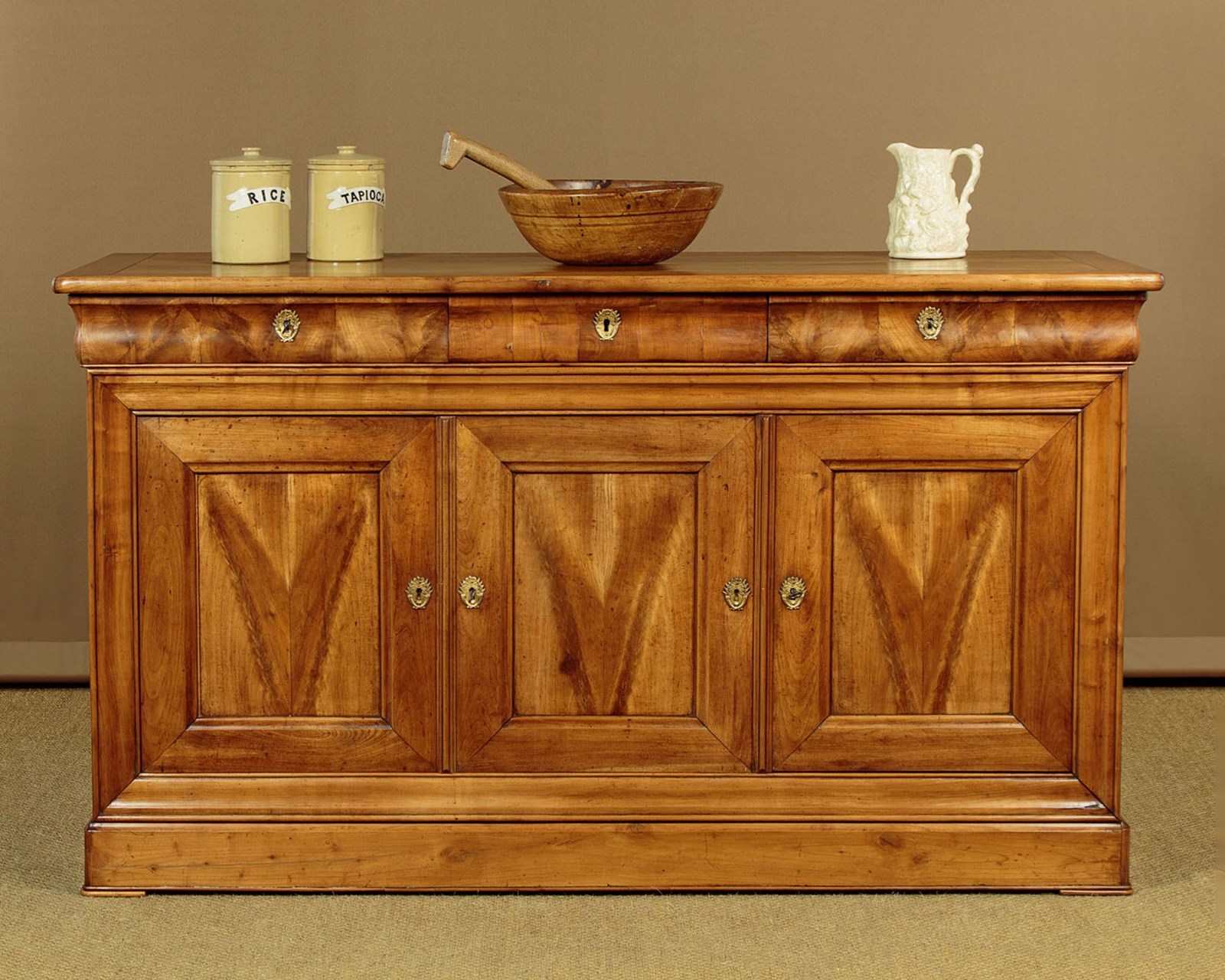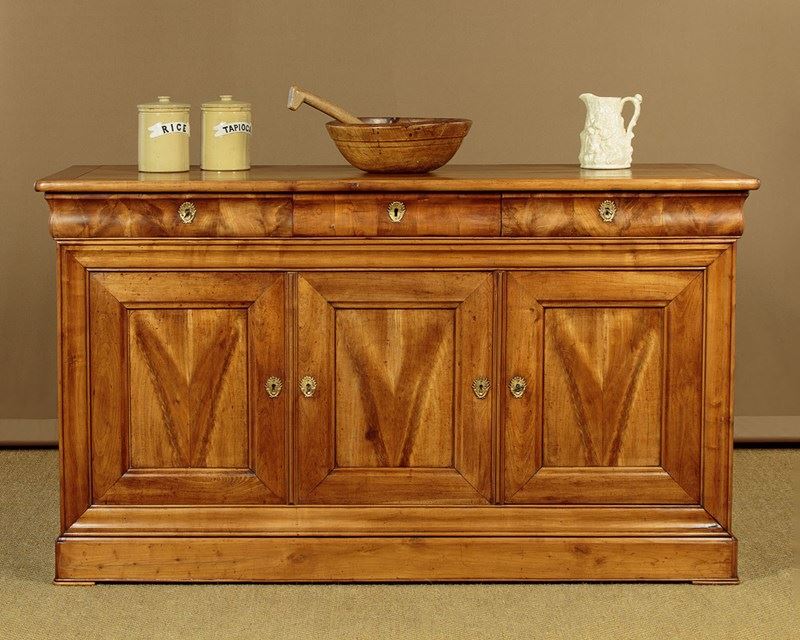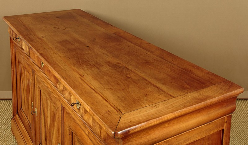 Superb mid 19th.c. French cherrywood dresser base or sideboard c.1840. Solid cherrywood top with cleated ends. Over three drawers and a three door cupboard fitted with a single long shelf inside (internal depth 20"). A lovely example of the form with shaped drawer fronts (continued on the sides of the cabinet) faced in highly figured cherry veneers. Note also the matching bookleaf veneers to the door panels and the original gilded brass escutcheons. Ogee moulded surround around the doors and a moulded plinth on slim pad feet. Excellent colour and condition, restored cleaned and waxed in our workshops. Keys supplied.