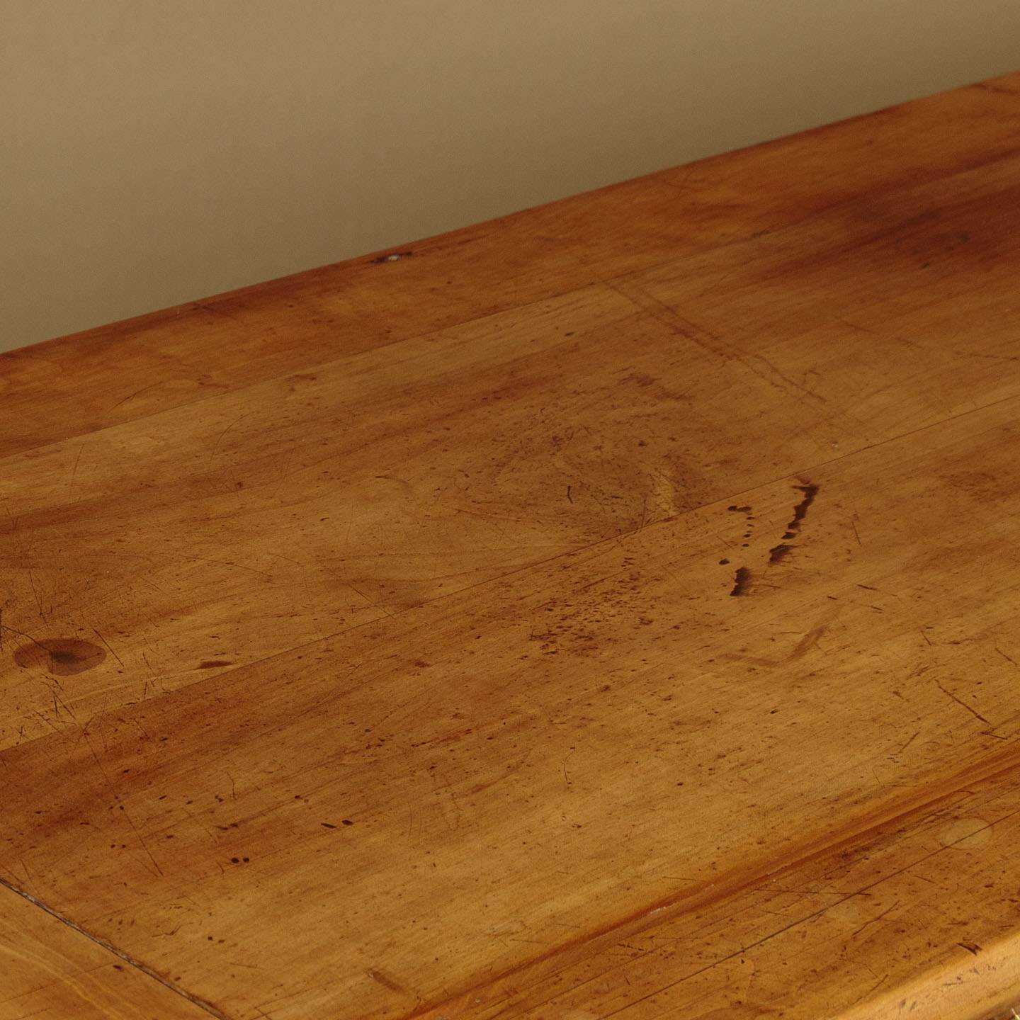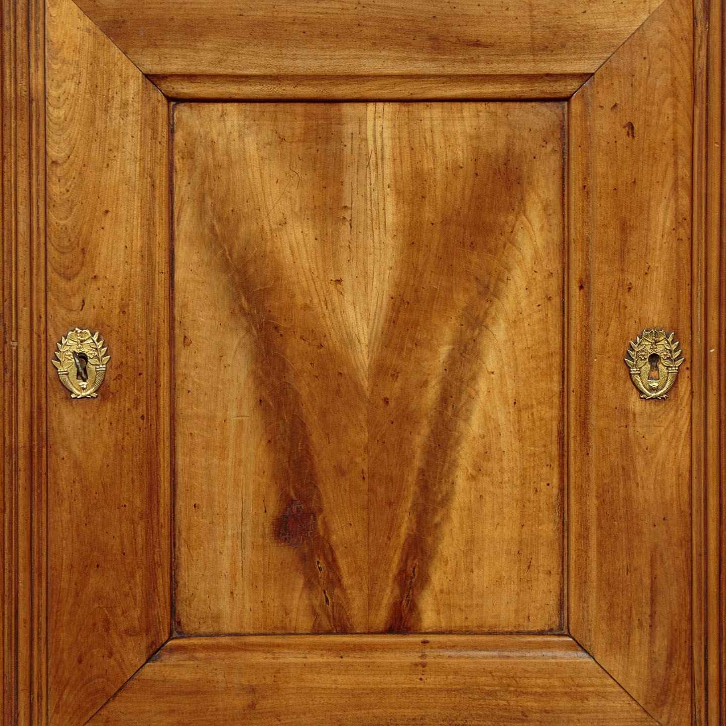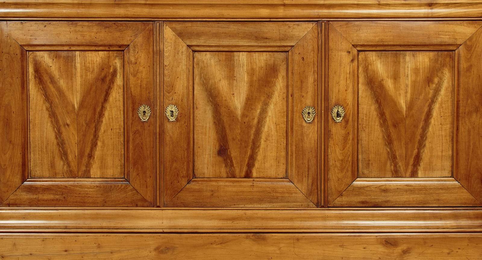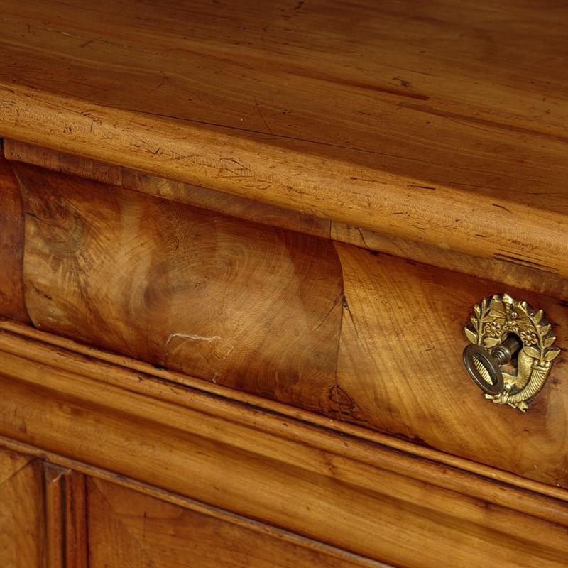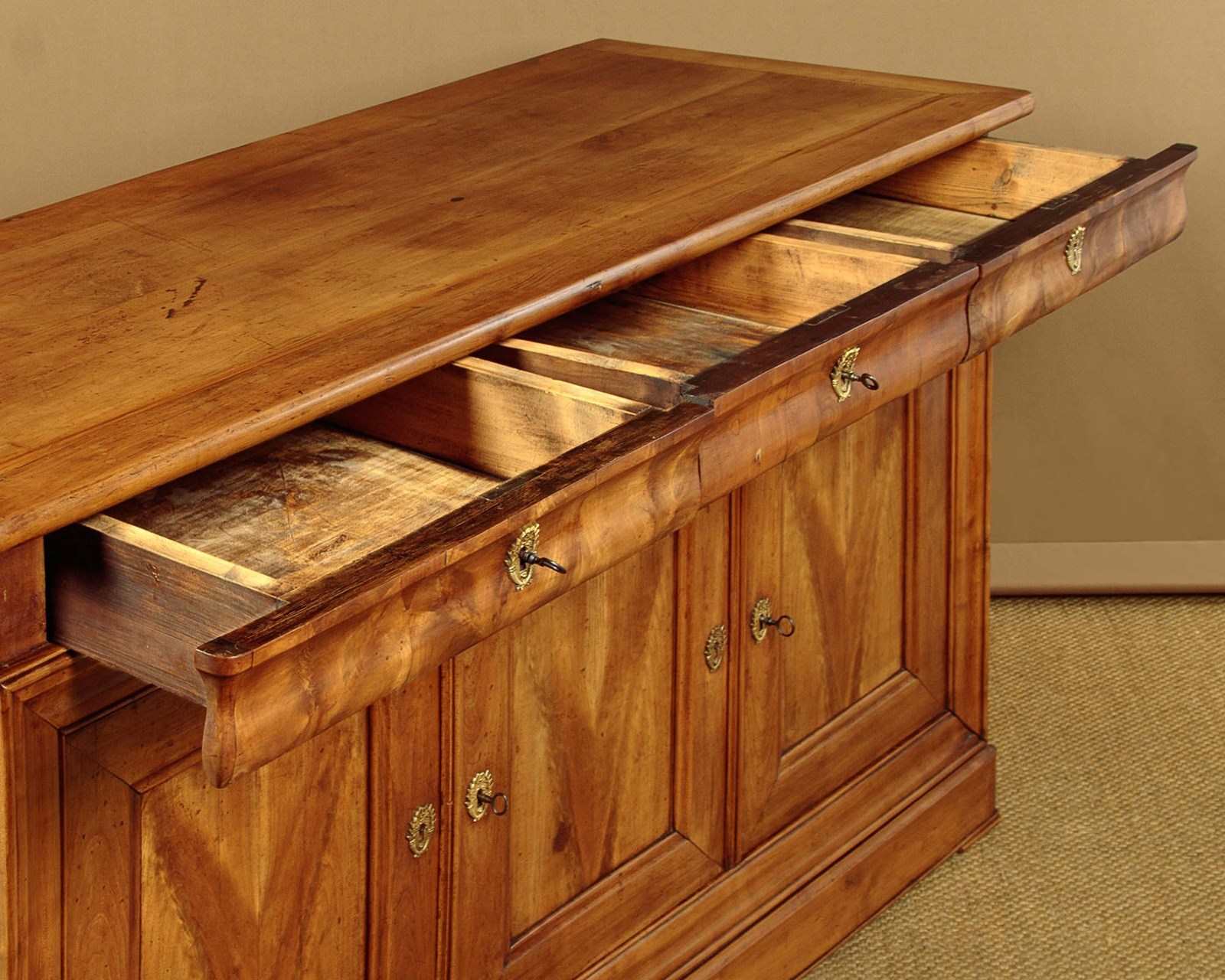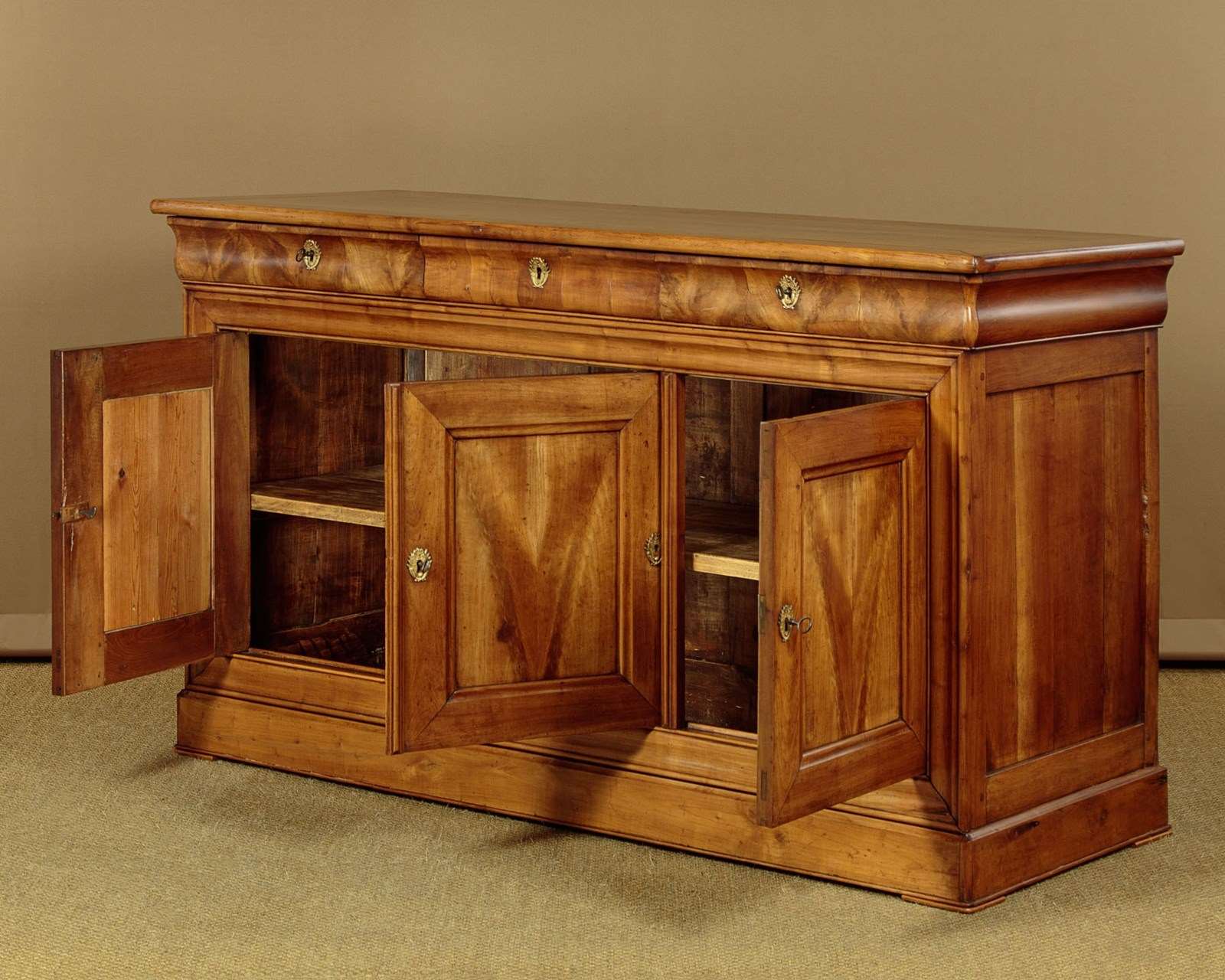 Superb mid 19th.c. French cherrywood dresser base or sideboard c.1840. Solid cherrywood top with cleated ends. Over three drawers and a three door cupboard fitted with a single long shelf inside (internal depth 20"). A lovely example of the form with shaped drawer fronts (continued on the sides of the cabinet) faced in highly figured cherry veneers. Note also the matching bookleaf veneers to the door panels and the original gilded brass escutcheons. Ogee moulded surround around the doors and a moulded plinth on slim pad feet. Excellent colour and condition, restored cleaned and waxed in our workshops. Keys supplied.