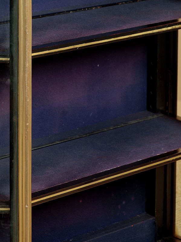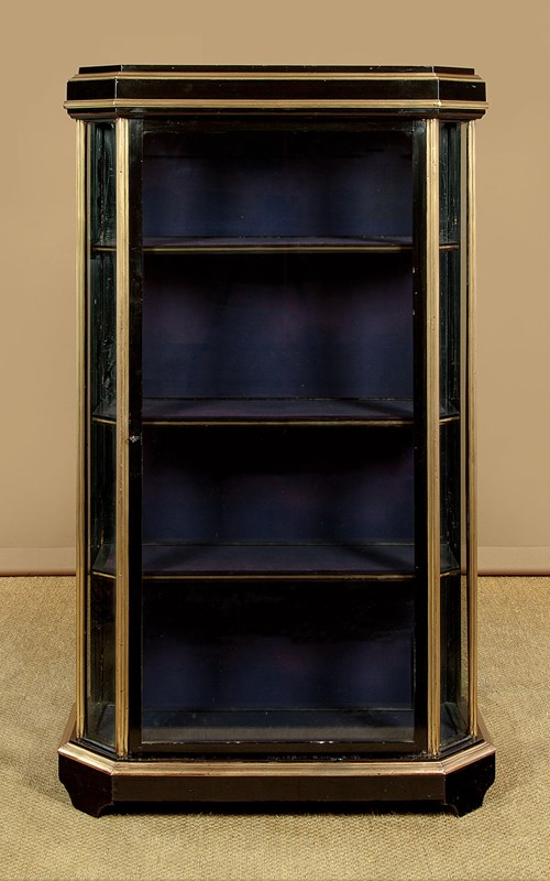 Very smart ebonised and brass mounted vitrine or display cabinet c.1920. Single door cabinet fitted with three shelves inside (internal depth 10½") and lined in dark blue baize. Canted corners and sides also glazed. Ebonised hardwood frame with extensive brass mouldings to dramatic effect. Note the brass inlay to the front edge of the shelves. Shaped detail to the feet at the front and sides. Some surface wear to the exterior and wear to the lining fabric. Generally very good condition, cleaned and waxed in our workshops. Key supplied.