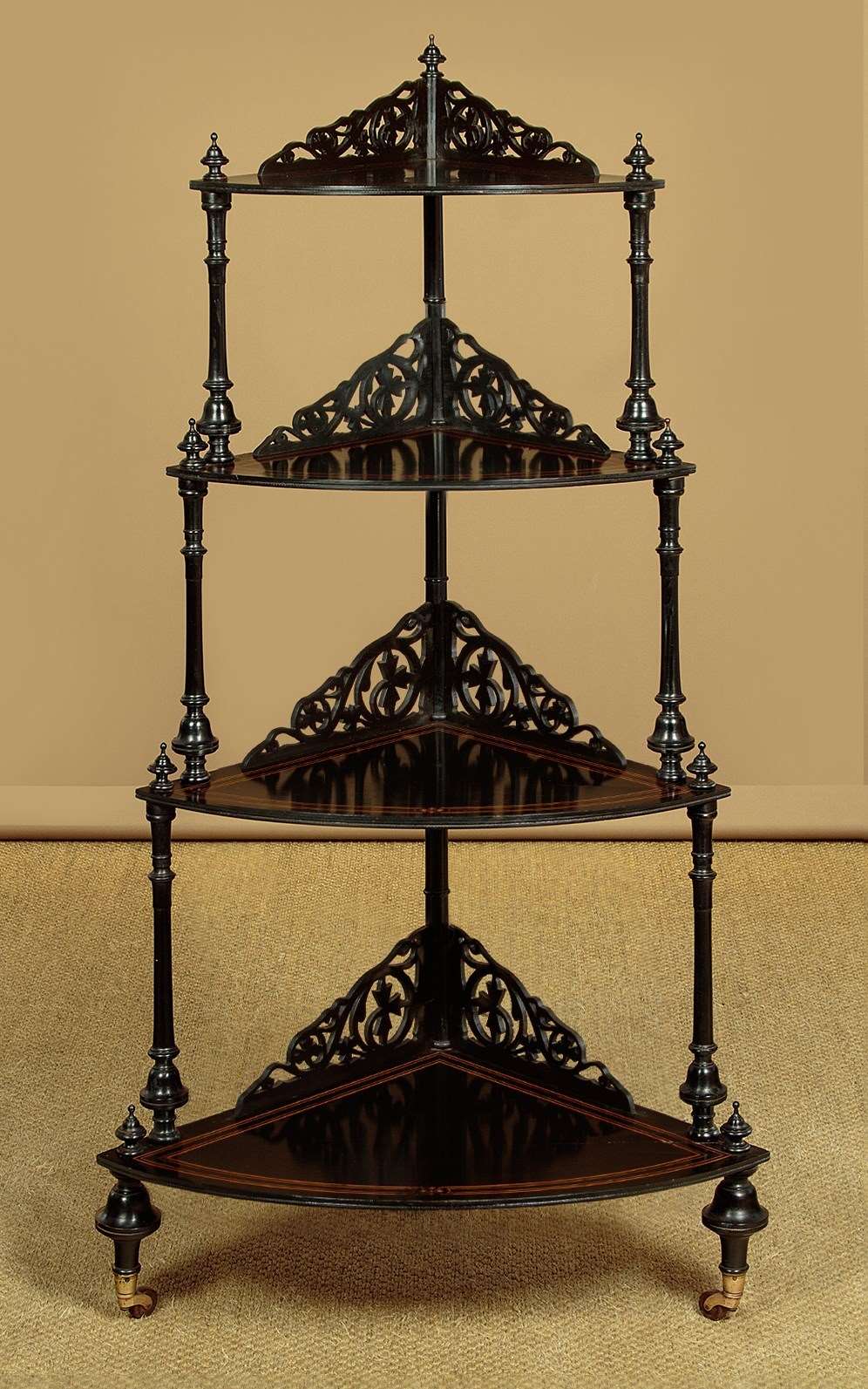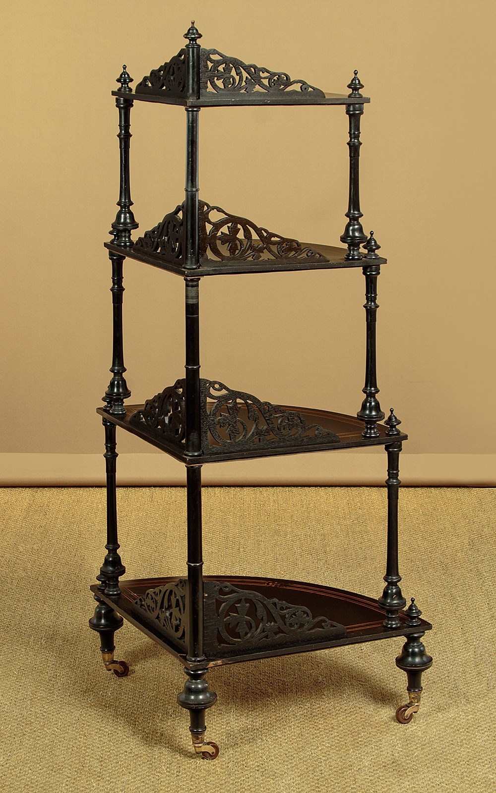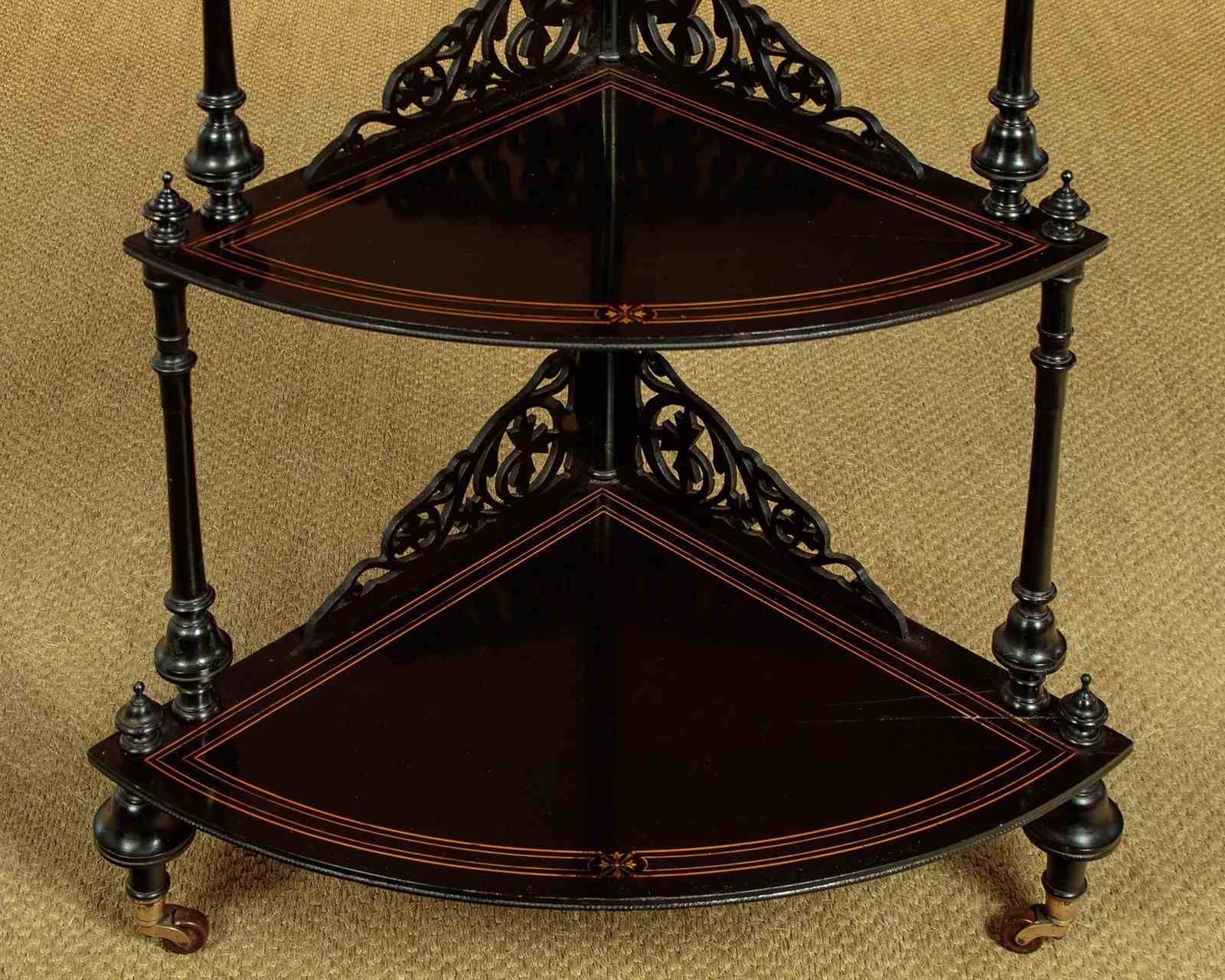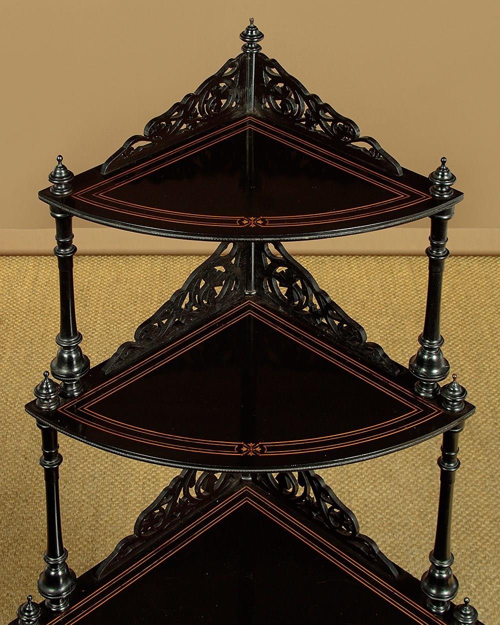Mid 19th.c. ebonised corner what-not c.1860. Four quarter-round shelves of graduated size and height. In ebonised hardwood with fine satinwood inlay and stringing. Elaborate pierced gallery to the back edge of each shelf. Turned column supports with turned finial tops. On bun feet with the original brass collared castors stamped J.C & S for the Birmingham manufacturers James Cartland & Sons. Repair to the right hand edge of the bottom shelf. Otherwise very good condition, restored cleaned and waxed in our workshops.