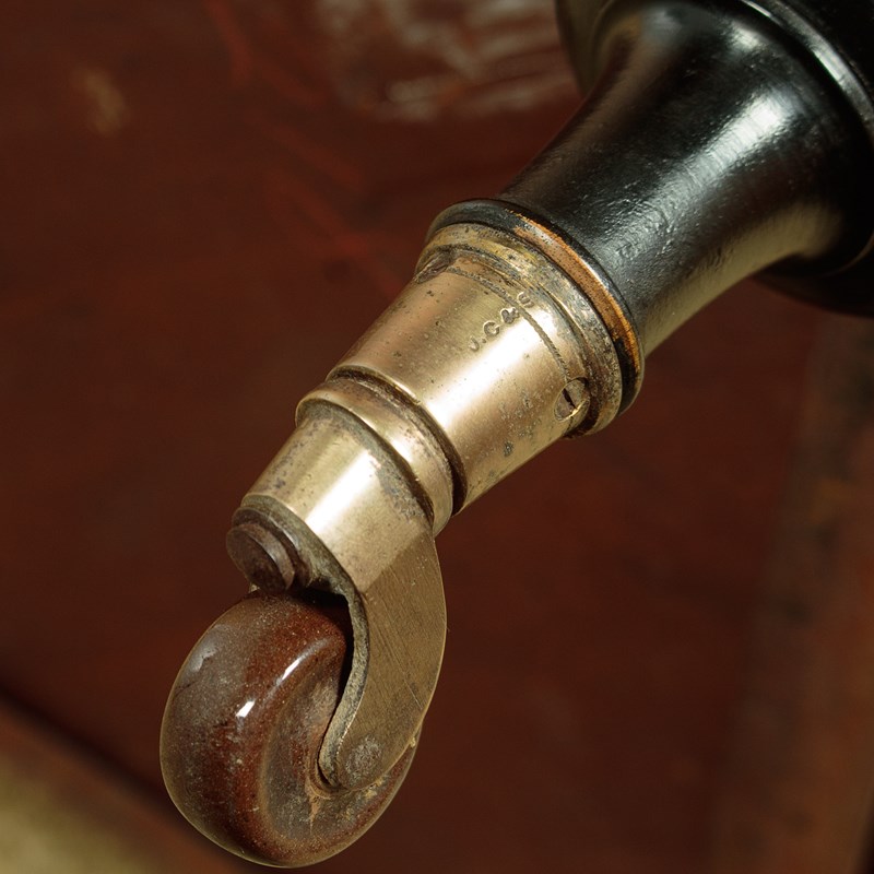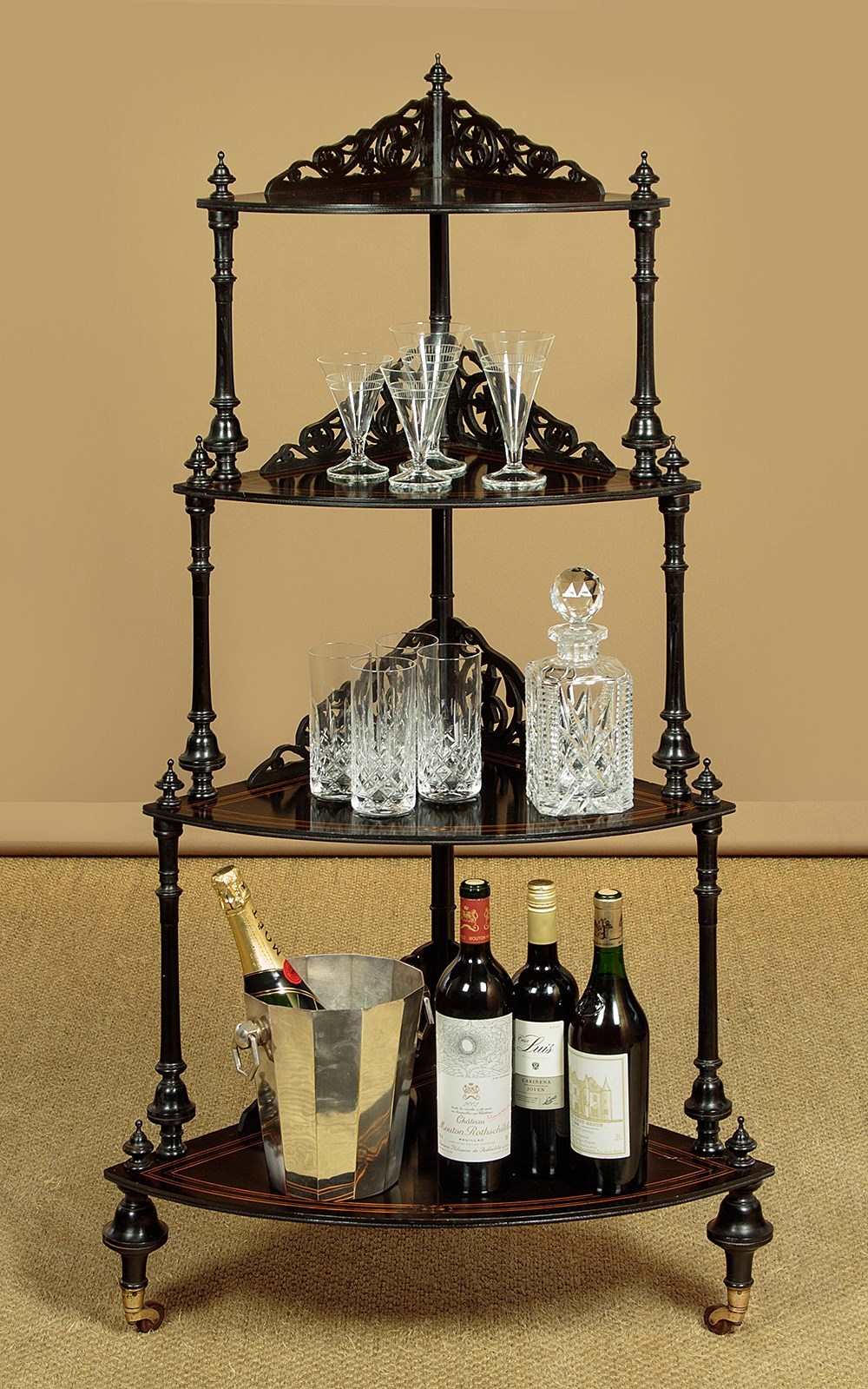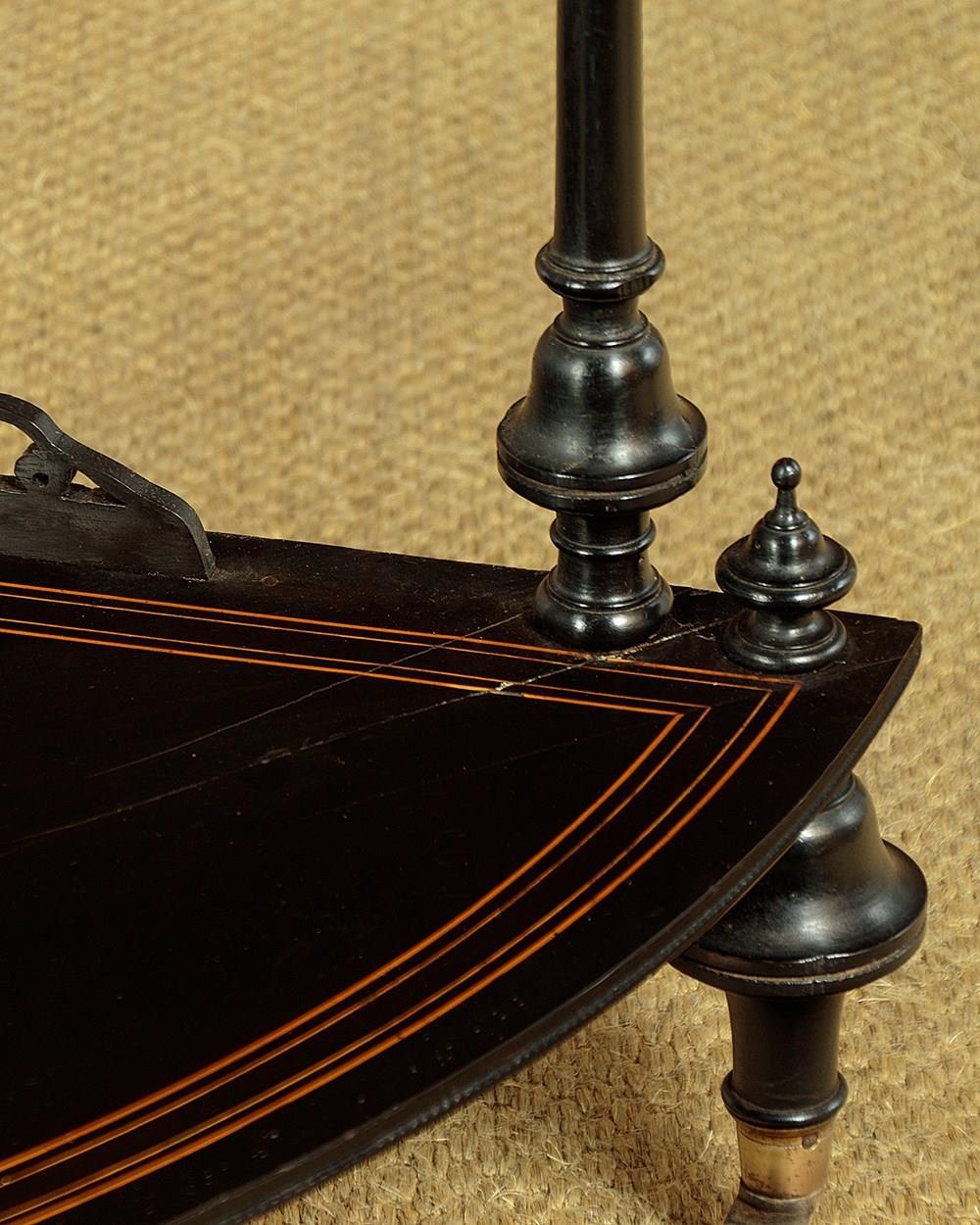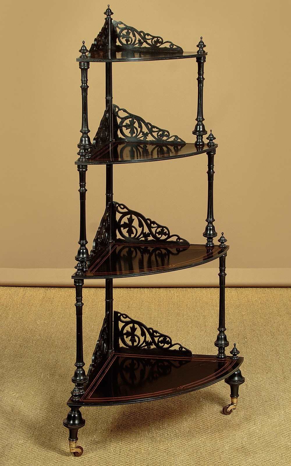 Mid 19th.c. ebonised corner what-not c.1860. Four quarter-round shelves of graduated size and height. In ebonised hardwood with fine satinwood inlay and stringing. Elaborate pierced gallery to the back edge of each shelf. Turned column supports with turned finial tops. On bun feet with the original brass collared castors stamped J.C & S for the Birmingham manufacturers James Cartland & Sons. Repair to the right hand edge of the bottom shelf. Otherwise very good condition, restored cleaned and waxed in our workshops.