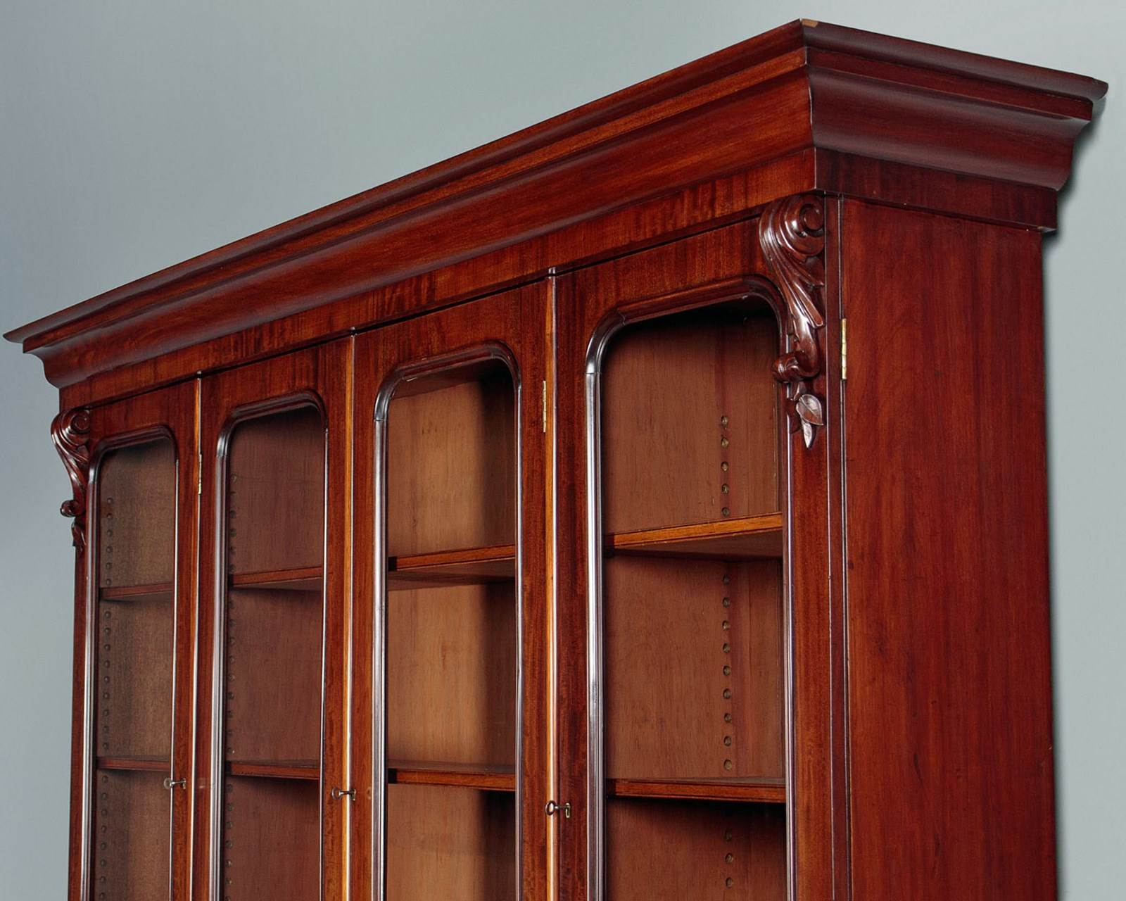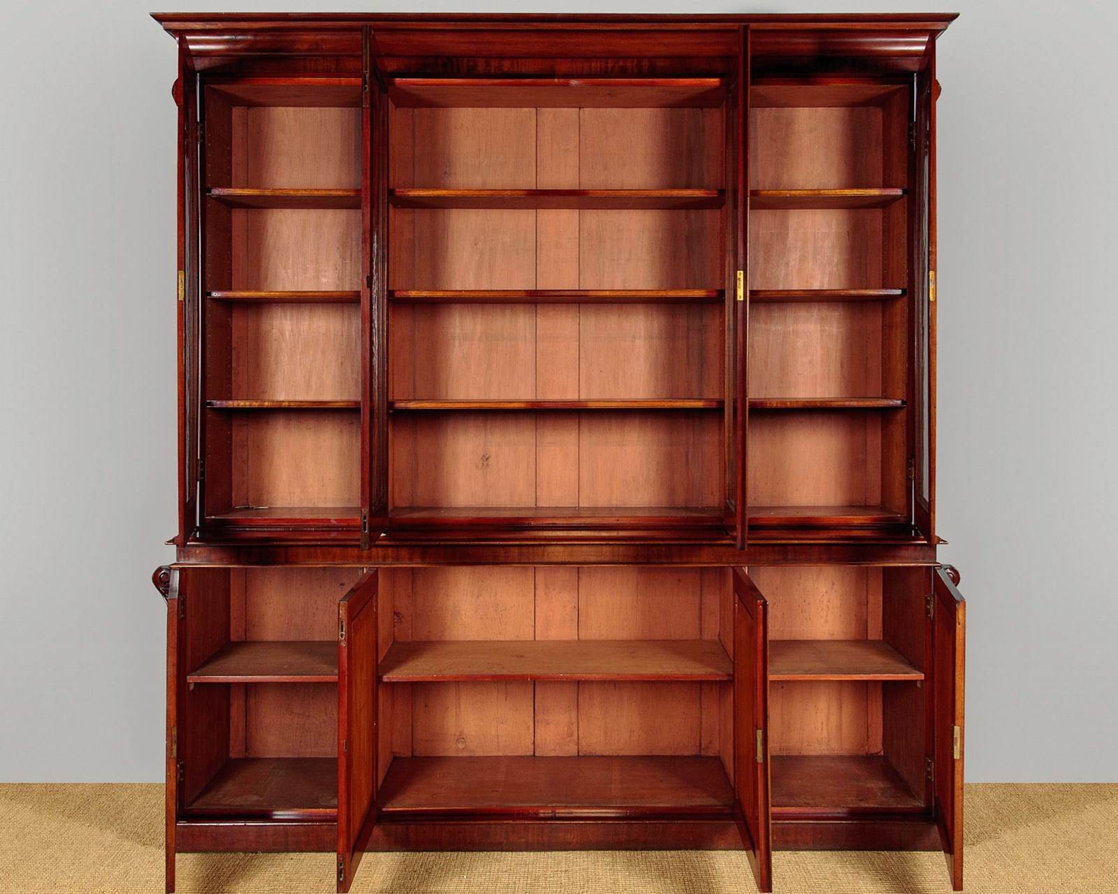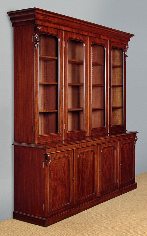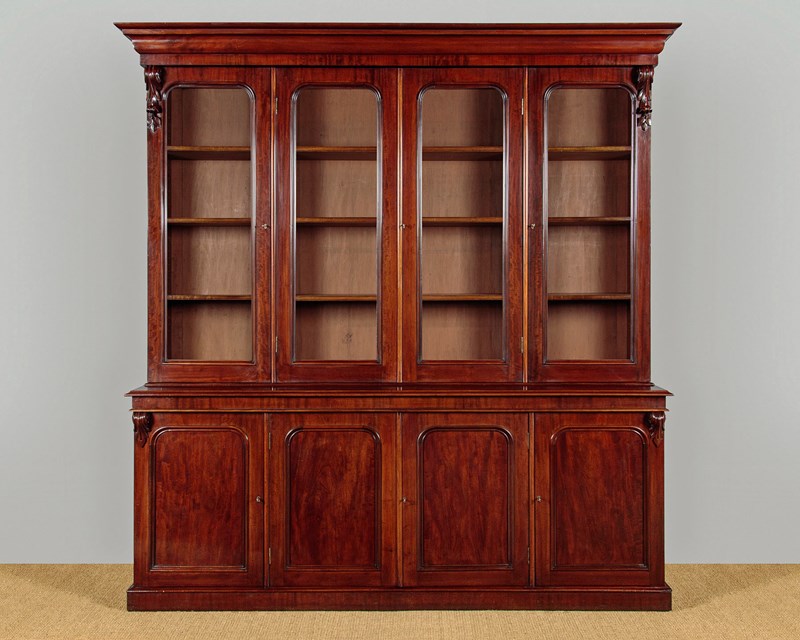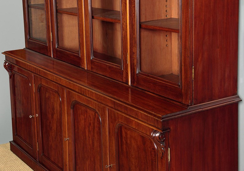 Large four door mahogany library bookcase c.1870. Glazed bookcase top fitted with three adjustable shelves to each section (internal depth 10¾"). Over a deeper base with blind panel doors and a single shelf inside (depth 17"). Simple uncluttered design with a deep ogee moulded cornice and carved corbels top and bottom, rounded upper corners to the door panels, set within moulded surrounds. Raised on a crossbanded plinth. Solid mahogany sides and groundwork to the doors. Excellent colour and condition, cleaned and waxed in our workshops. Keys supplied.