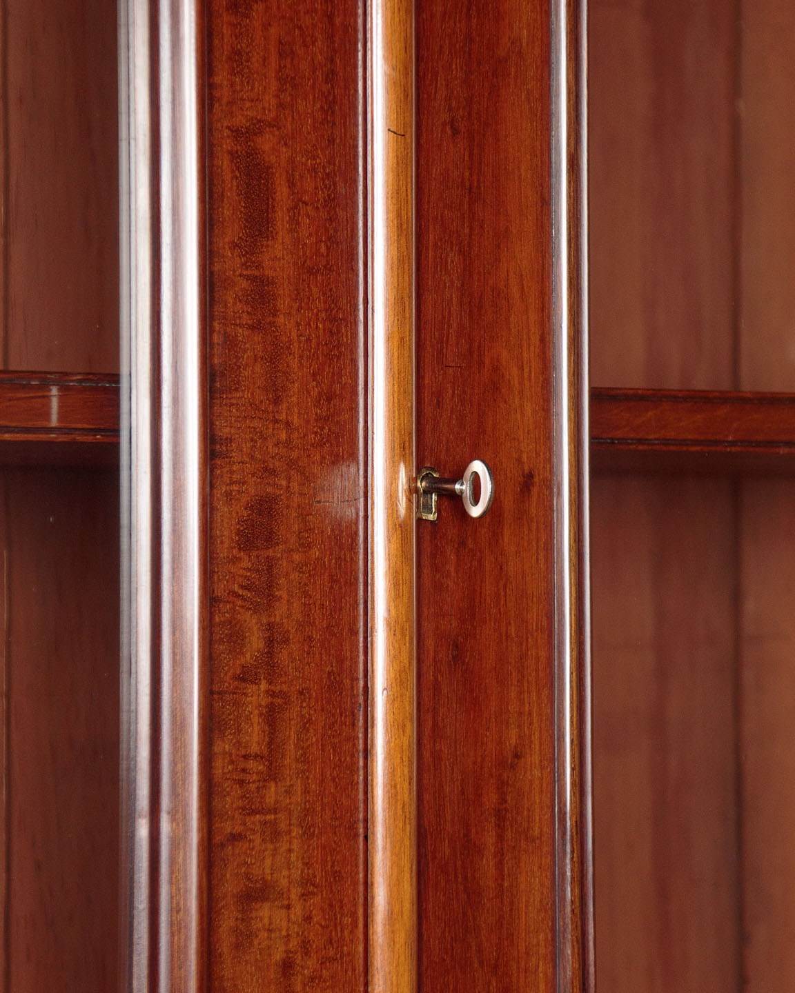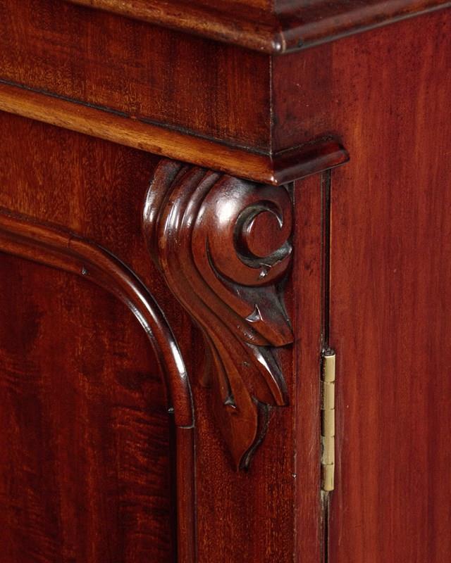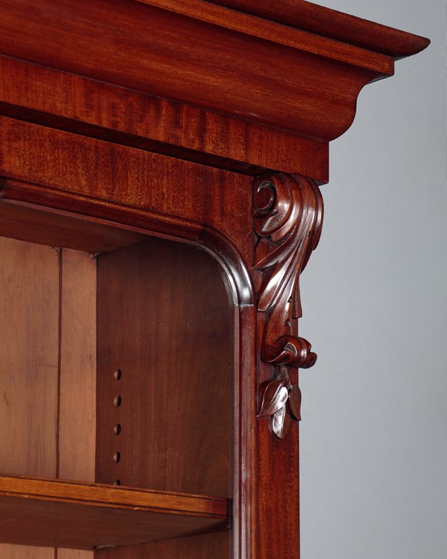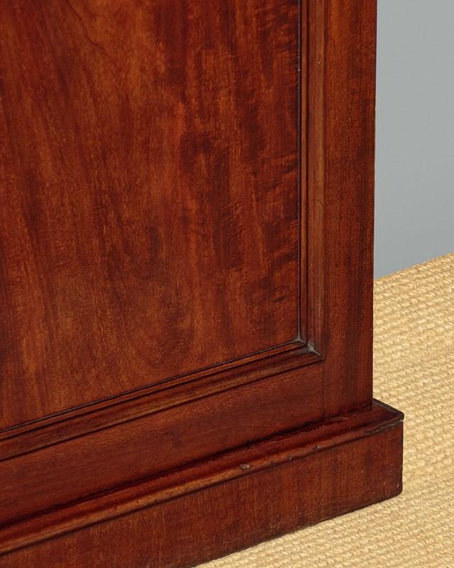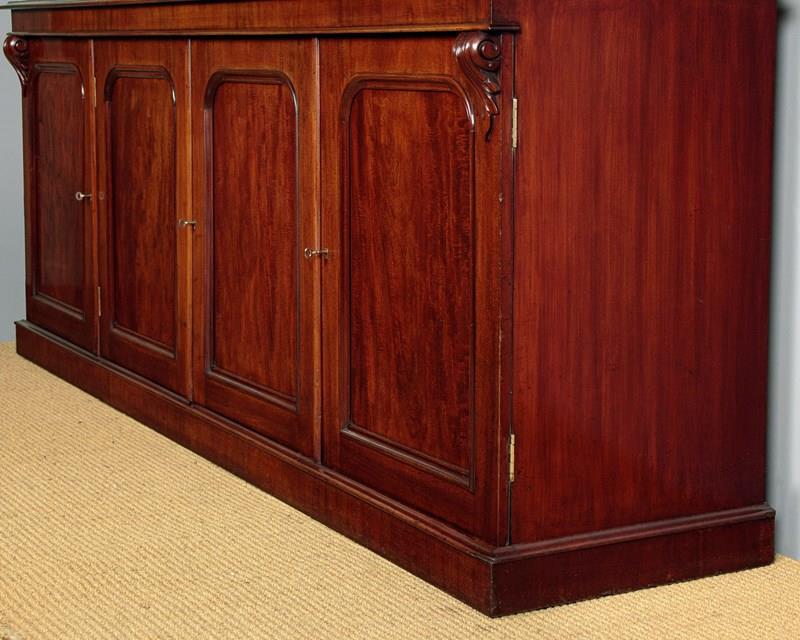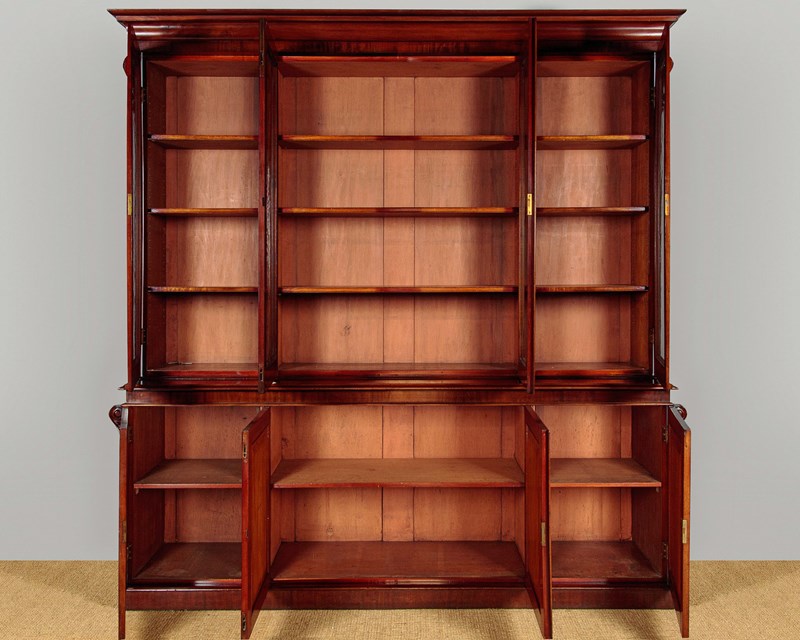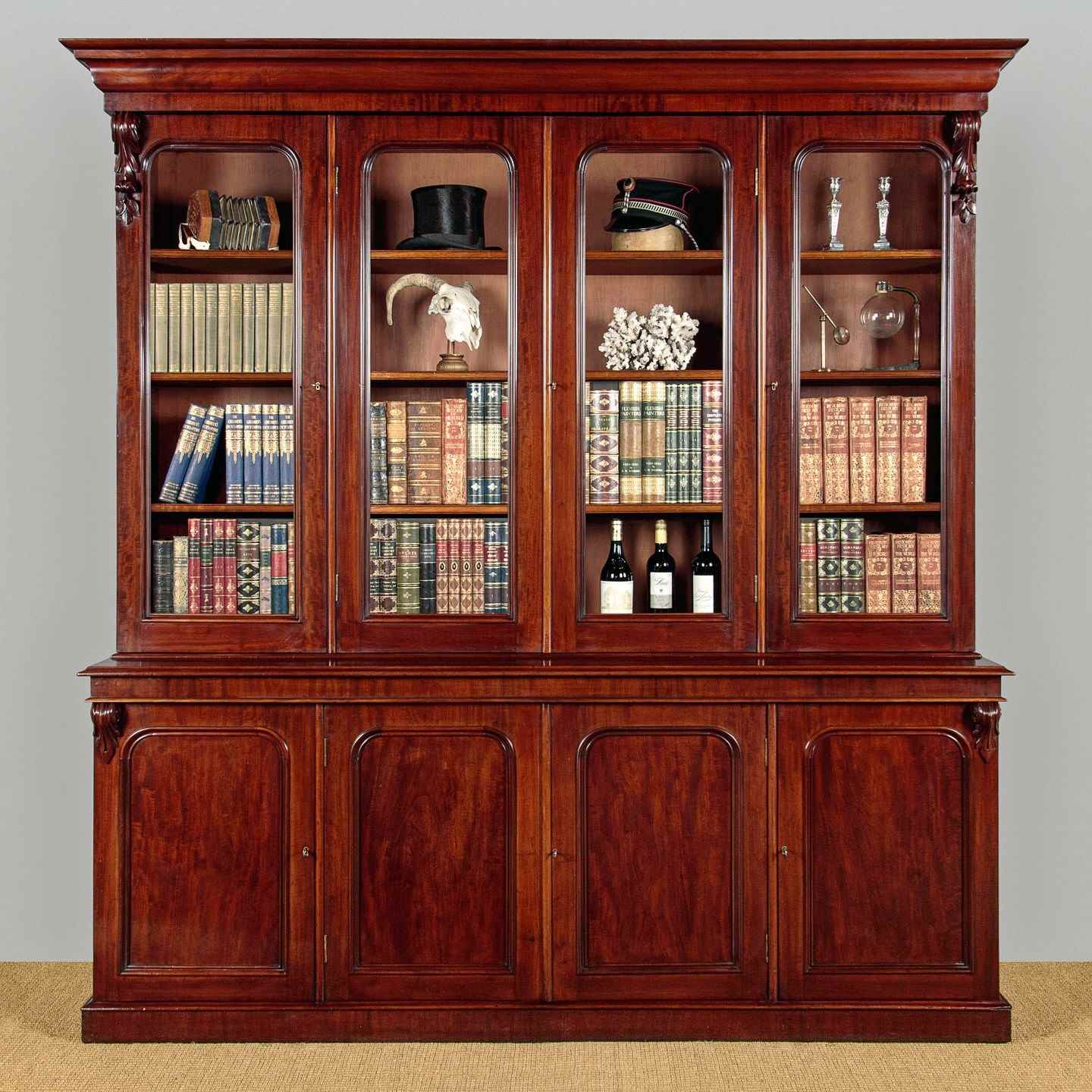 Large four door mahogany library bookcase c.1870. Glazed bookcase top fitted with three adjustable shelves to each section (internal depth 10¾"). Over a deeper base with blind panel doors and a single shelf inside (depth 17"). Simple uncluttered design with a deep ogee moulded cornice and carved corbels top and bottom, rounded upper corners to the door panels, set within moulded surrounds. Raised on a crossbanded plinth. Solid mahogany sides and groundwork to the doors. Excellent colour and condition, cleaned and waxed in our workshops. Keys supplied.