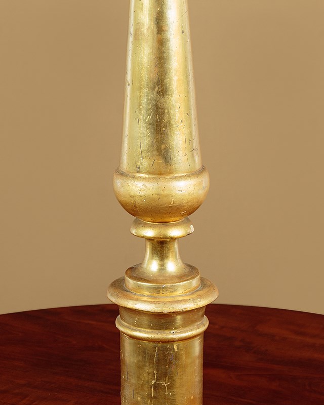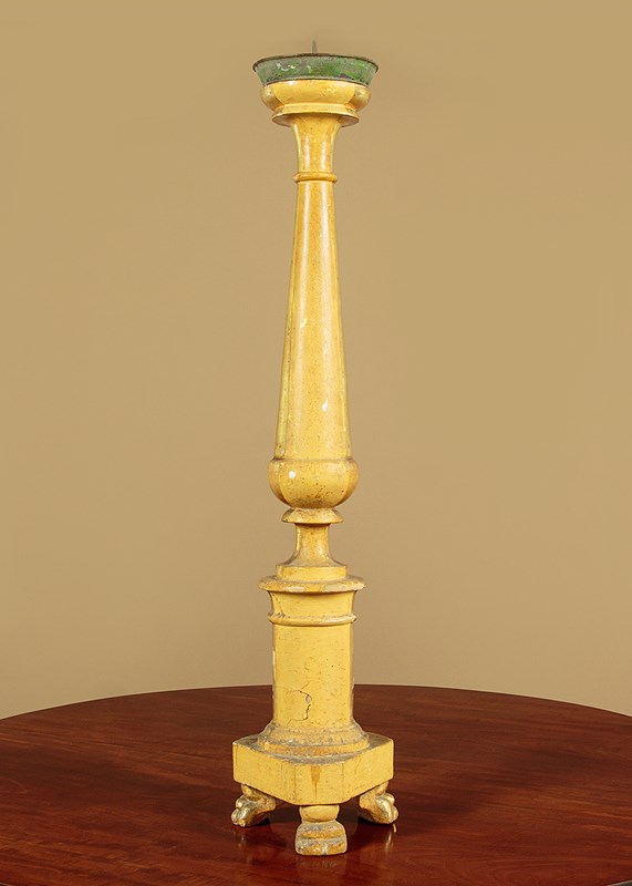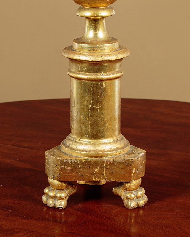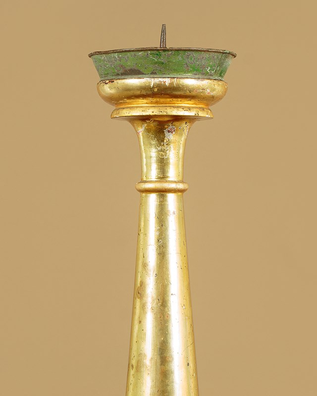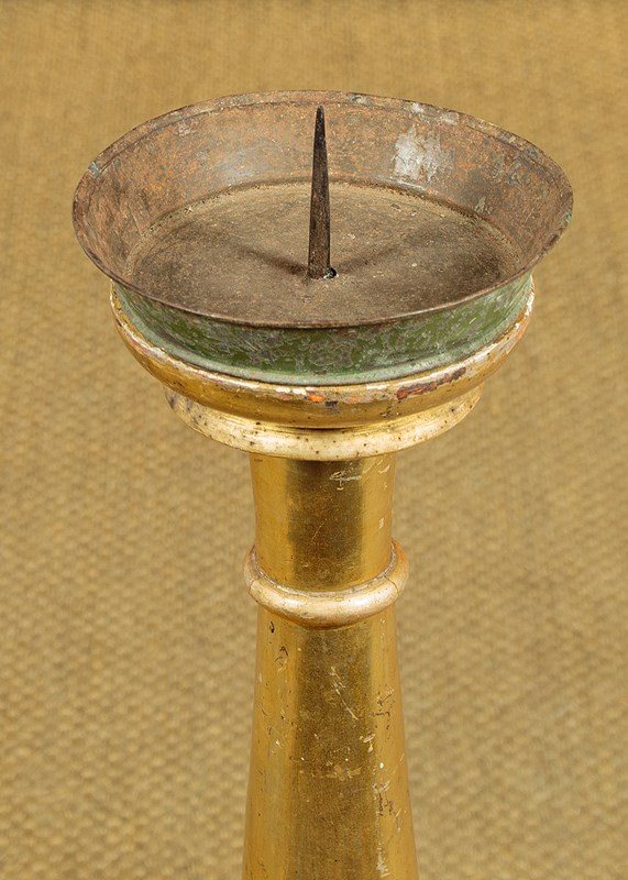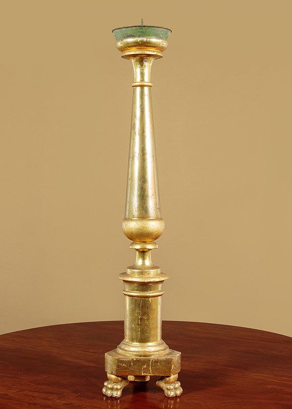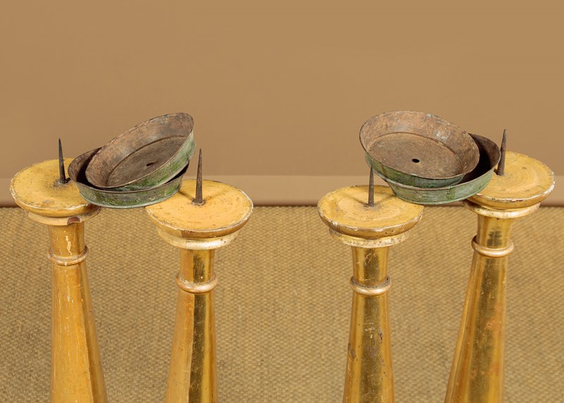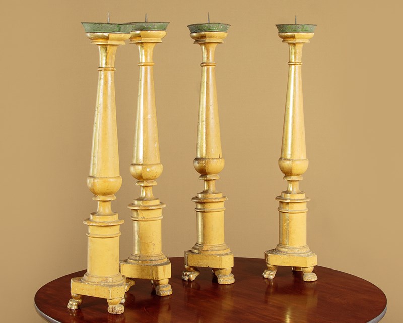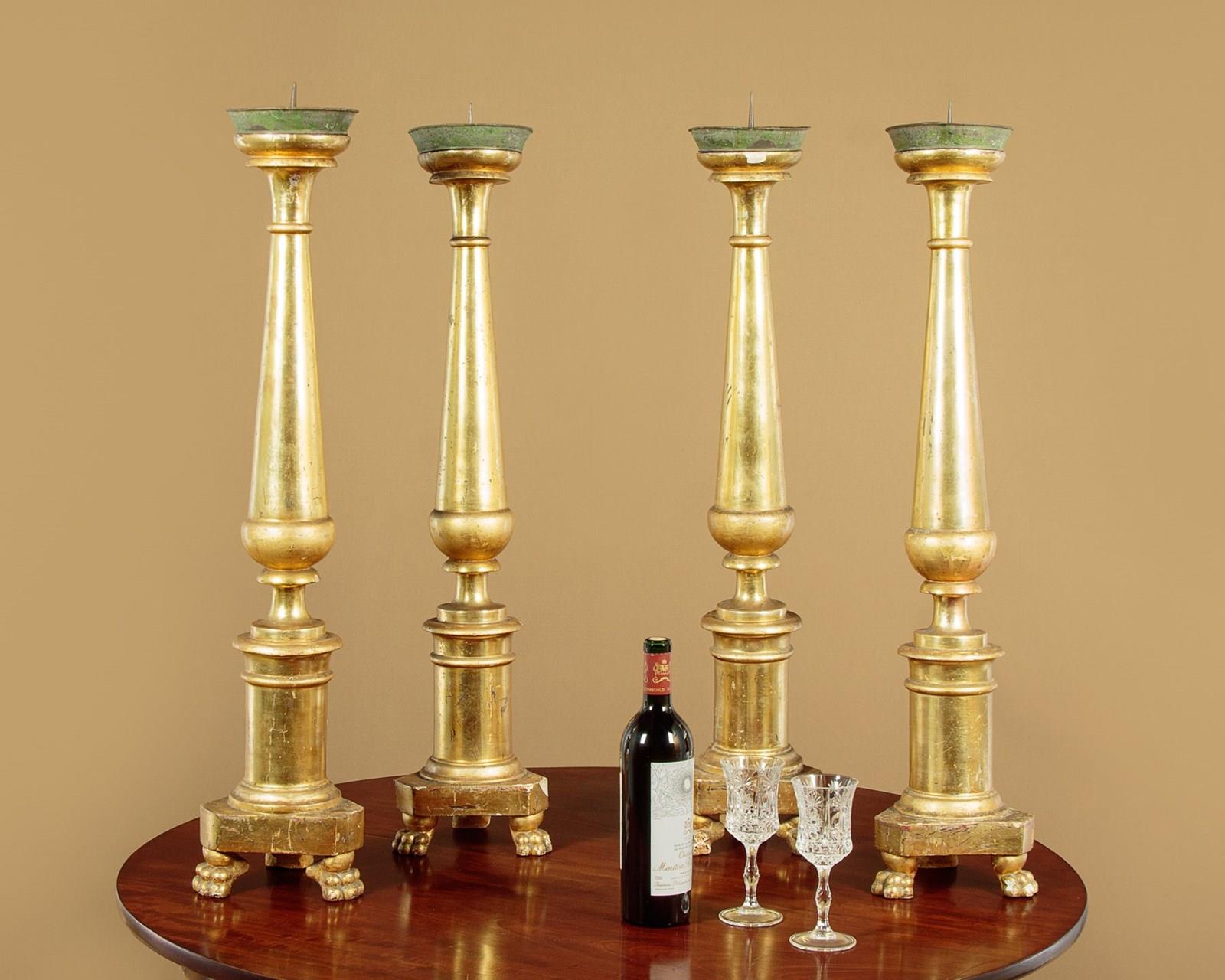 Set of four large early 19th.c. giltwood and toleware pique cierge candlesticks c.1810. Standing 36" tall with a spike on top to hold a large candle in place. Retaining the original green painted toleware dishes (5" diameter) to catch dripping wax, quite a rare feature. Turned baluster columns on triangular bases with carved claw feet. Retaining the original gilding to the front, note how the rear of each is left ungilded. Presented as found in very good original condition.