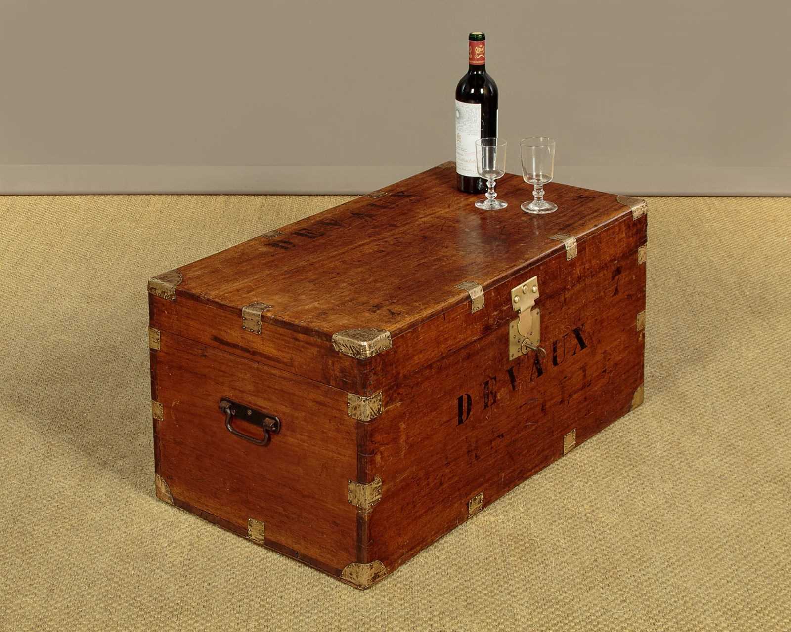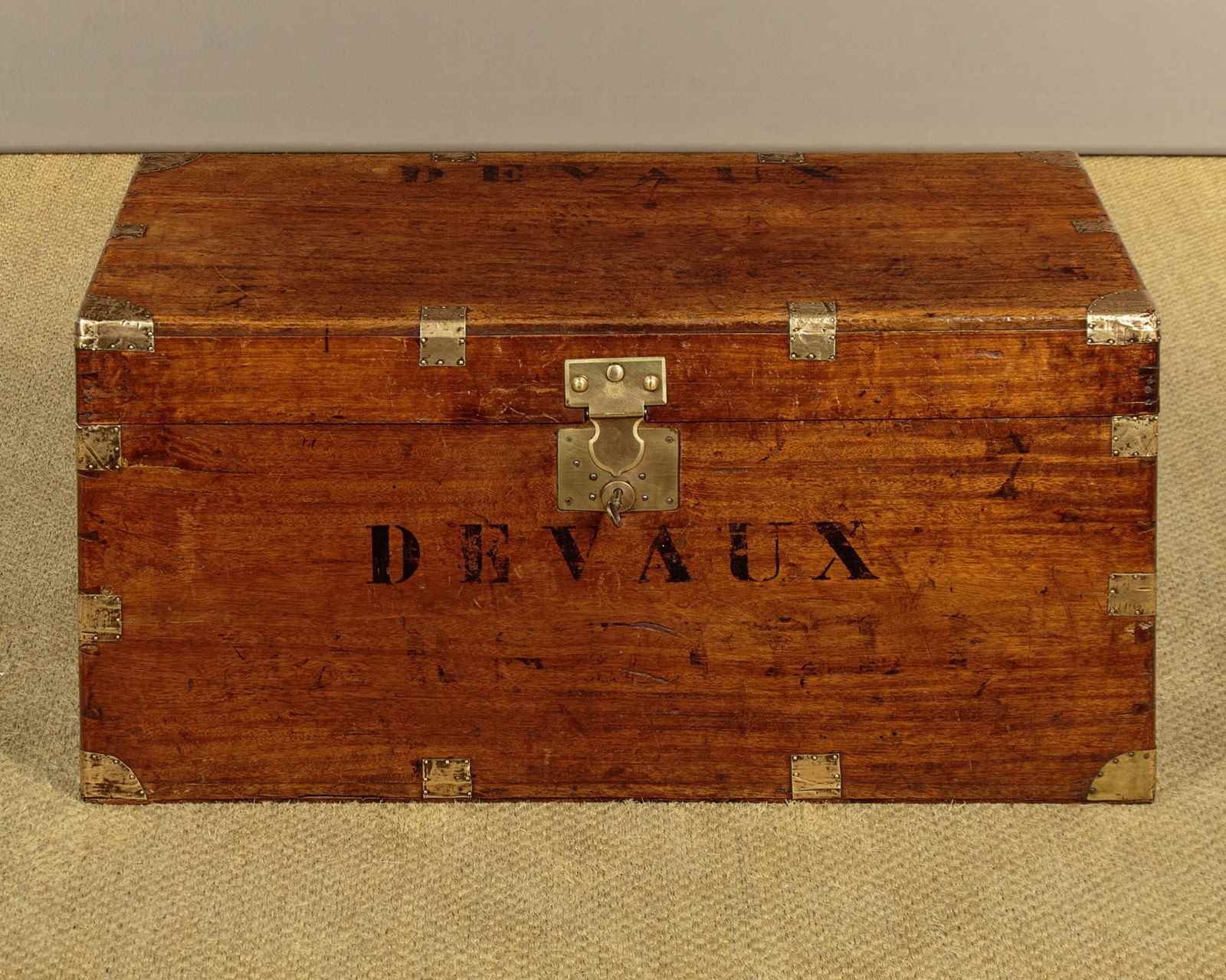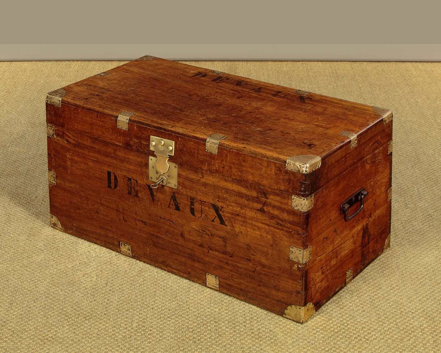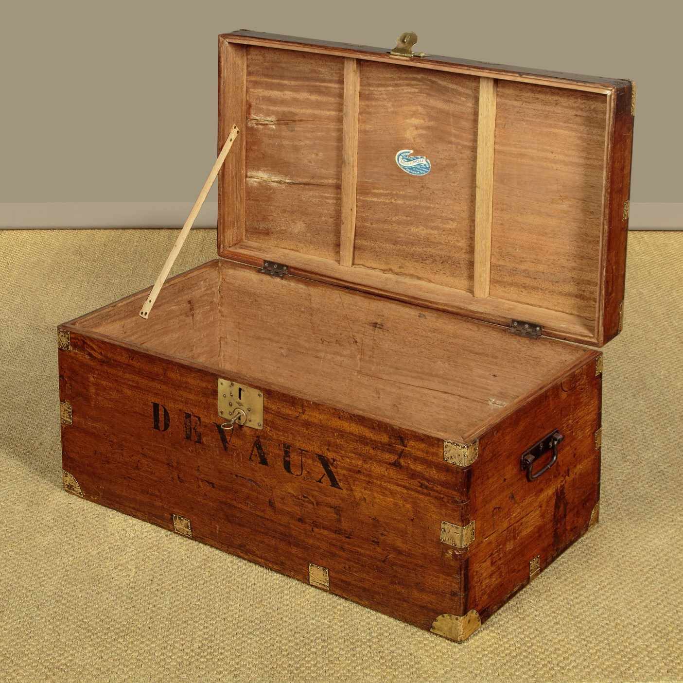 Late 19th.c. French campaign chest or travelling trunk c.1890. In mahogany with brass bindings and corners and large iron carry handles at the ends. Original stencilled lettering for Devaux (family name of one of the great French Champagne houses) on the top and front, with Marseilles faintly underneath. Fitted with a later brass latch with working lock. Paper label inside the lid for the specialist luggage makers Antoine Moli of Perpignan. Some wear and repairs, generally very good colour and condition. Restored cleaned and waxed in our workshops. Key supplied.