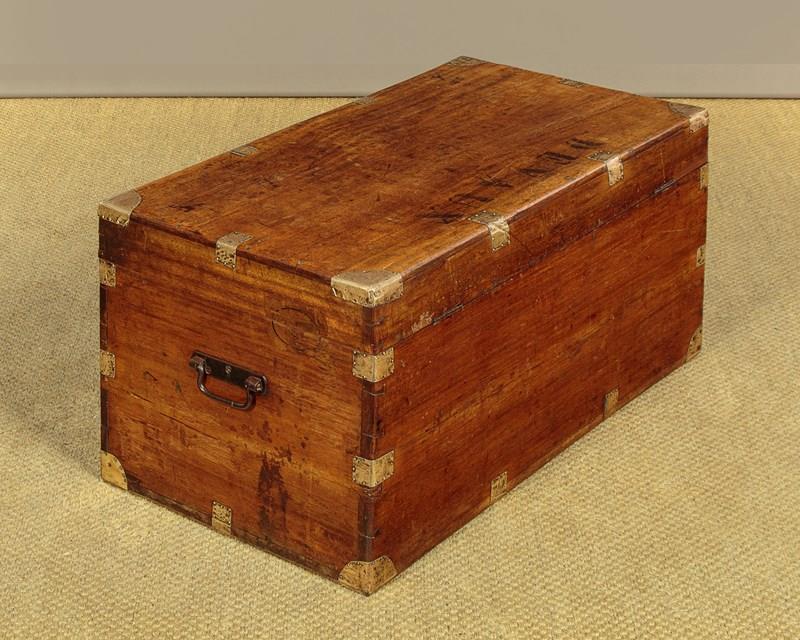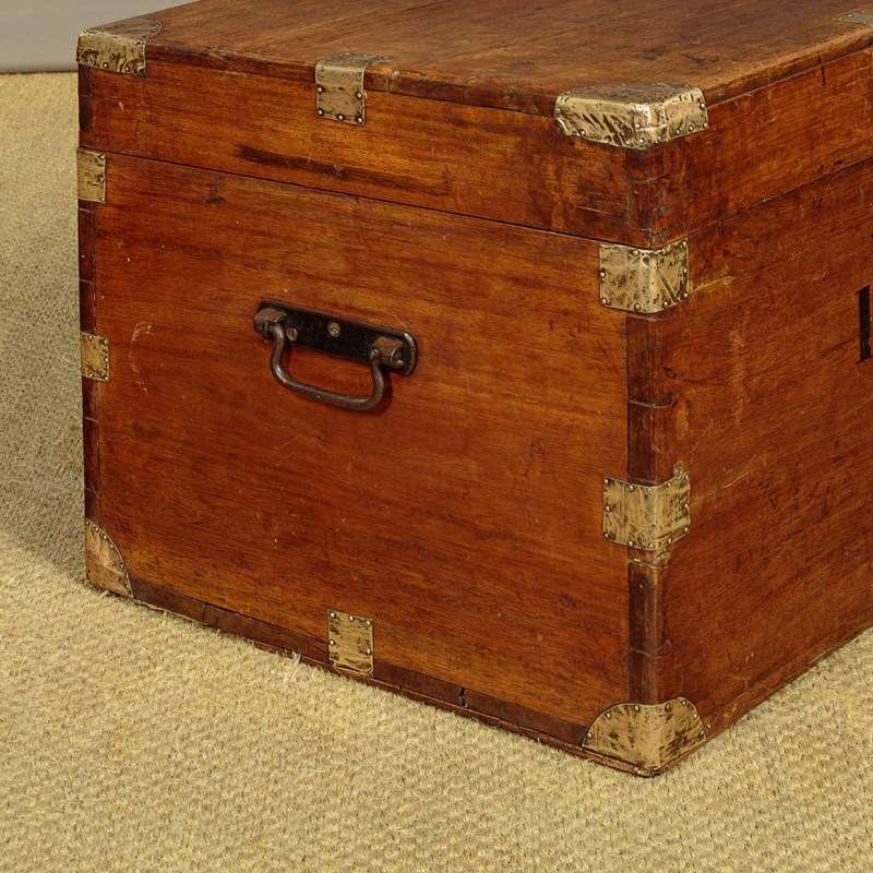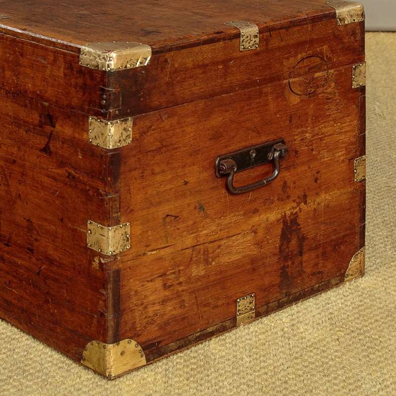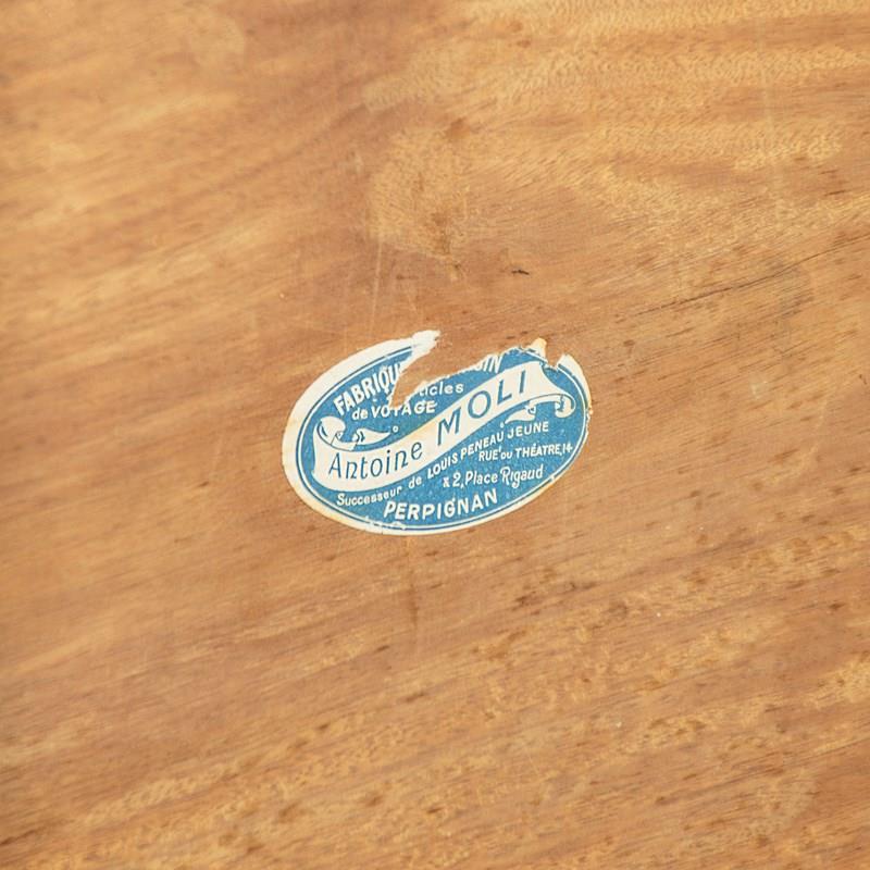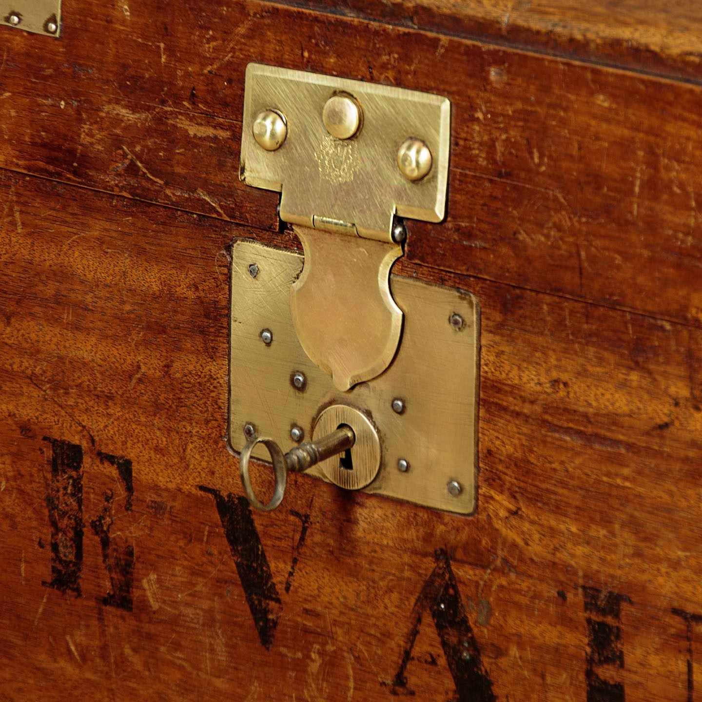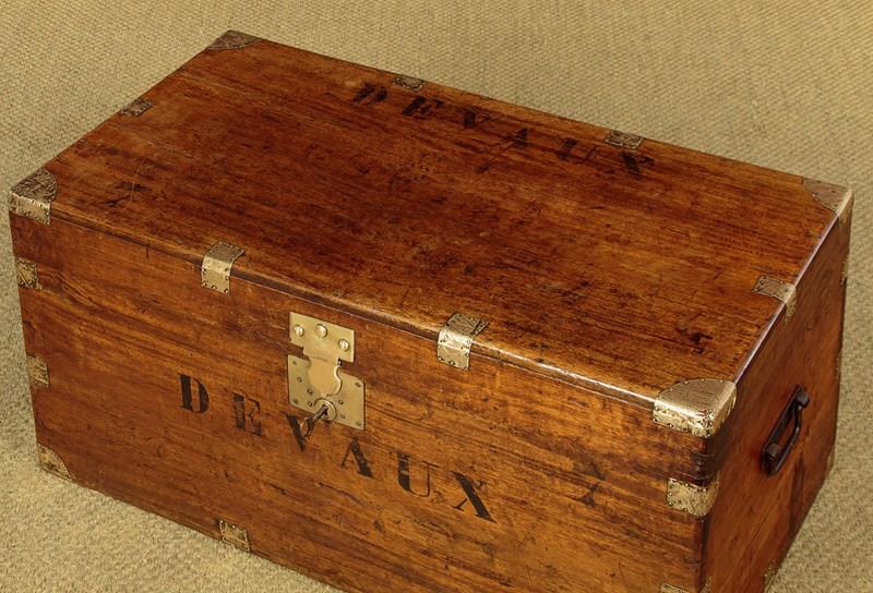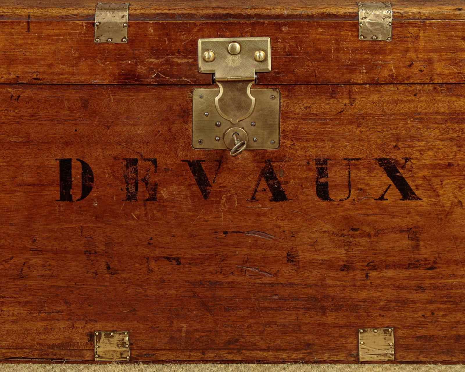 Late 19th.c. French campaign chest or travelling trunk c.1890. In mahogany with brass bindings and corners and large iron carry handles at the ends. Original stencilled lettering for Devaux (family name of one of the great French Champagne houses) on the top and front, with Marseilles faintly underneath. Fitted with a later brass latch with working lock. Paper label inside the lid for the specialist luggage makers Antoine Moli of Perpignan. Some wear and repairs, generally very good colour and condition. Restored cleaned and waxed in our workshops. Key supplied.