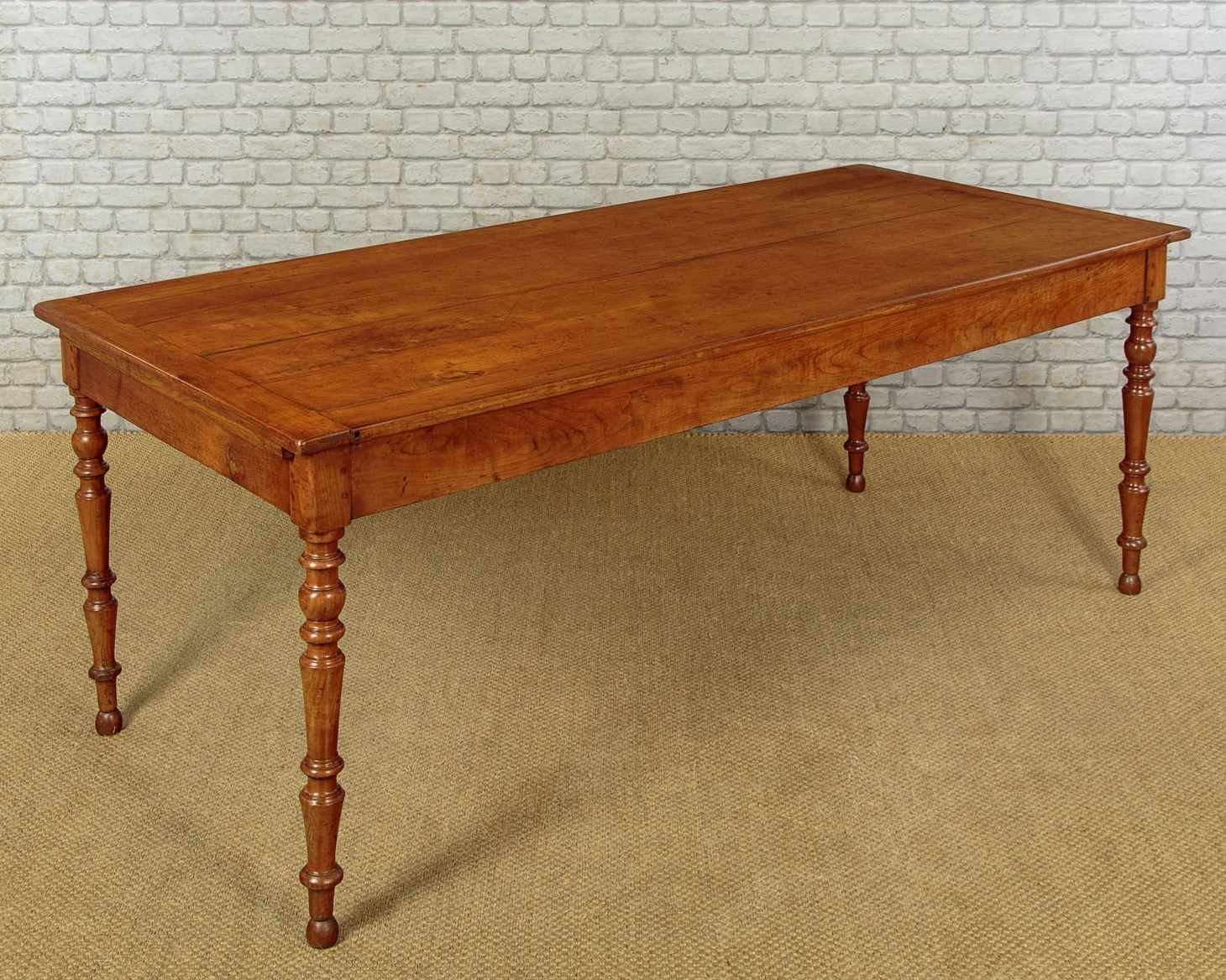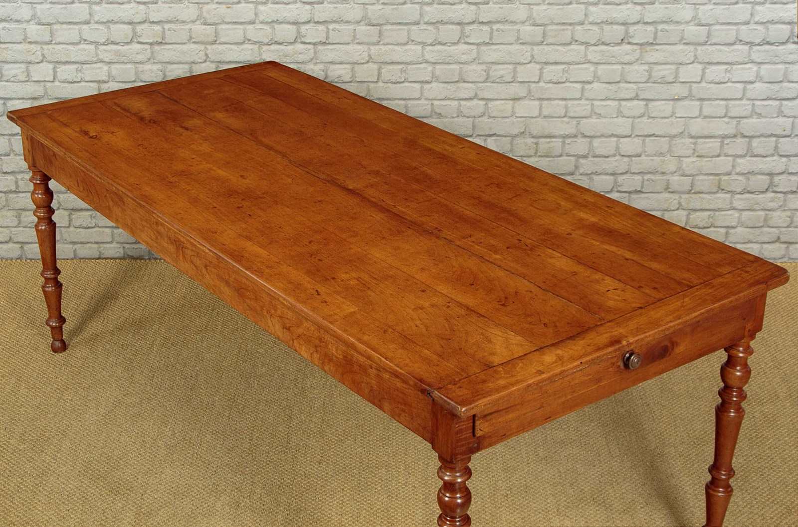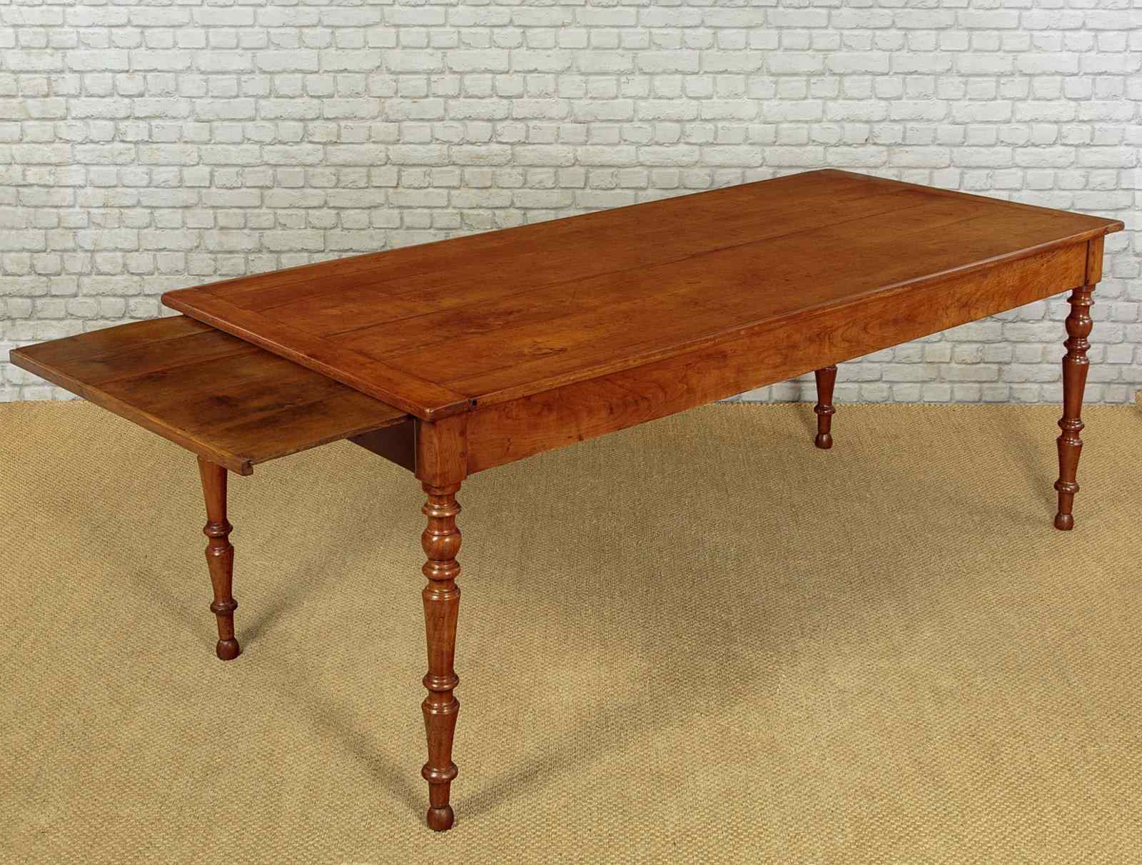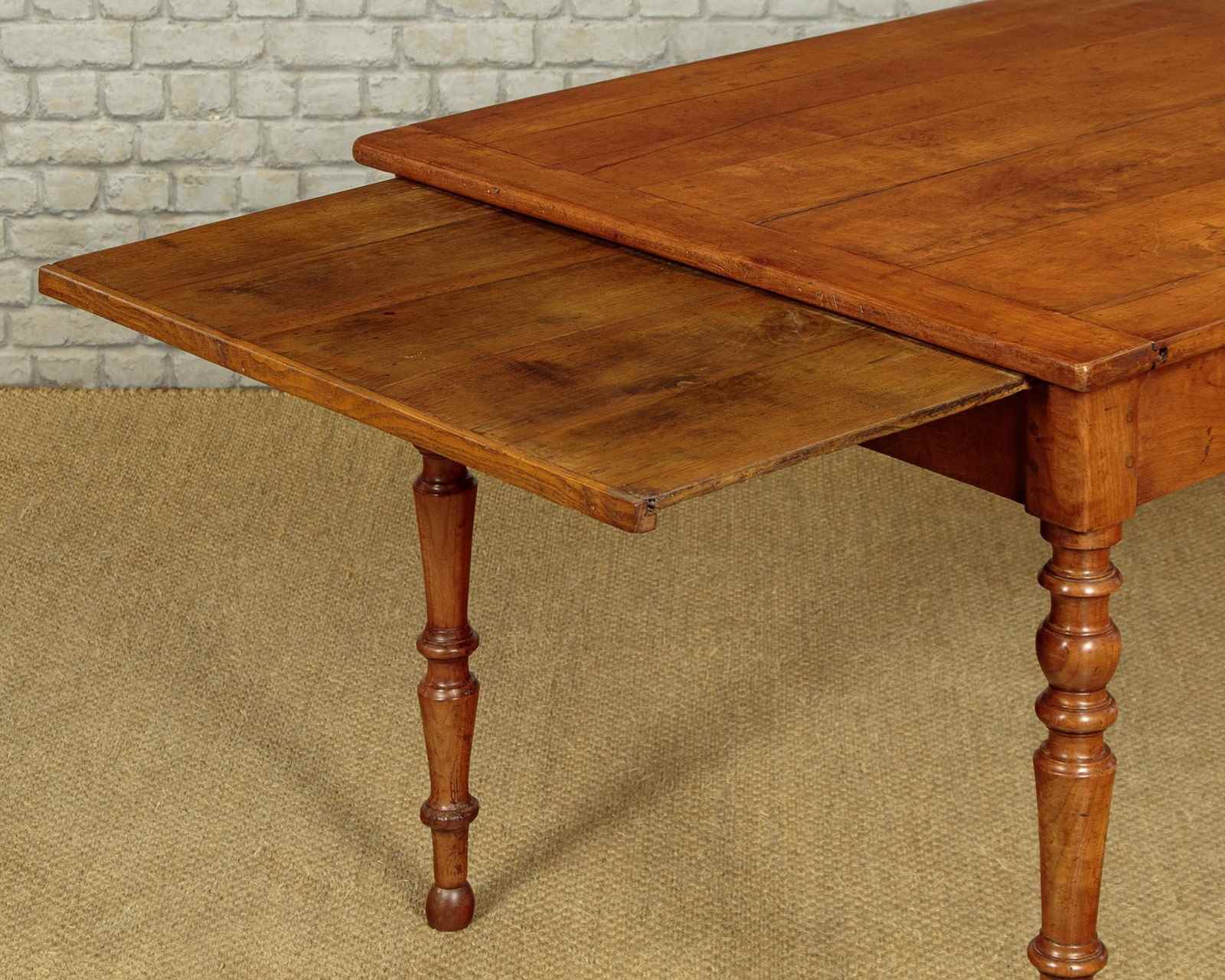 Beautiful mid 19th.c. French cherry wood farmhouse kitchen dining table c.1860. 35" x 78½" top (a little wider than may we see) made from solid cherry wood boards with cleated ends. Base with a useful drawer at one end and a 14" extension in oak at the other. Slim straight apron all round with 24" knee height below. Raised on lovely turned and tapering legs. Excellent colour and condition, cleaned and waxed in our workshops.