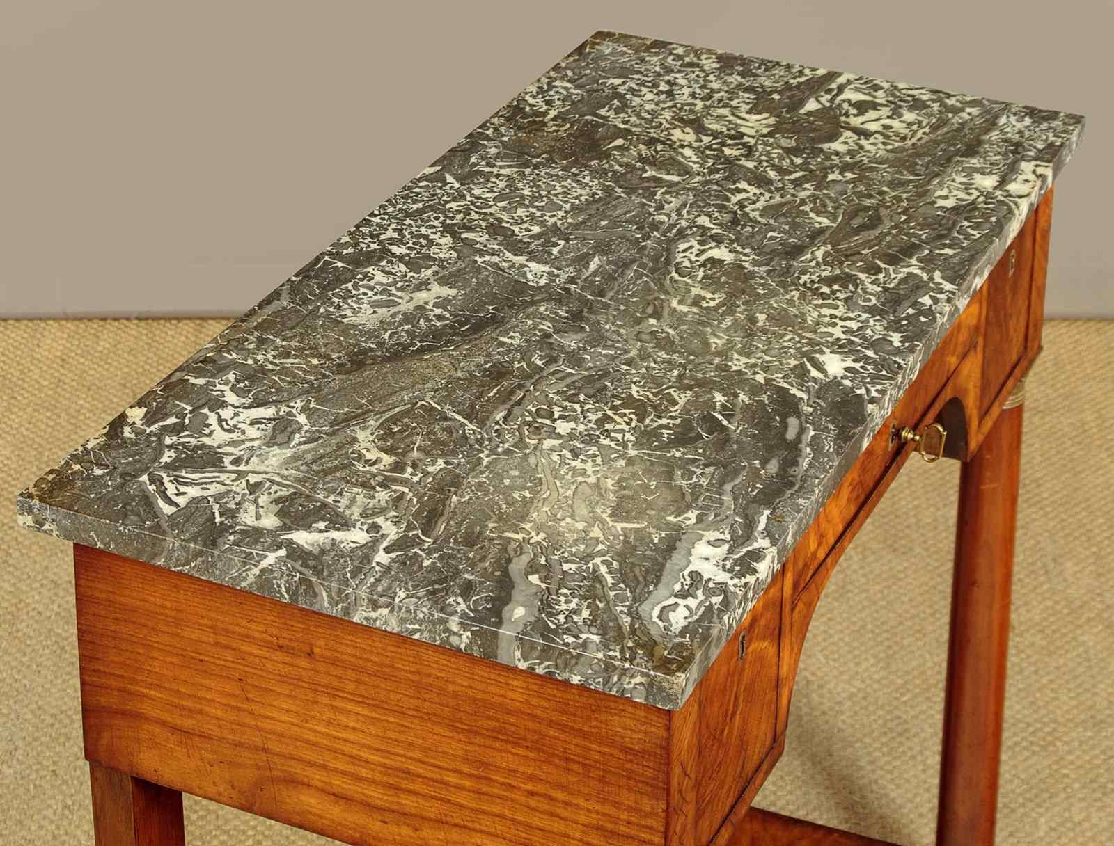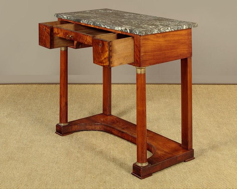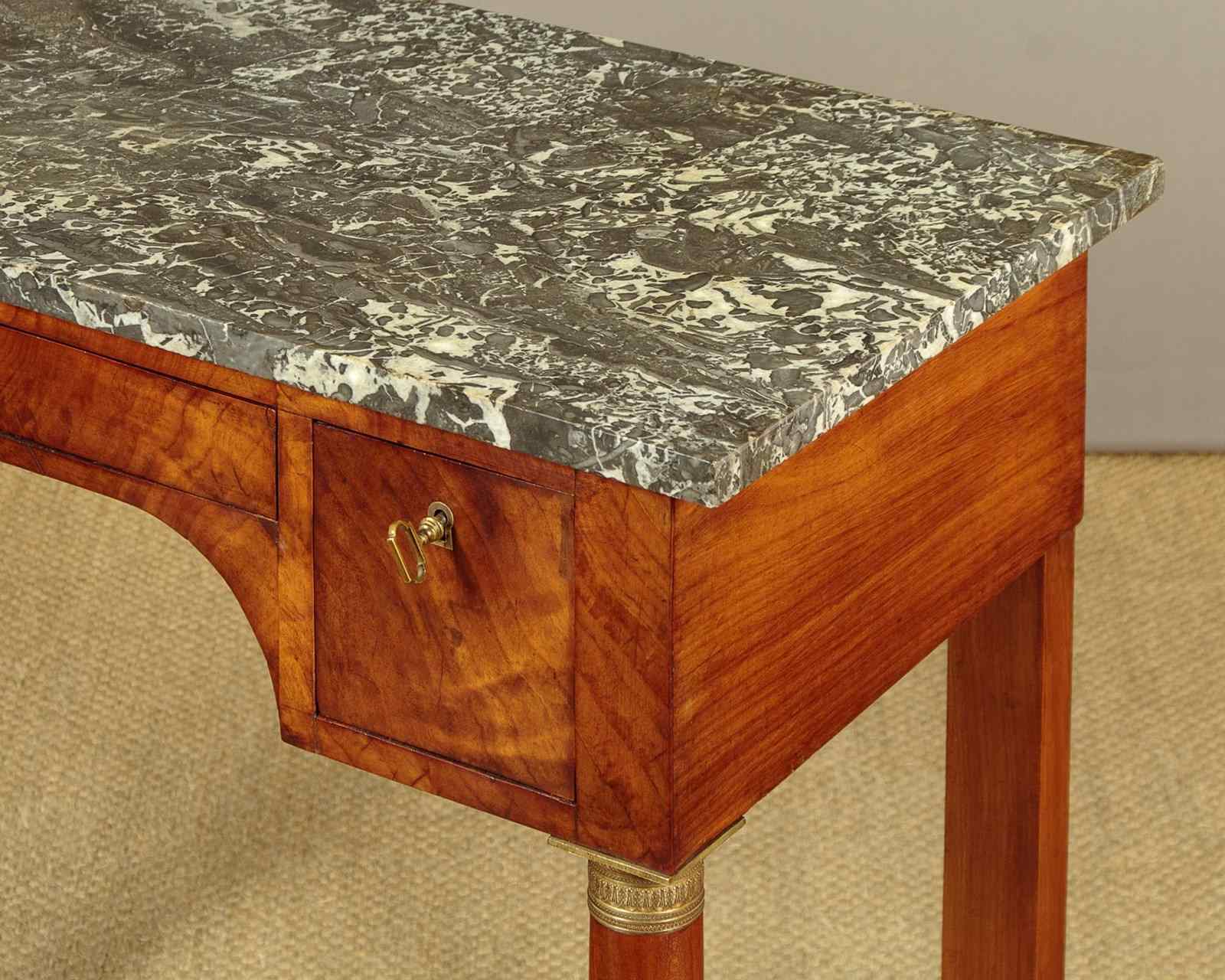 Handsome mid 19th.c. French Empire style walnut console table c.1820. Well figured grey marble top over (unusually) three small oak lined drawers arranged around the raised kneehole at the centre. With pronounced grain to the veneers on the drawer fronts and inlaid brass escutcheons. Raised on turned column front legs with chased brass mounts top and bottom. Over a shaped plinth with a concave front edge, veneered and crossbanded and square pad feet below at the front and rear. Solid walnut sides, oak backboard. Very good colour and condition, restored cleaned and waxed in our workshops.