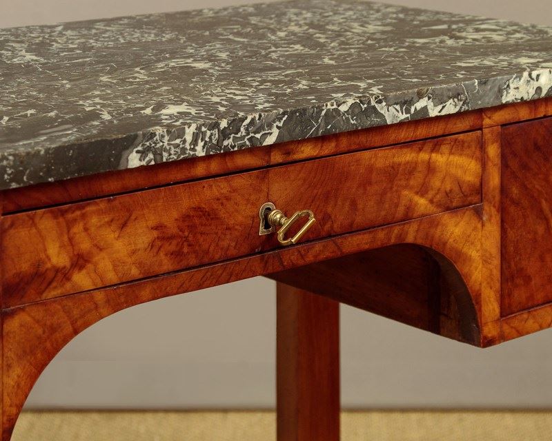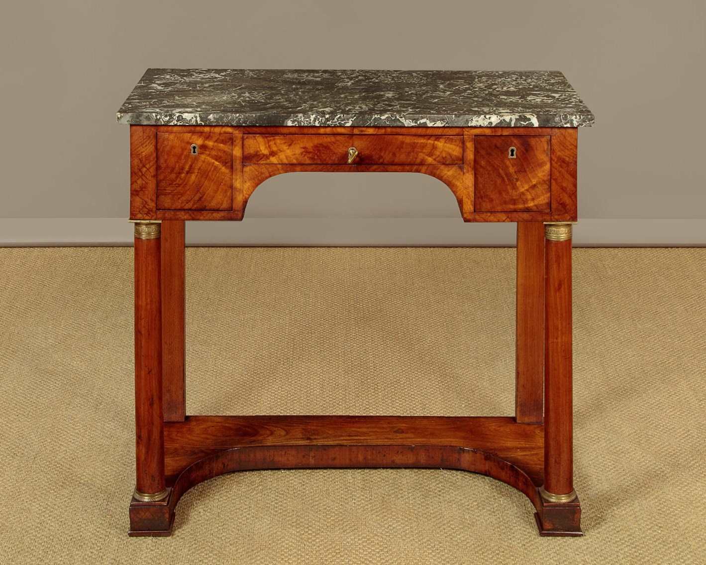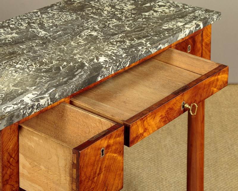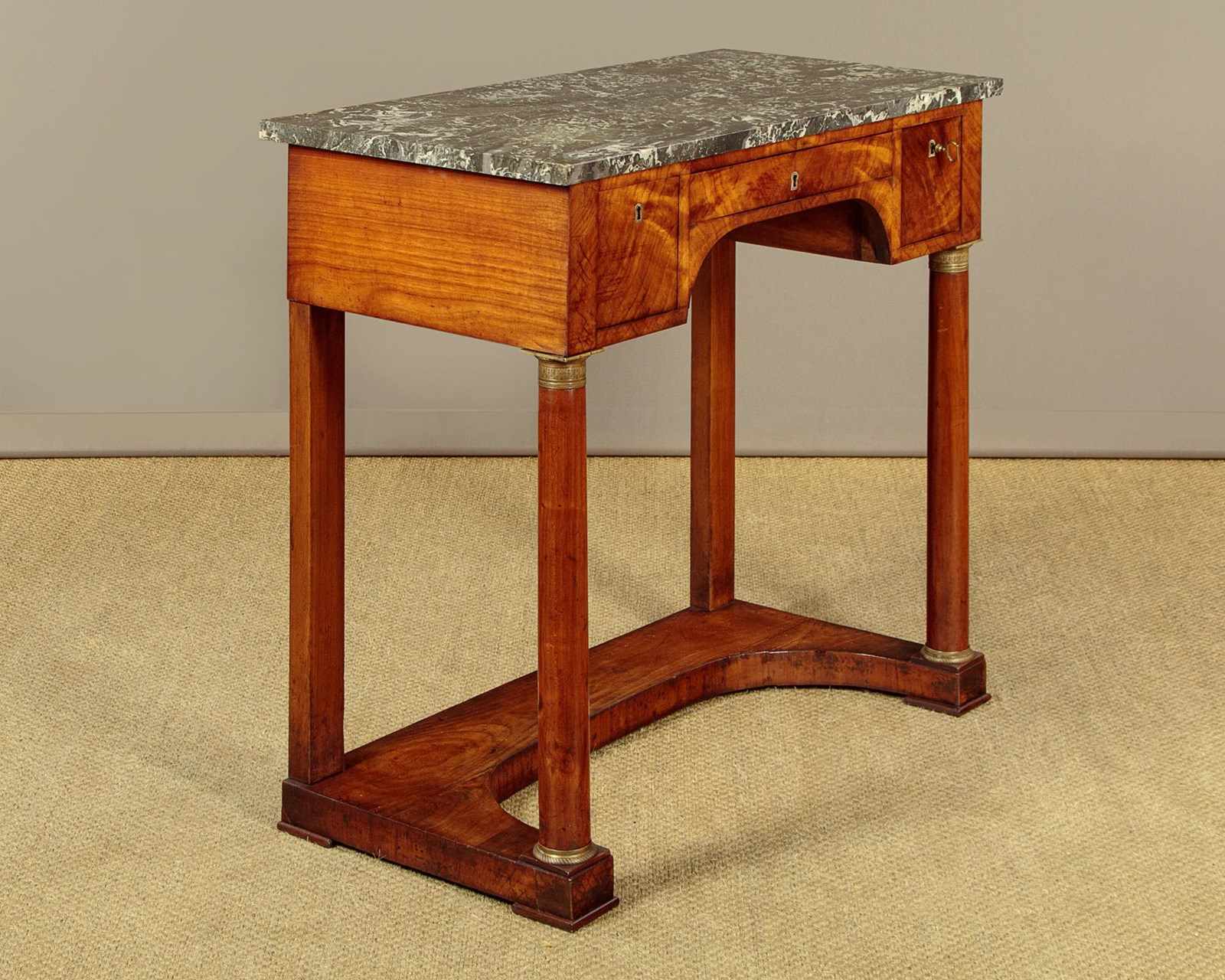 Handsome mid 19th.c. French Empire style walnut console table c.1820. Well figured grey marble top over (unusually) three small oak lined drawers arranged around the raised kneehole at the centre. With pronounced grain to the veneers on the drawer fronts and inlaid brass escutcheons. Raised on turned column front legs with chased brass mounts top and bottom. Over a shaped plinth with a concave front edge, veneered and crossbanded and square pad feet below at the front and rear. Solid walnut sides, oak backboard. Very good colour and condition, restored cleaned and waxed in our workshops.