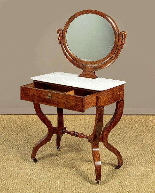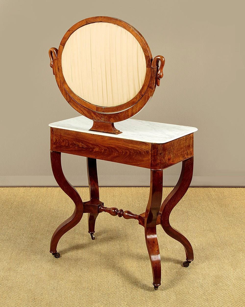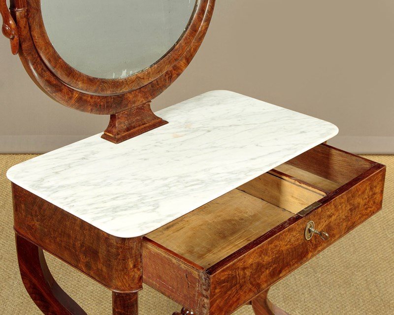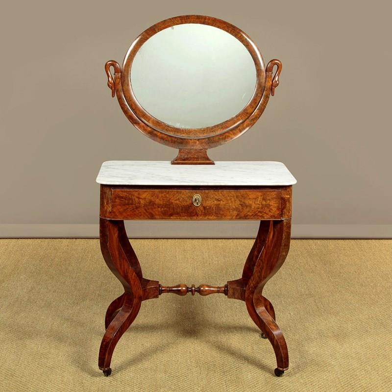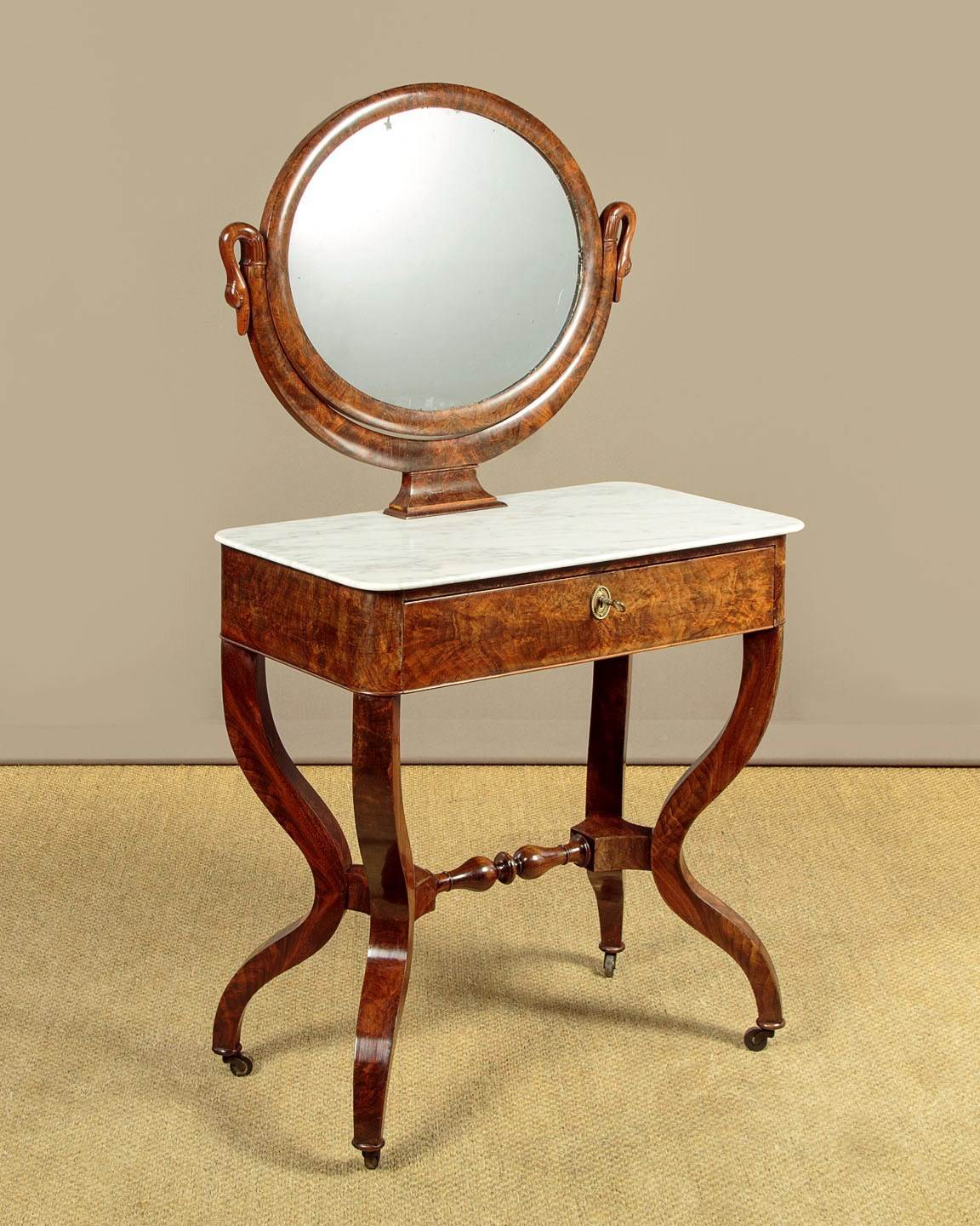 Early 19th.c. French Empire style mahogany dressing table or wash stand c.1820. Just 29" wide. Original oval mirror plate within a crossbanded flame mahogany frame, angle adjustable on a shaped yoke, veneered to match and ending in delightful carved swan’s heads (symbol of the Empress Josephine). Over the original white marble top with rounded corners. Flame mahogany veneered base with a single drawer. Raised on graceful curving legs joined with a turned stretcher and retaining the original wooden castors to the feet. Some tarnish to the mirror (which could be easily replaced), mainly around the edge. Otherwise very good colour and condition, cleaned and waxed in our workshops. Key supplied.