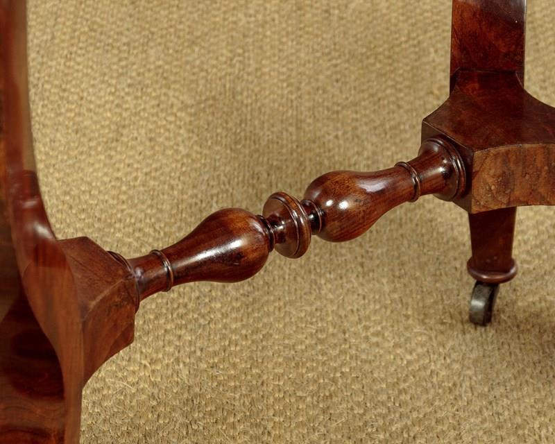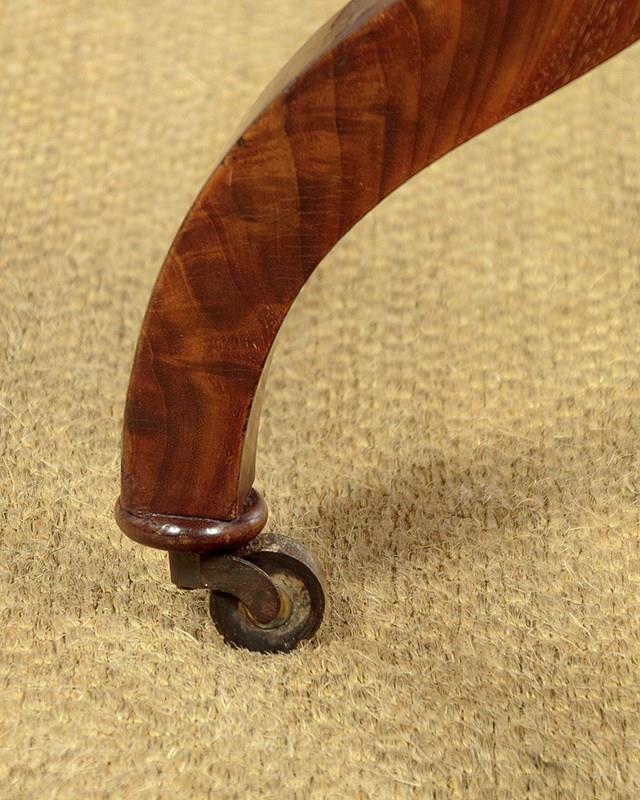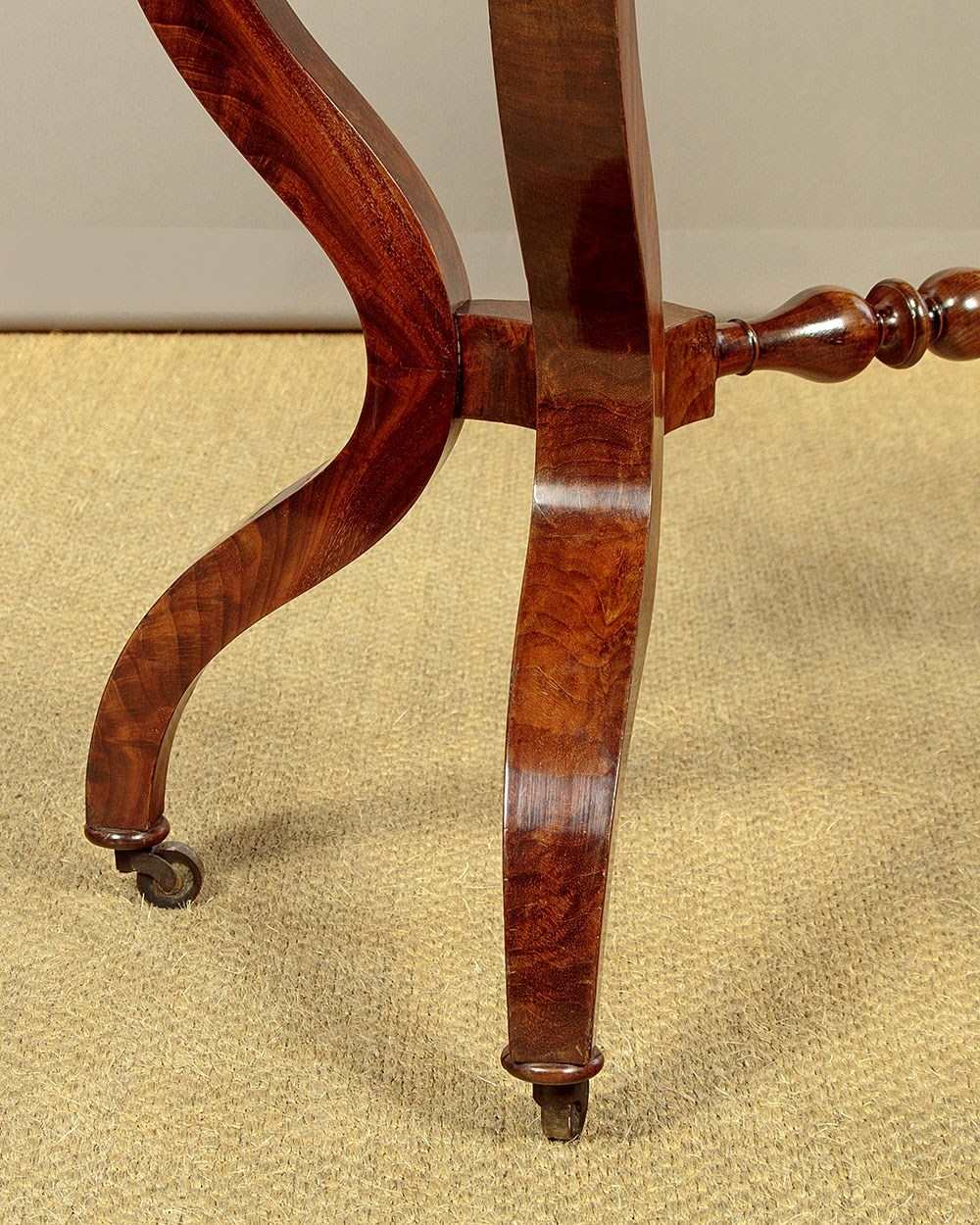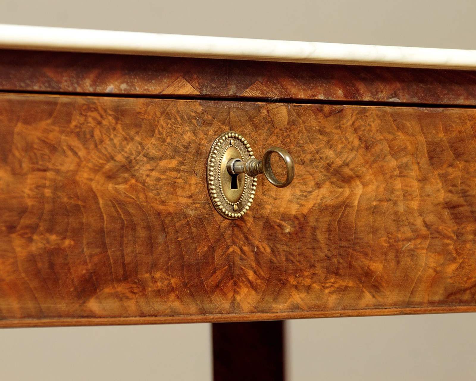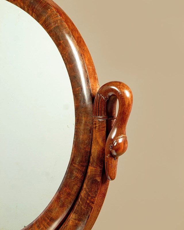 Early 19th.c. French Empire style mahogany dressing table or wash stand c.1820. Just 29" wide. Original oval mirror plate within a crossbanded flame mahogany frame, angle adjustable on a shaped yoke, veneered to match and ending in delightful carved swan’s heads (symbol of the Empress Josephine). Over the original white marble top with rounded corners. Flame mahogany veneered base with a single drawer. Raised on graceful curving legs joined with a turned stretcher and retaining the original wooden castors to the feet. Some tarnish to the mirror (which could be easily replaced), mainly around the edge. Otherwise very good colour and condition, cleaned and waxed in our workshops. Key supplied.