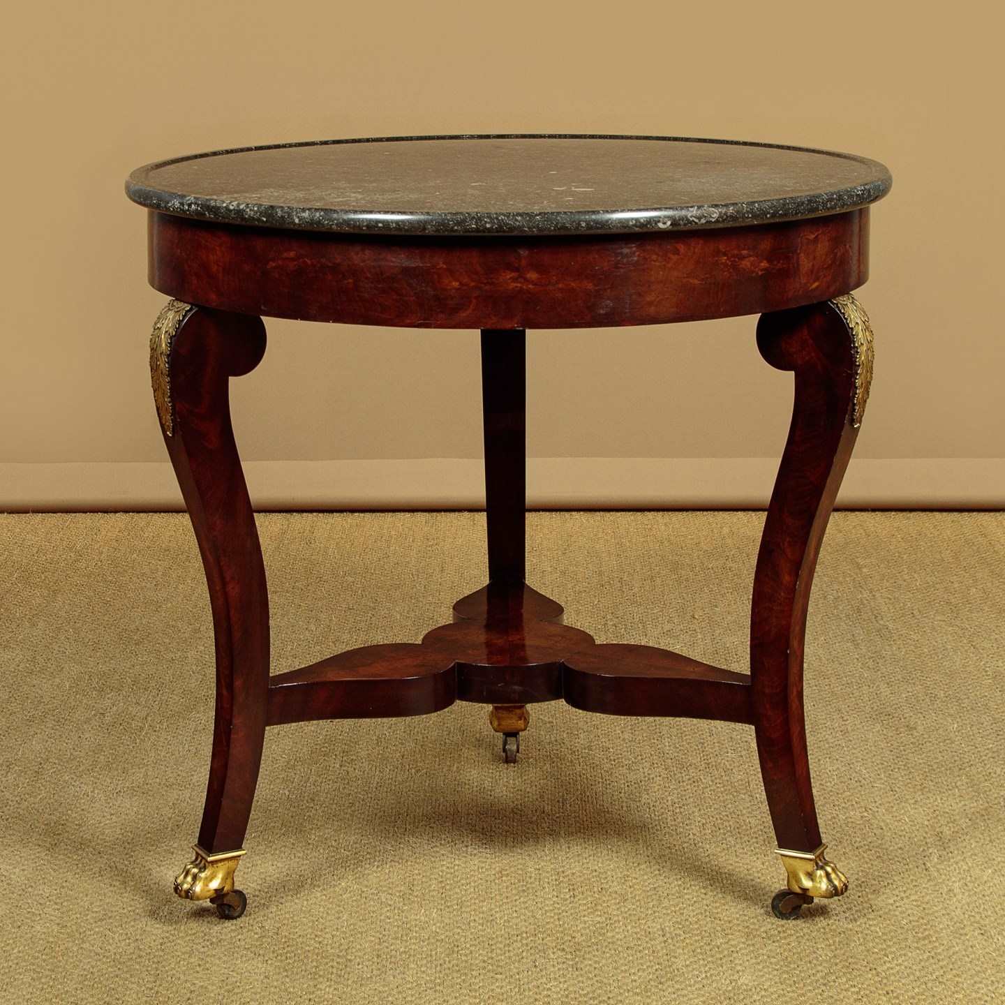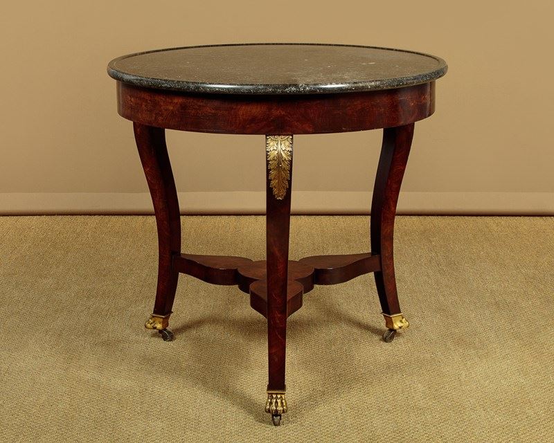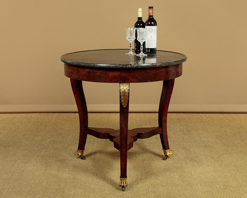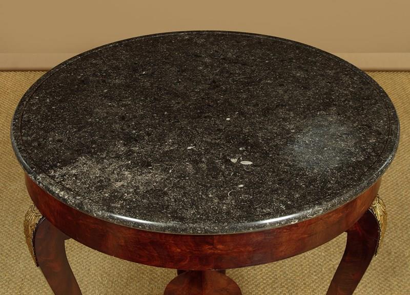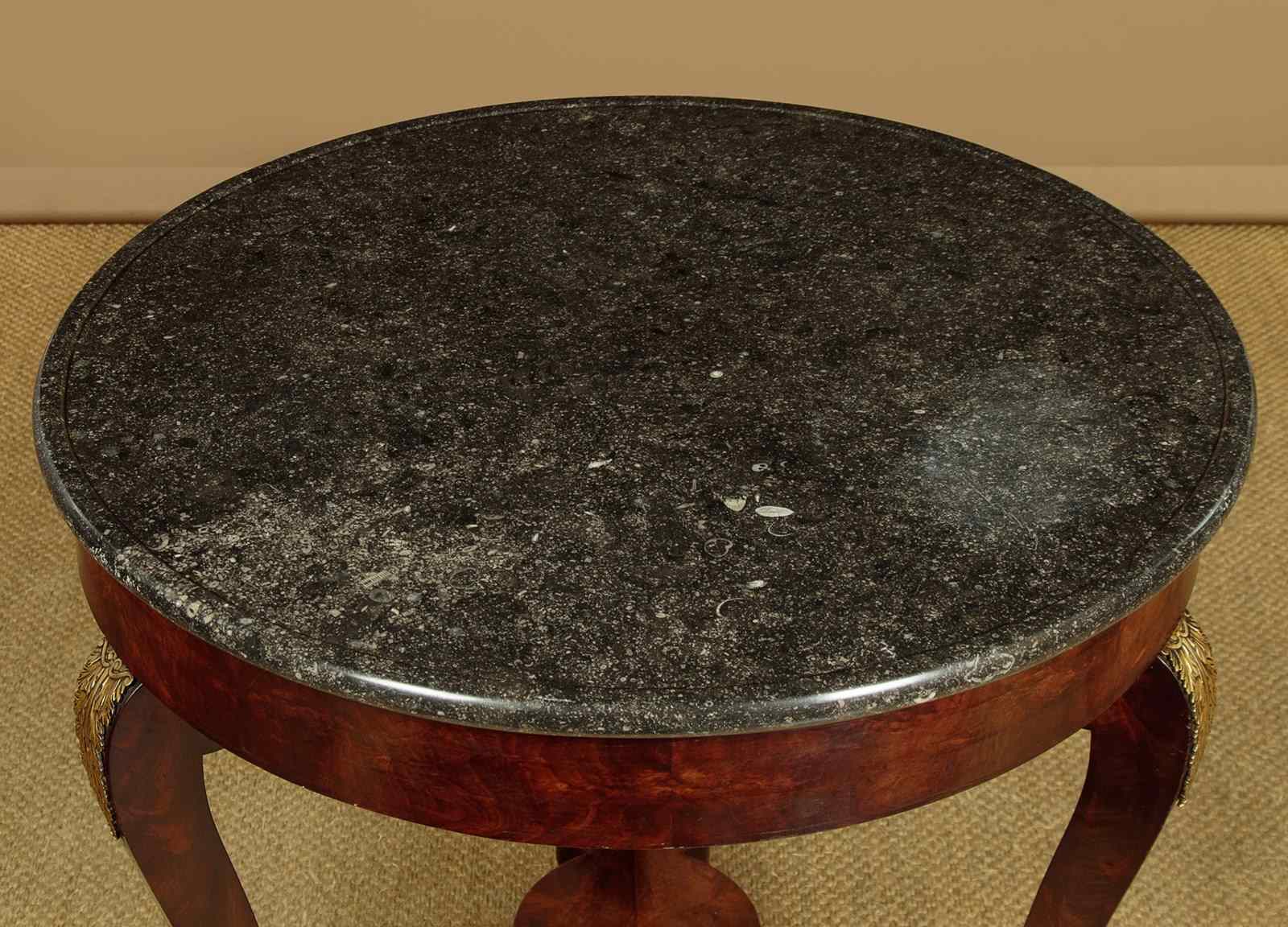 Beautiful early 19th.c. French Empire gueridon or centre table c.1820. 31½" diameter top in black marble with hundreds of tiny white fossils embedded in the stone and with a slightly raised edge to prevent spilt drinks from running off the sides. Over a flame mahogany veneered apron and shaped legs with gilded brass acanthus mounts. Legs are joined with a shaped tri-corn stretcher, veneered to match, and raised on the original gilded brass paw feet and castors below. Excellent colour and condition, cleaned and waxed in our workshops.