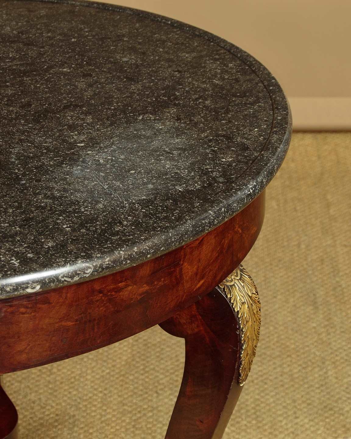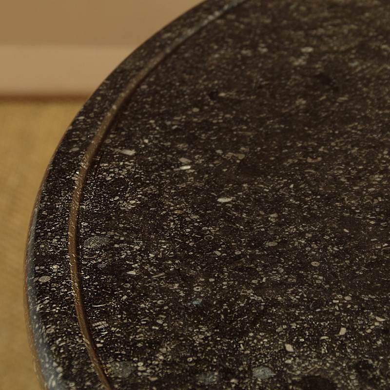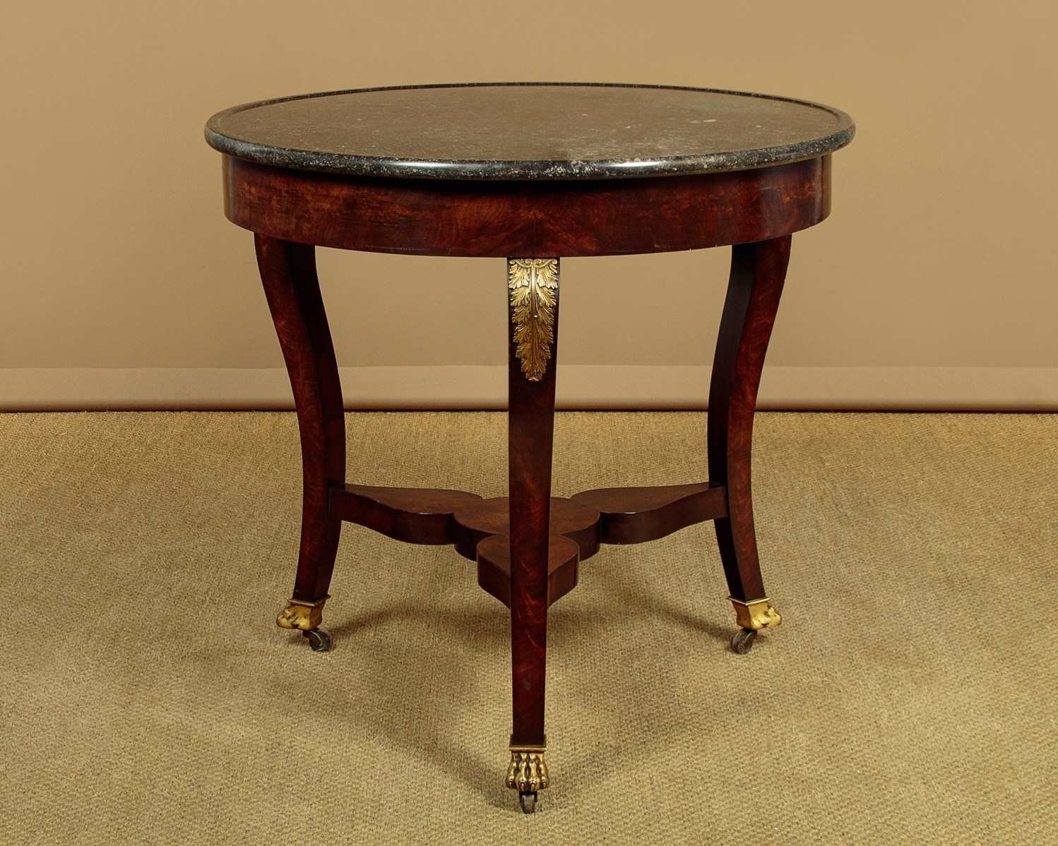 Beautiful early 19th.c. French Empire gueridon or centre table c.1820. 31½" diameter top in black marble with hundreds of tiny white fossils embedded in the stone and with a slightly raised edge to prevent spilt drinks from running off the sides. Over a flame mahogany veneered apron and shaped legs with gilded brass acanthus mounts. Legs are joined with a shaped tri-corn stretcher, veneered to match, and raised on the original gilded brass paw feet and castors below. Excellent colour and condition, cleaned and waxed in our workshops.