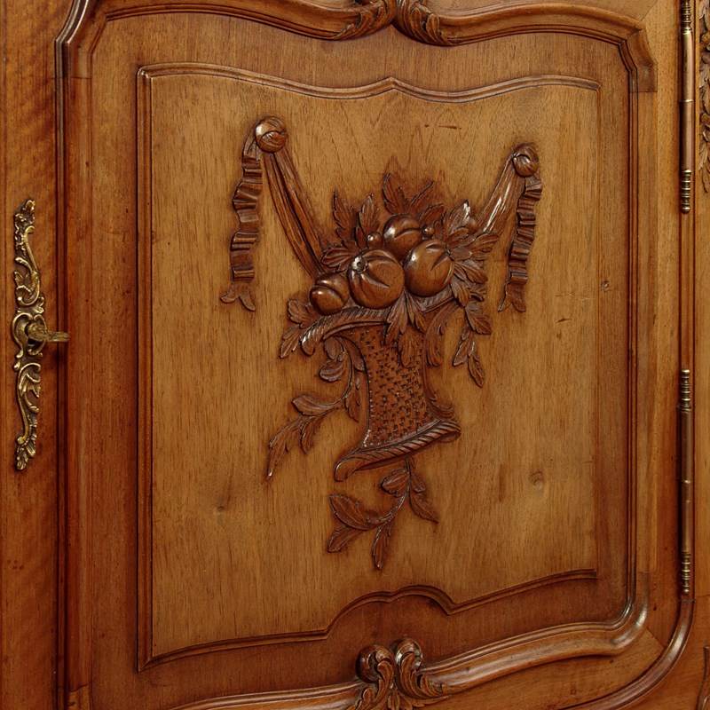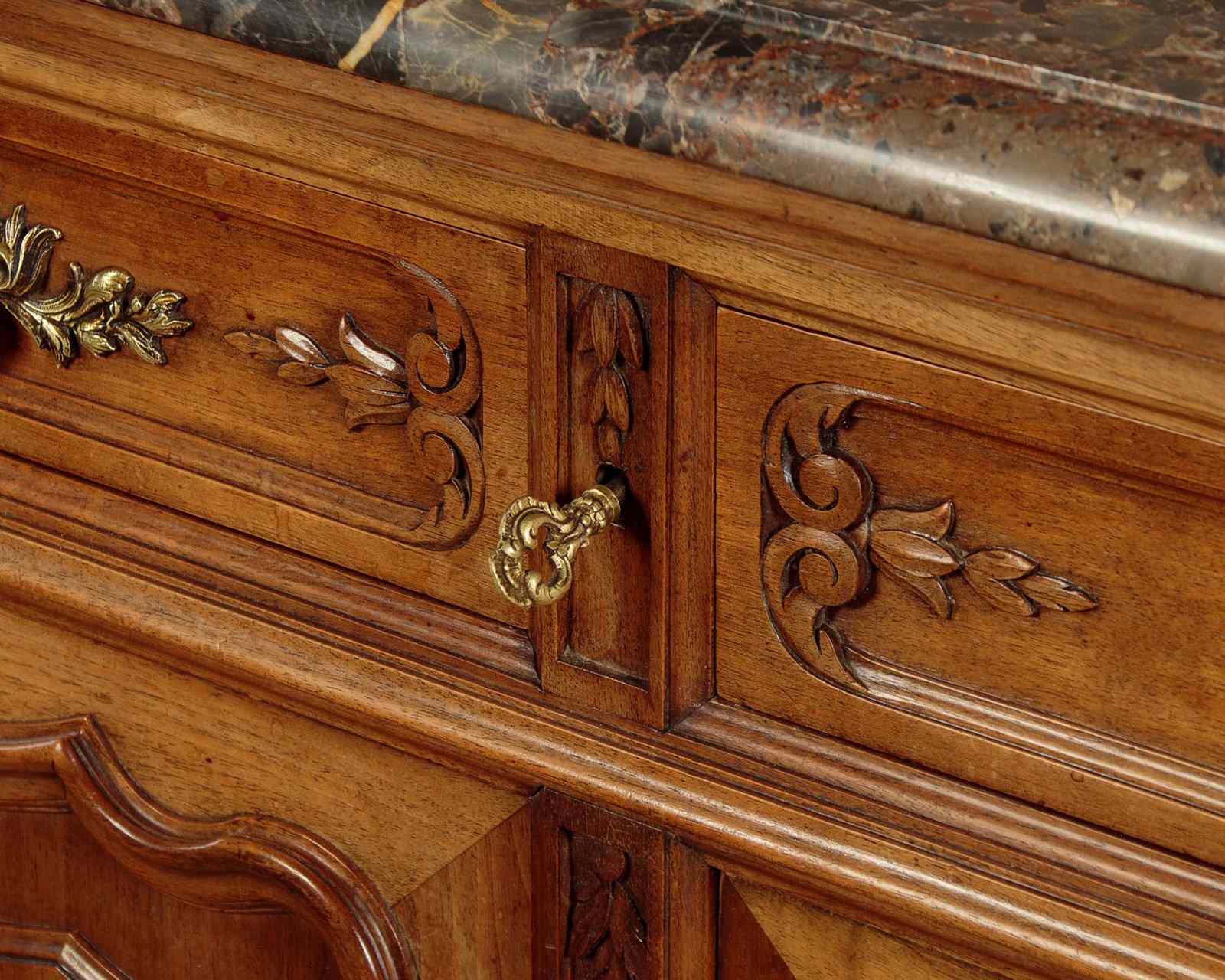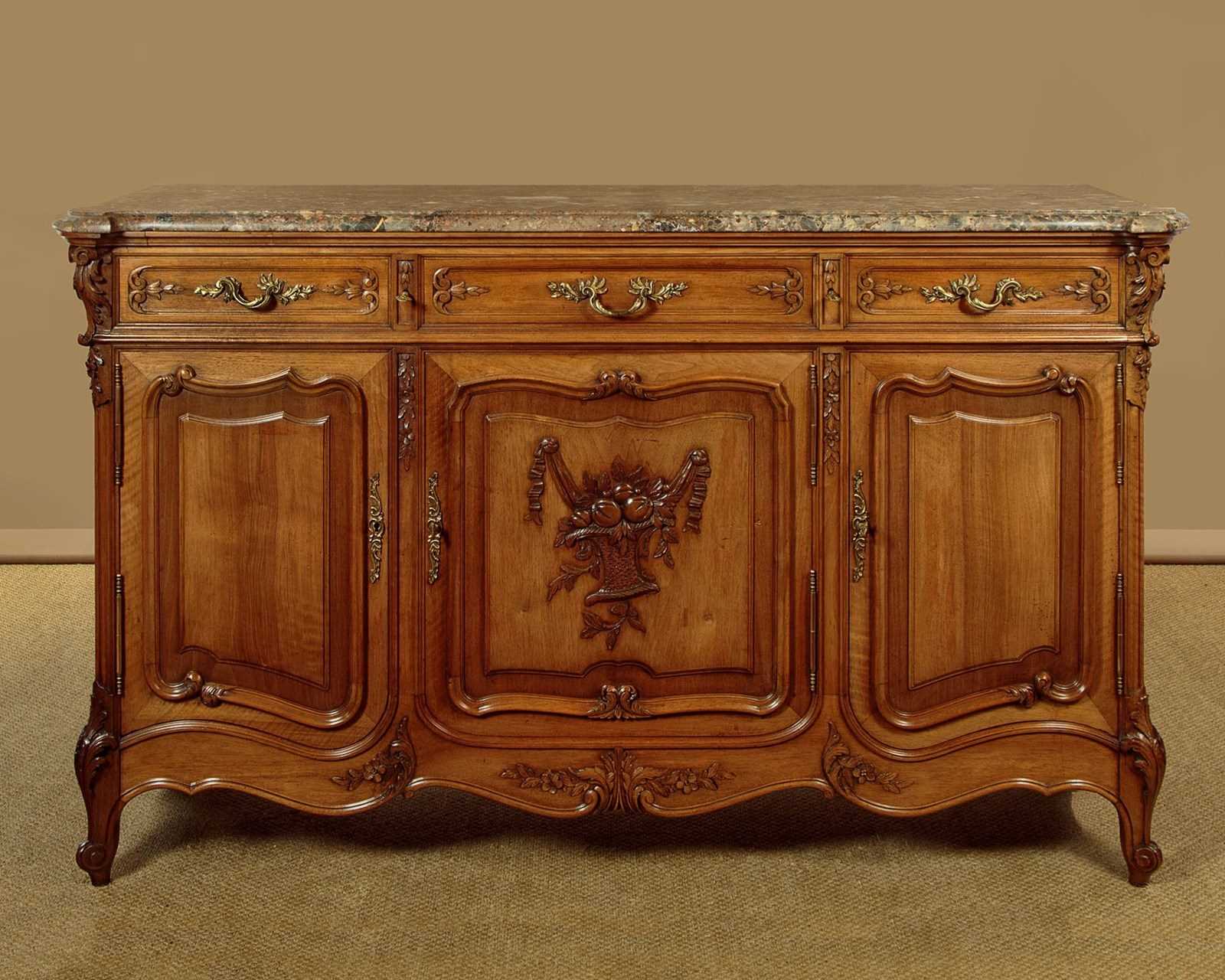 Quality French walnut and marble top sideboard c.1930. Thick marble top with rounded projecting front corners and a moulded edge. Over three oak lined drawers and a three door cupboard fitted with a single long shelf inside (depth 16"). Decorative front with carved and moulded drawers and shaped and raised door panels carved with a basket of fruit to the centre. Note also the shaped bottom edges to the doors, an unusual feature. Original brass handles, escutcheon plates and hinges. Further carved detail to the corner pilasters and front feet and to the elaborately shaped apron at the front and sides. Excellent colour and condition, cleaned and waxed in our workshops. Keys supplied for the drawers and doors.