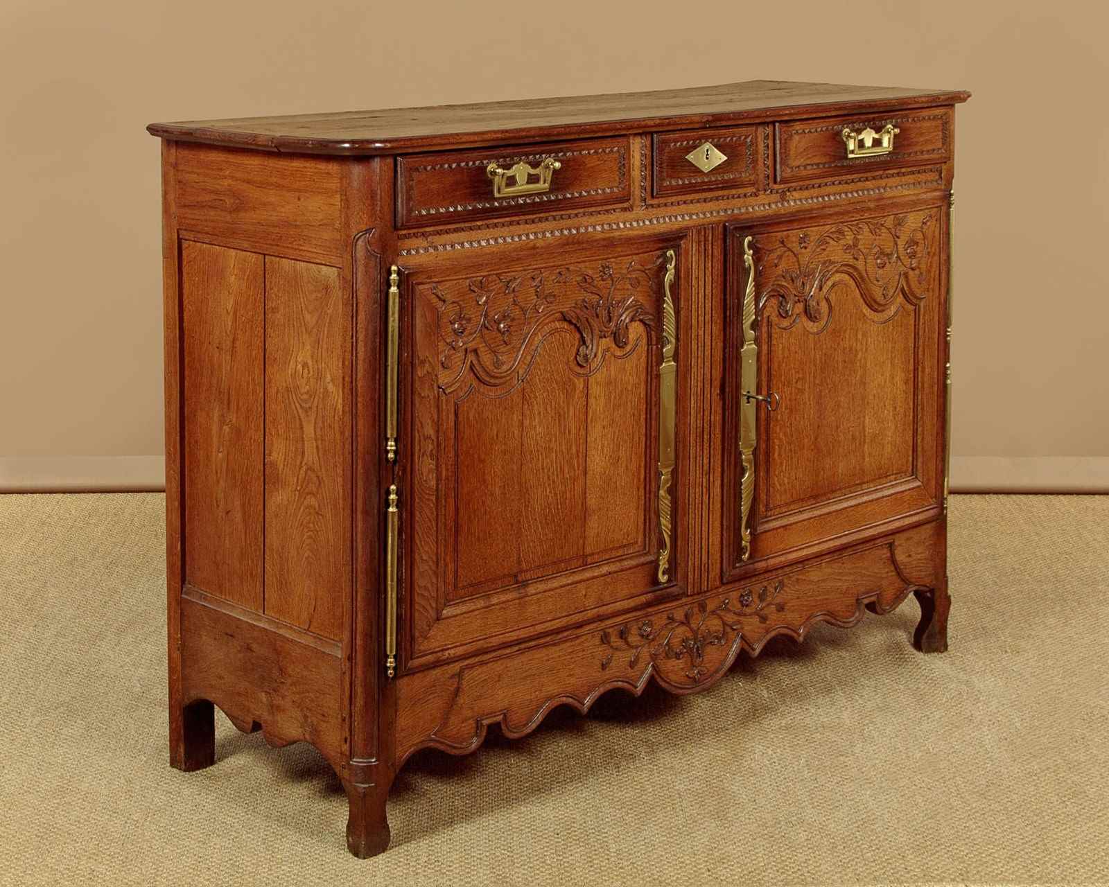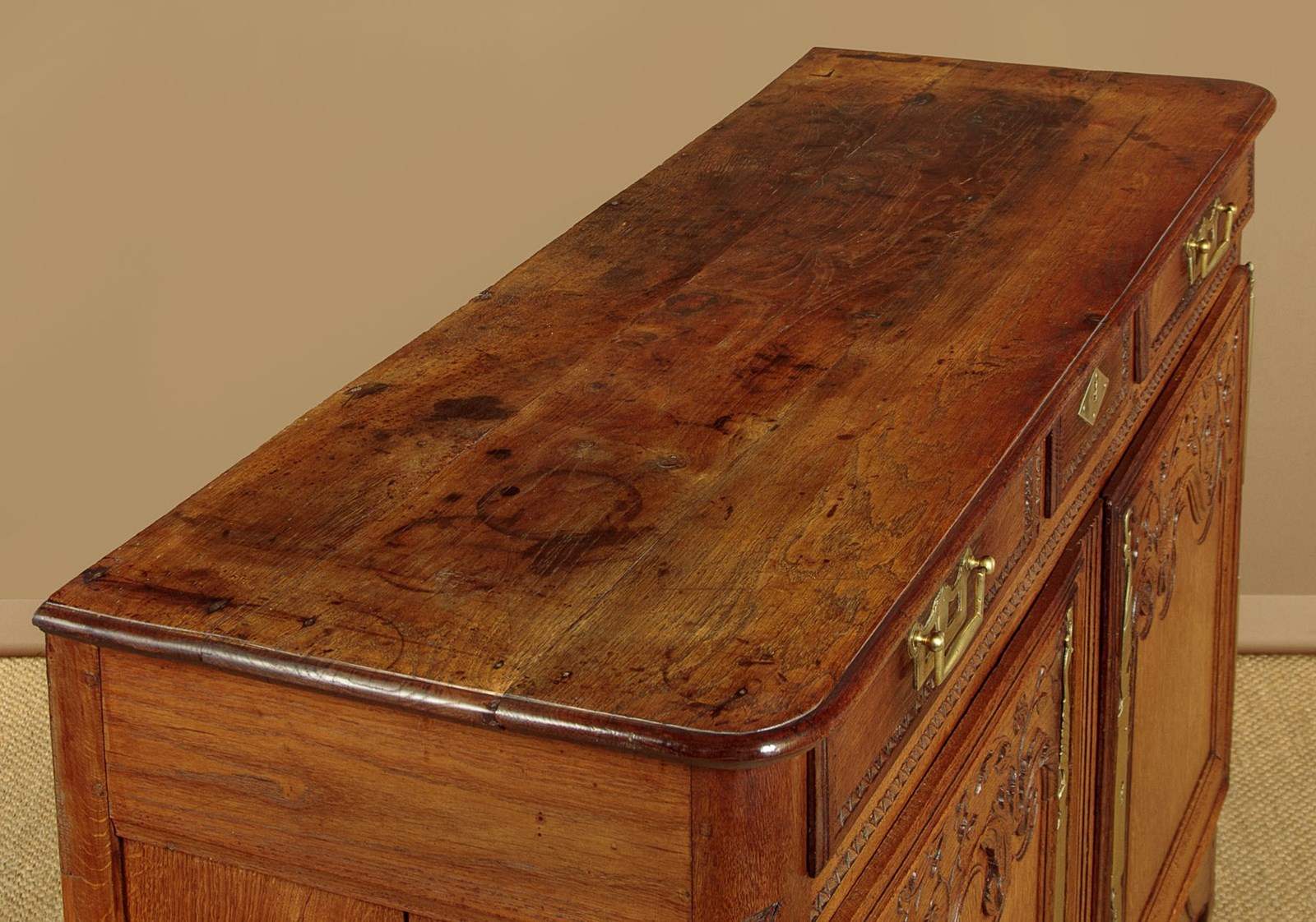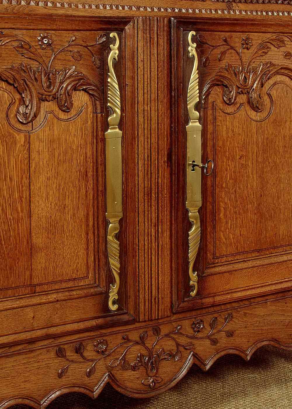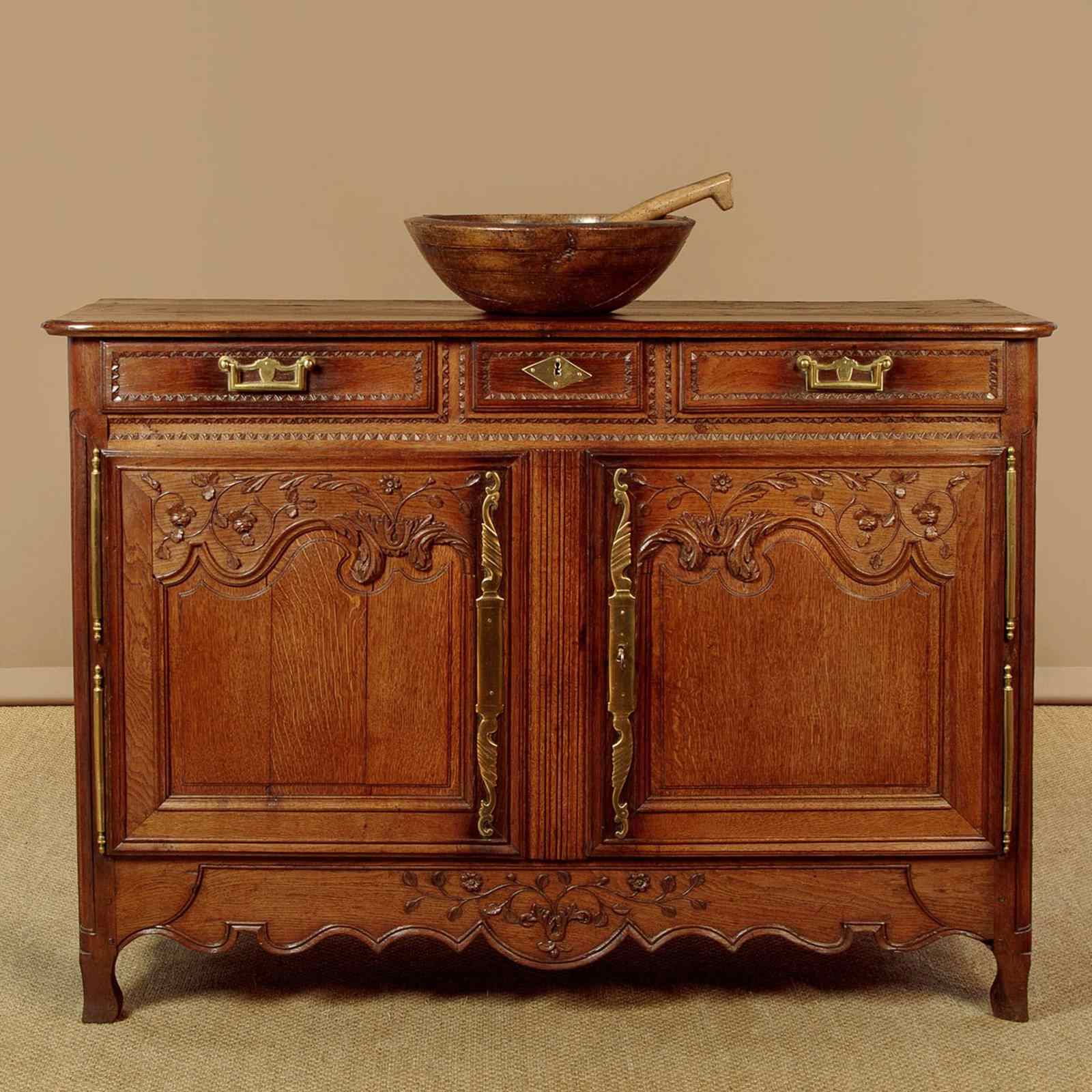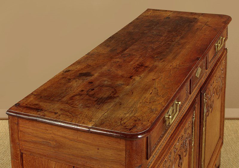 Superb late 18th.c. French oak dresser base c.1790. Useful small size, just 57" wide. Three plank top with a simple moulded edge over three drawers and a two door cupboard base fitted with a single shelf inside (depth 17"). Exceptional decorative front with lovely carved foliate detail over the the extravagantly shaped raised and moulded door panels with vertical reeded trim at the centre. Carved moulding around the drawer fronts, repeated as a slim frieze below. Retaining the original brass handles, long shaped and chased brass escutcheon plates and hinges. Attractively shaped apron to the bottom edge, moulded and carved with further floral detail at the front, left plain at the sides. Moulded detail to the front corner stiles over shaped front feet. Oak panelled sides and rear, oak shelf and floor boards. Excellent colour and condition, cleaned and waxed in our workshops. Original key supplied.