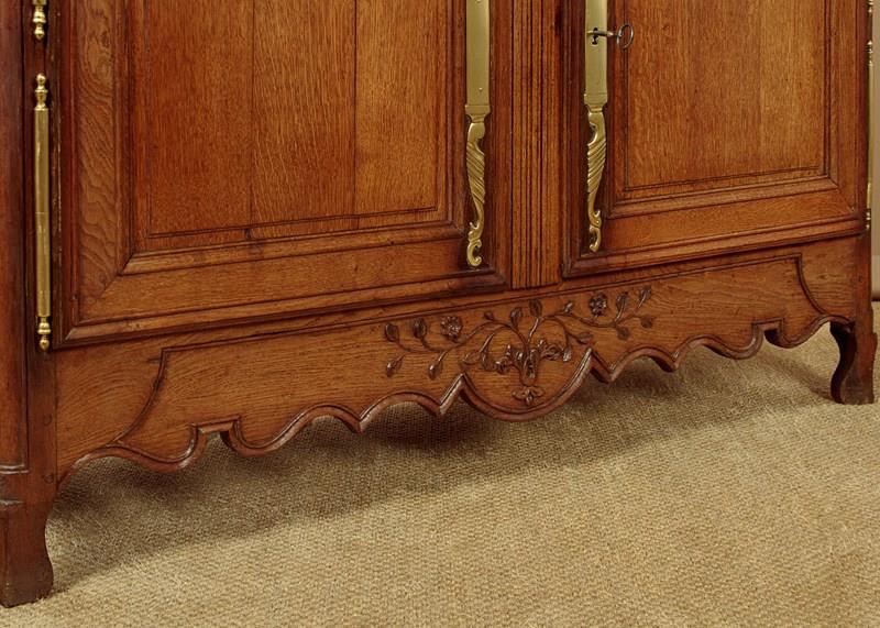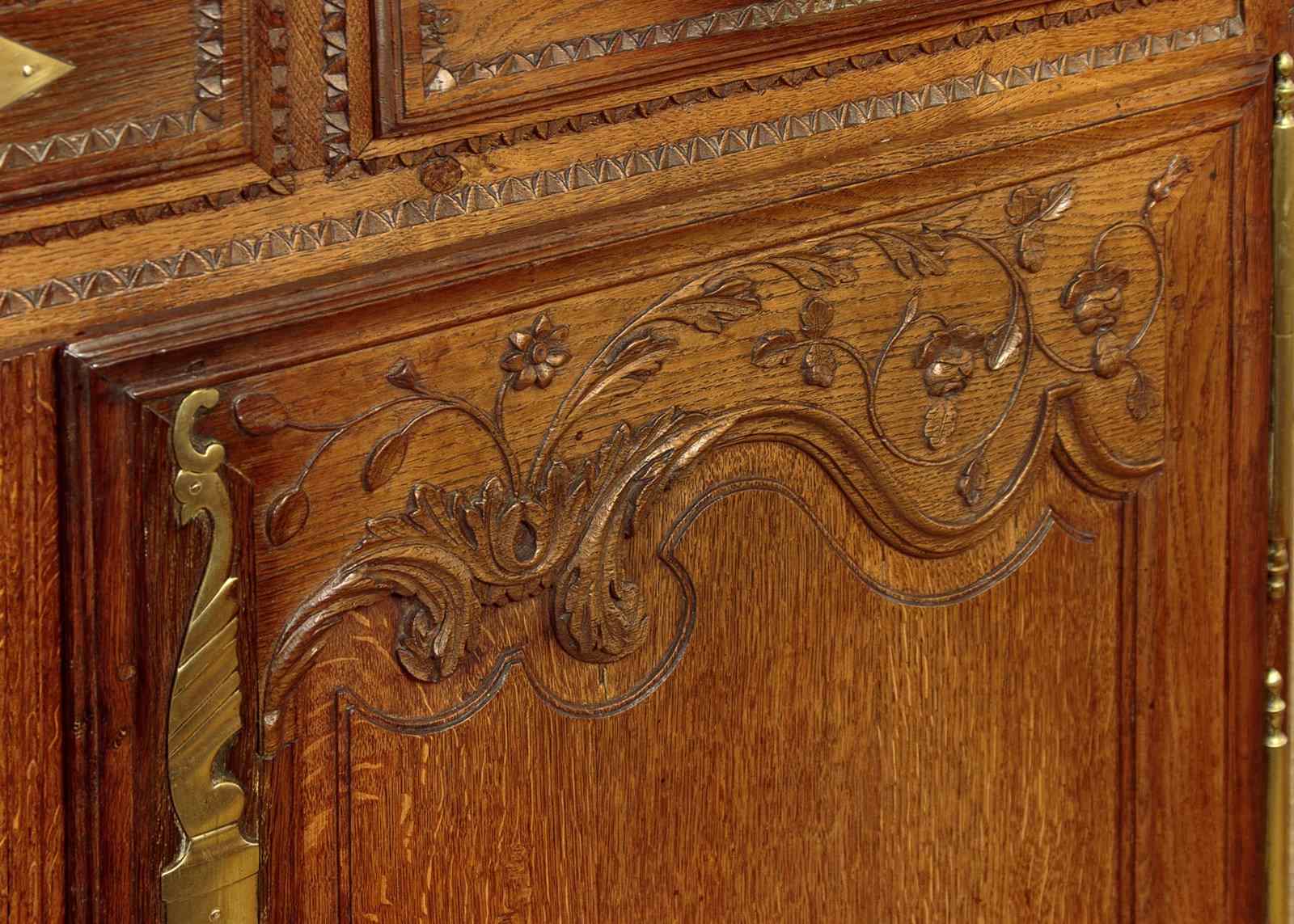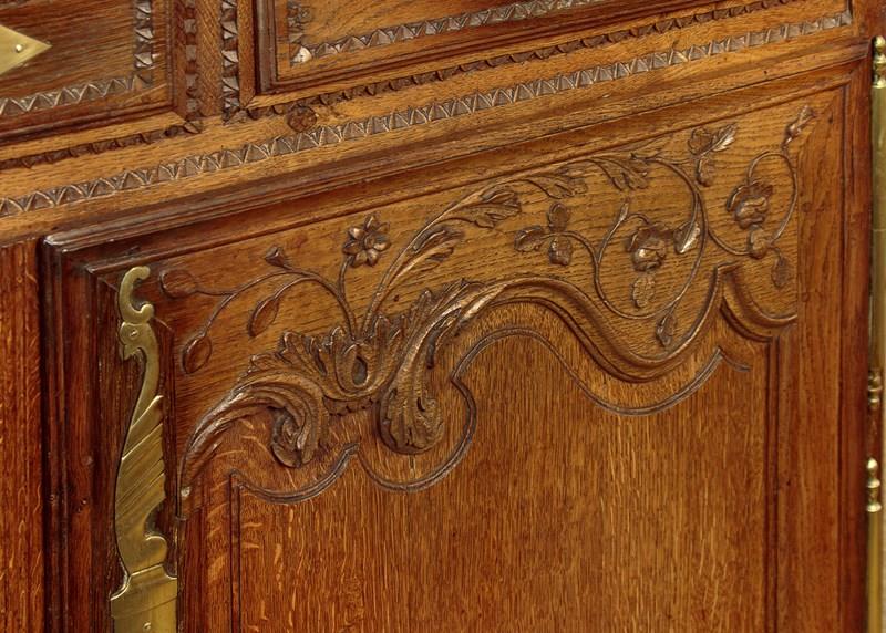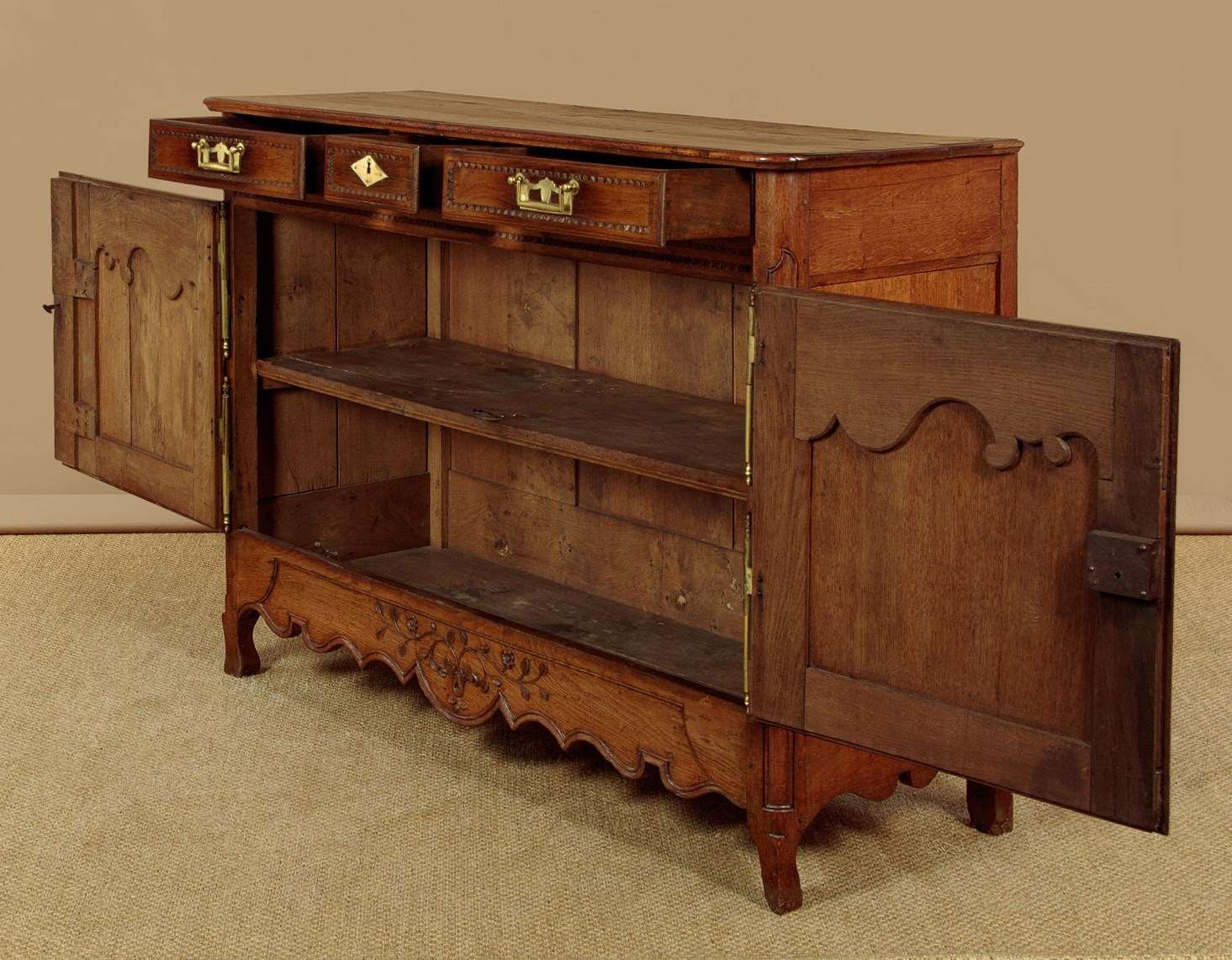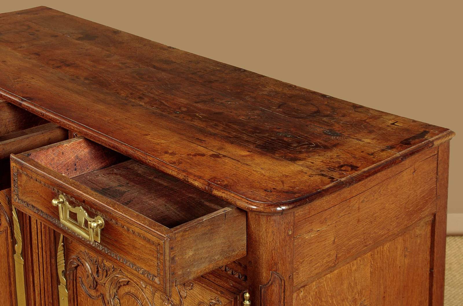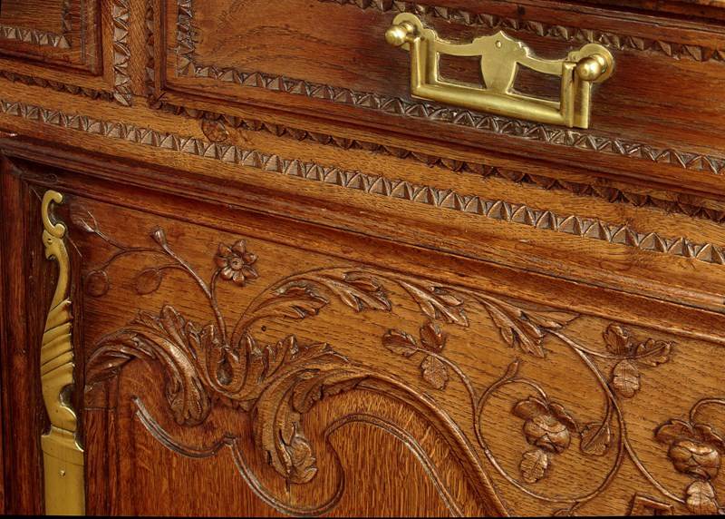 Superb late 18th.c. French oak dresser base c.1790. Useful small size, just 57" wide. Three plank top with a simple moulded edge over three drawers and a two door cupboard base fitted with a single shelf inside (depth 17"). Exceptional decorative front with lovely carved foliate detail over the the extravagantly shaped raised and moulded door panels with vertical reeded trim at the centre. Carved moulding around the drawer fronts, repeated as a slim frieze below. Retaining the original brass handles, long shaped and chased brass escutcheon plates and hinges. Attractively shaped apron to the bottom edge, moulded and carved with further floral detail at the front, left plain at the sides. Moulded detail to the front corner stiles over shaped front feet. Oak panelled sides and rear, oak shelf and floor boards. Excellent colour and condition, cleaned and waxed in our workshops. Original key supplied.