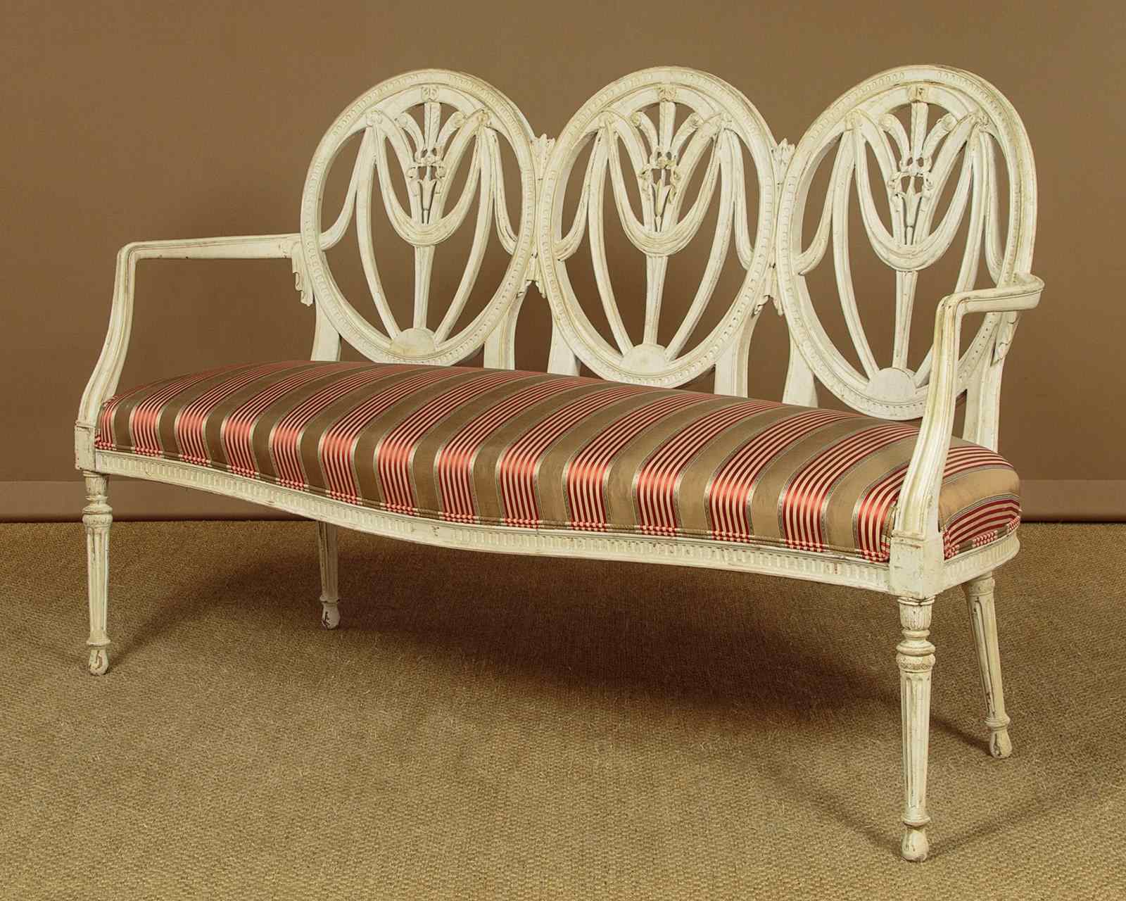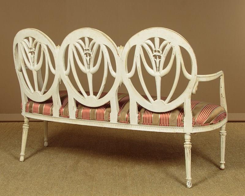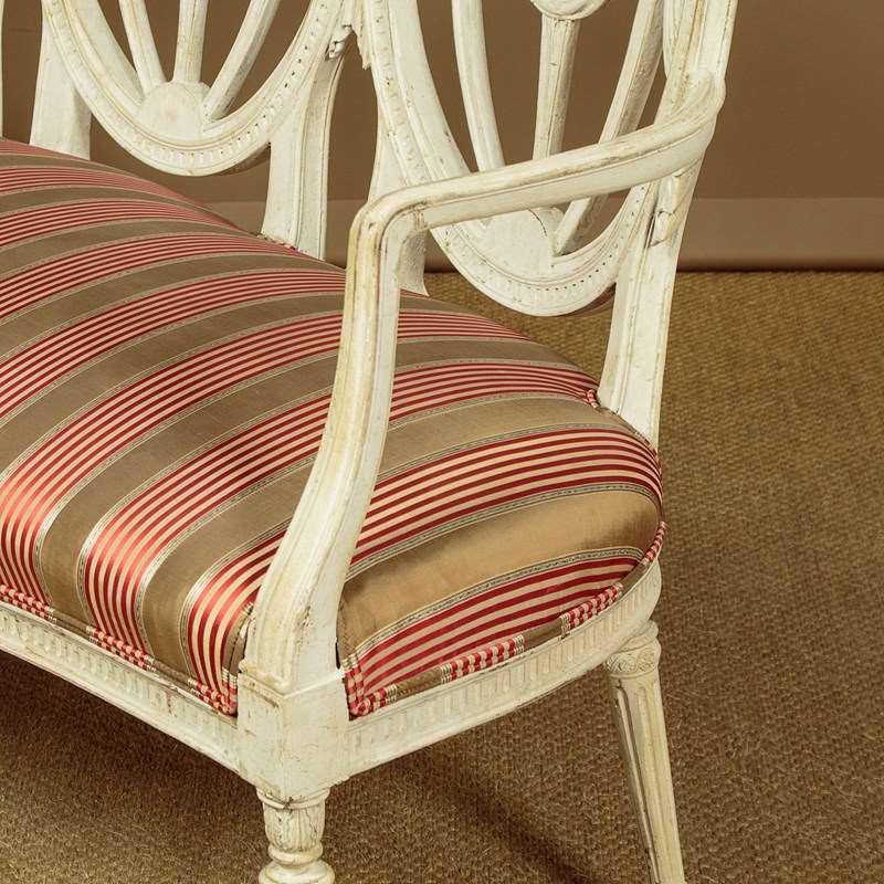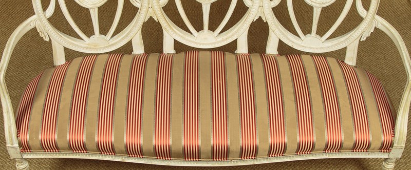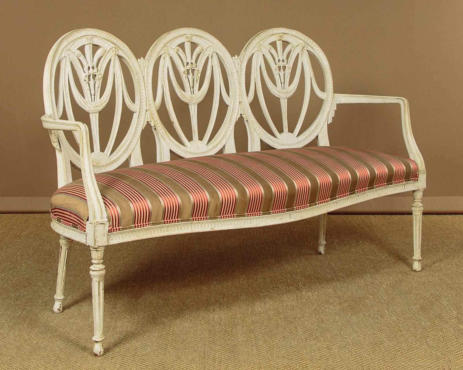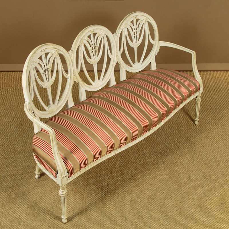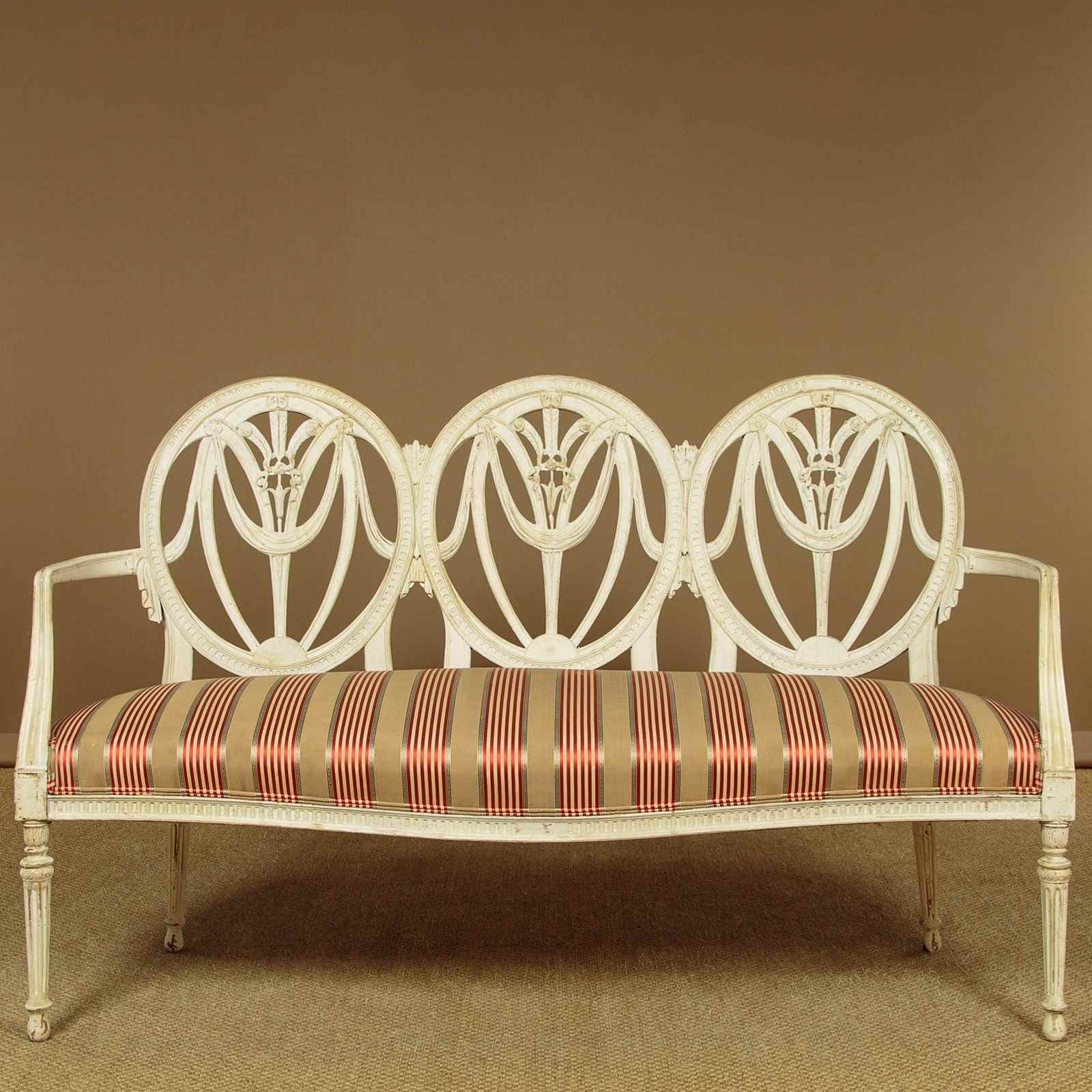 An elegant French carved and painted triple back settee c.1900. Oval back rests carved with a three feathers motif and cloth swags. Slim curving arms on swept supports. Sprung seat upholstered in a Regency stripe silk fabric. Fluted apron below the seat and raised on turned and fluted legs with carved detail the tops front and rear. Some obvious wear to the paintwork which is rubbed through in places to reveal grey underpainting and the hardwood frame below. Serviceable covers with some small watermarks and minor wear. Solid and sturdy with good firm springs in the seat.