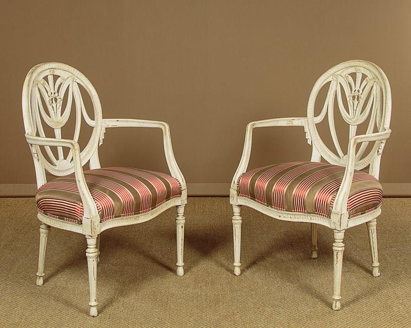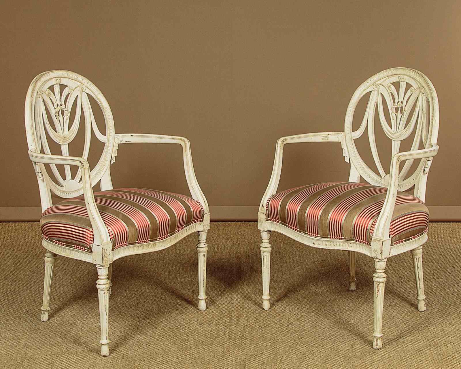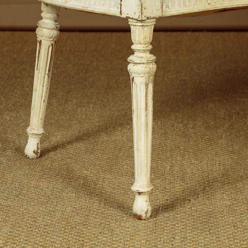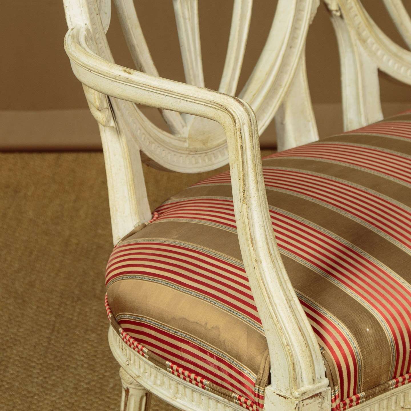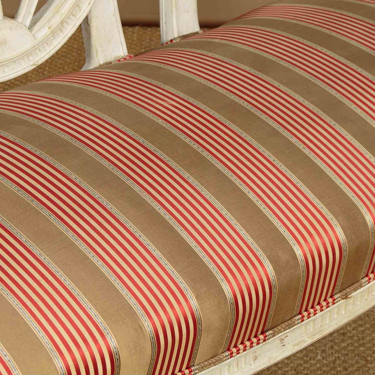 An elegant French carved and painted triple back settee c.1900. Oval back rests carved with a three feathers motif and cloth swags. Slim curving arms on swept supports. Sprung seat upholstered in a Regency stripe silk fabric. Fluted apron below the seat and raised on turned and fluted legs with carved detail the tops front and rear. Some obvious wear to the paintwork which is rubbed through in places to reveal grey underpainting and the hardwood frame below. Serviceable covers with some small watermarks and minor wear. Solid and sturdy with good firm springs in the seat.