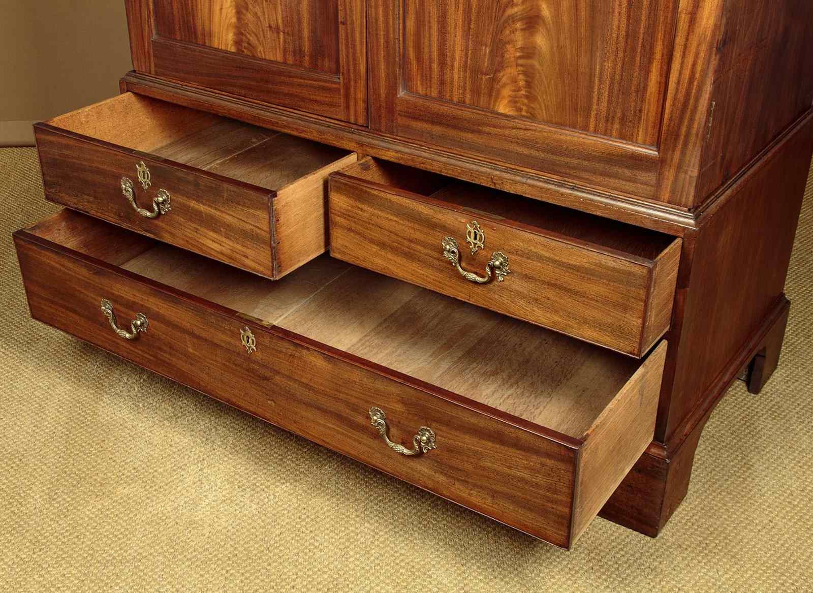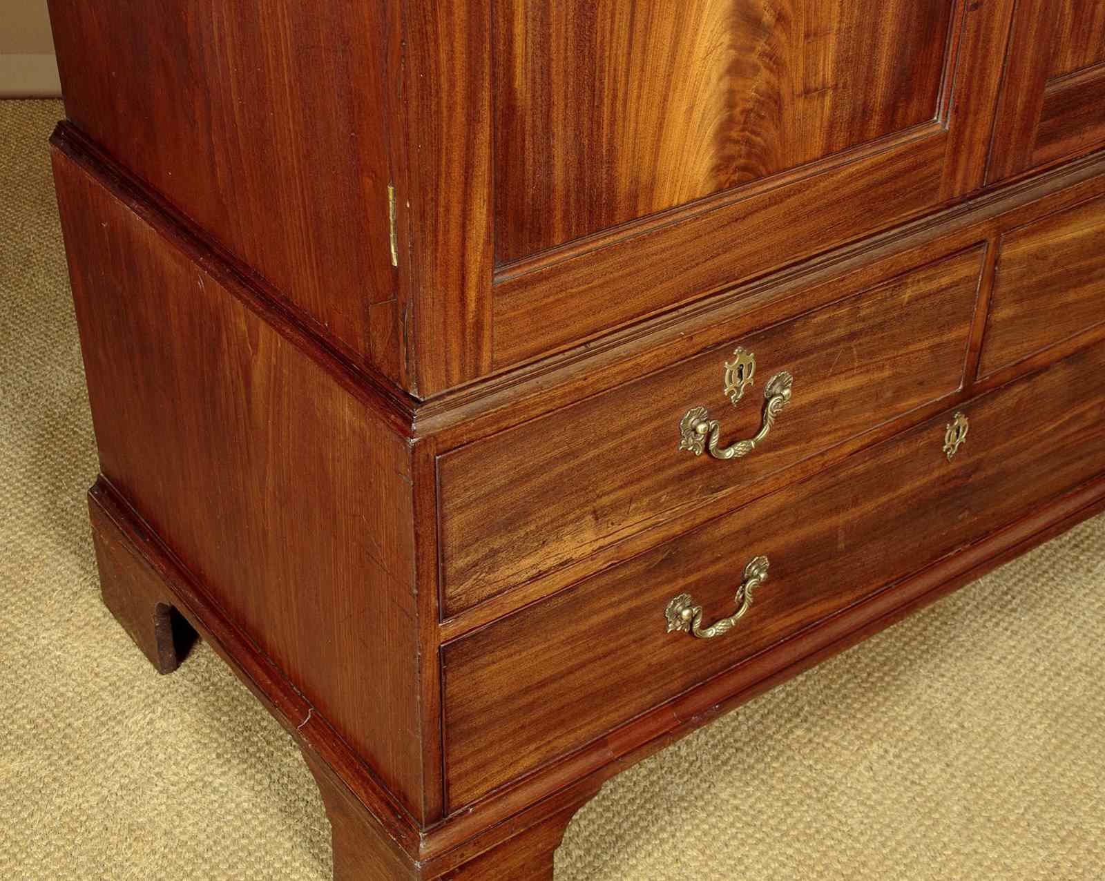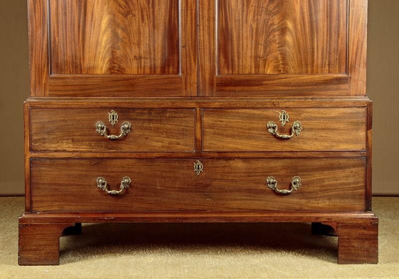 George III mahogany linen press or wardrobe c.1800. In two pieces with a two door cupboard top fitted with three sliding shelves and a drawer, on a low waisted base with two short and one long drawer. Top could be fitted with a hanging rail if preferred (internal depth 23", height above the drawer 36"). Slim moulded cornice over doors with particularly well figured matching solid flame mahogany door panels. Solid mahogany drawer fronts with cockbeaded edges and good quality Georgian pattern brass handles. Moulded trim around the waist and base. Raised on tall bracket feet at the front and sides. Solid mahogany sides, oak drawer linings and back panels. Very good colour and condition with some previous repairs and restorations, cleaned and waxed in our workshops. Key supplied.