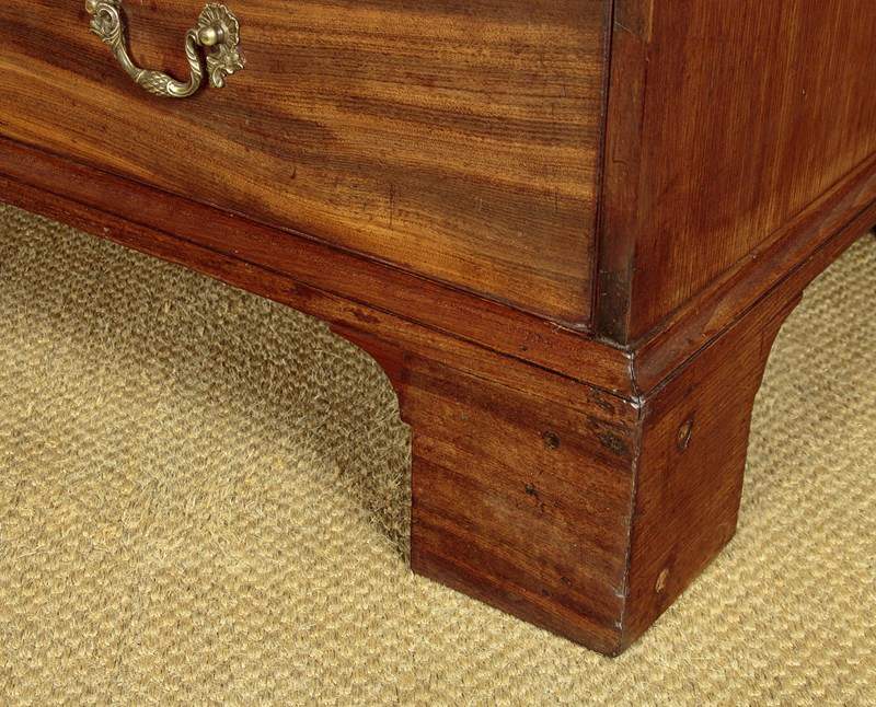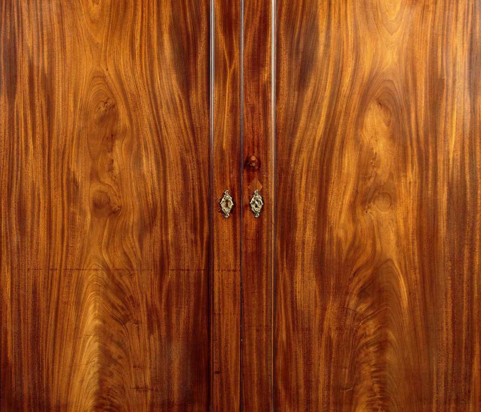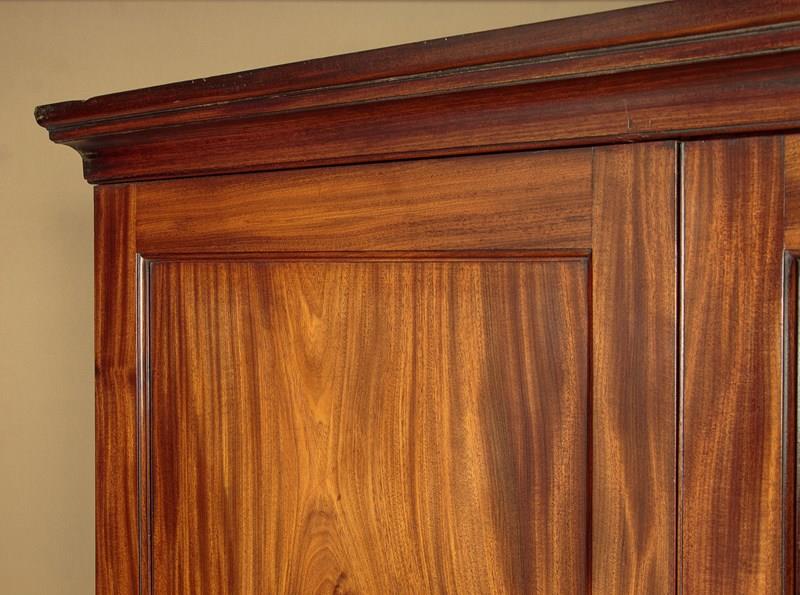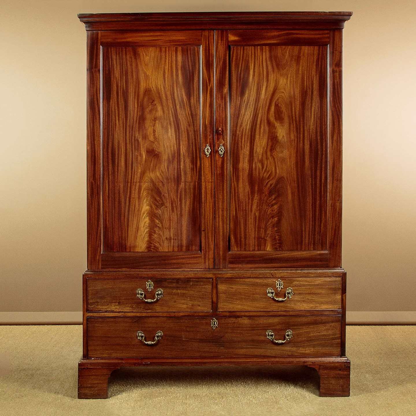 George III mahogany linen press or wardrobe c.1800. In two pieces with a two door cupboard top fitted with three sliding shelves and a drawer, on a low waisted base with two short and one long drawer. Top could be fitted with a hanging rail if preferred (internal depth 23", height above the drawer 36"). Slim moulded cornice over doors with particularly well figured matching solid flame mahogany door panels. Solid mahogany drawer fronts with cockbeaded edges and good quality Georgian pattern brass handles. Moulded trim around the waist and base. Raised on tall bracket feet at the front and sides. Solid mahogany sides, oak drawer linings and back panels. Very good colour and condition with some previous repairs and restorations, cleaned and waxed in our workshops. Key supplied.