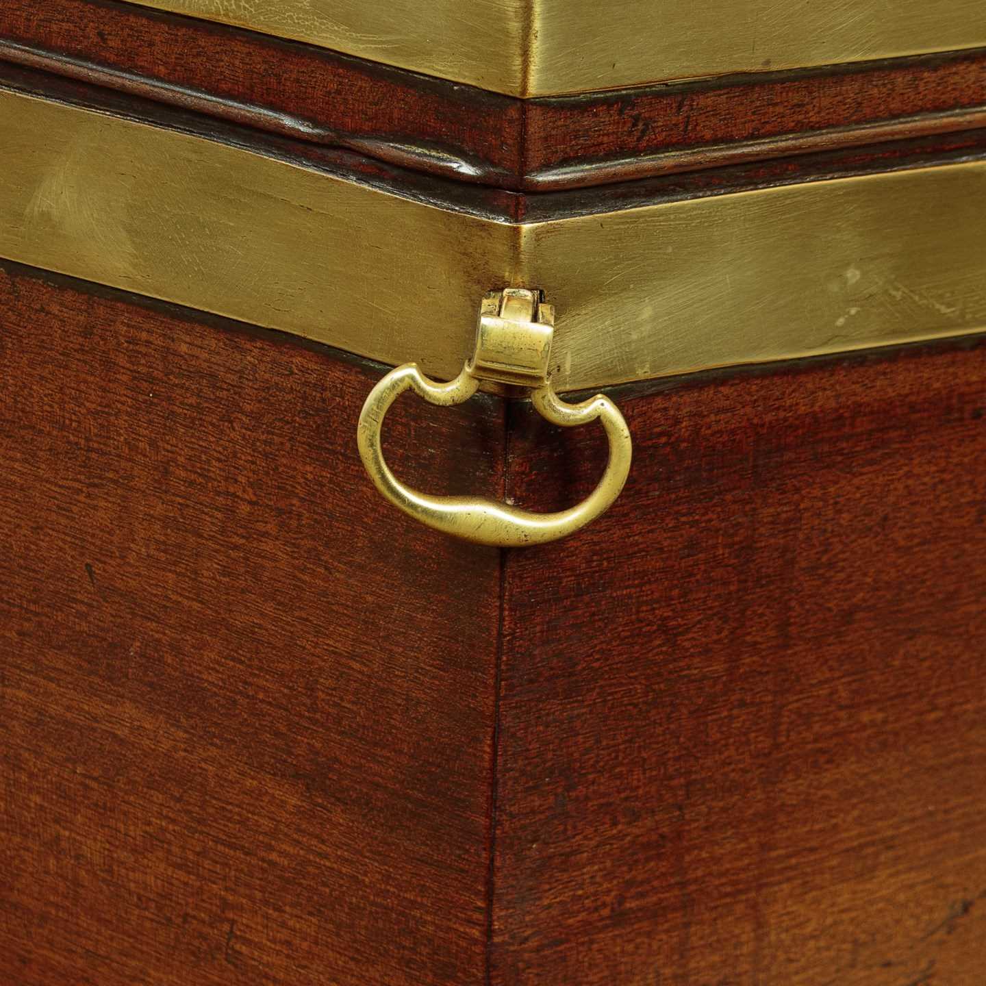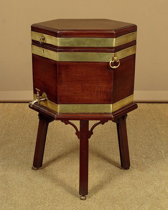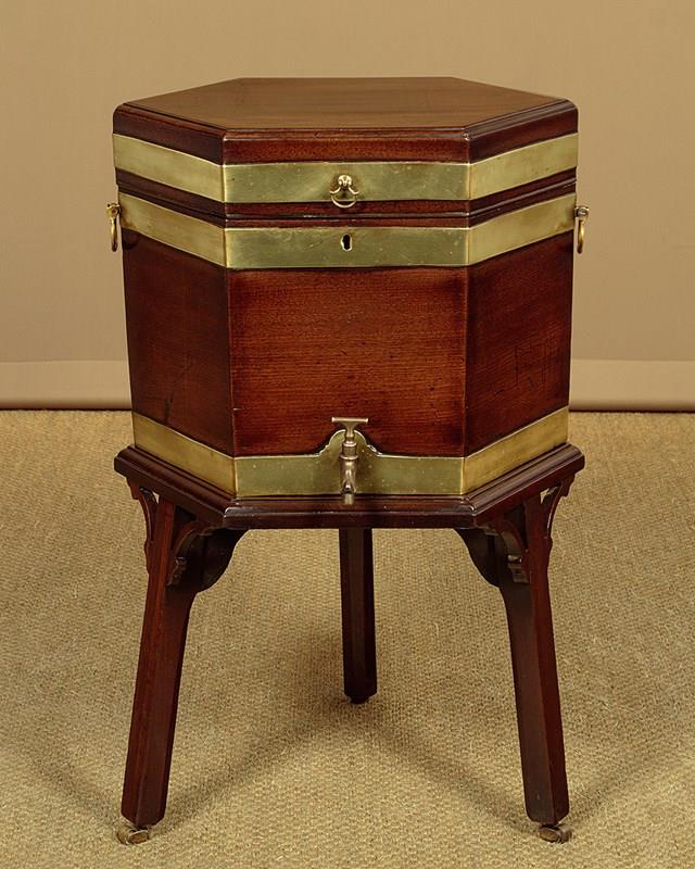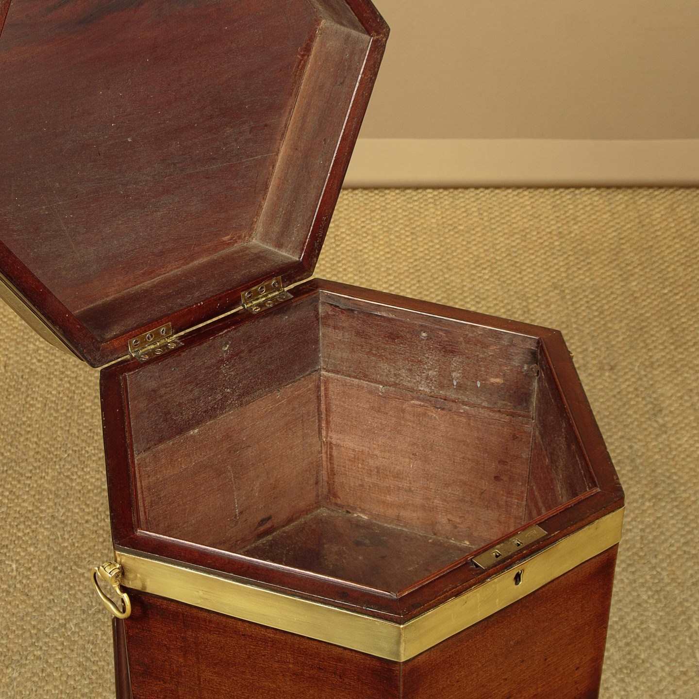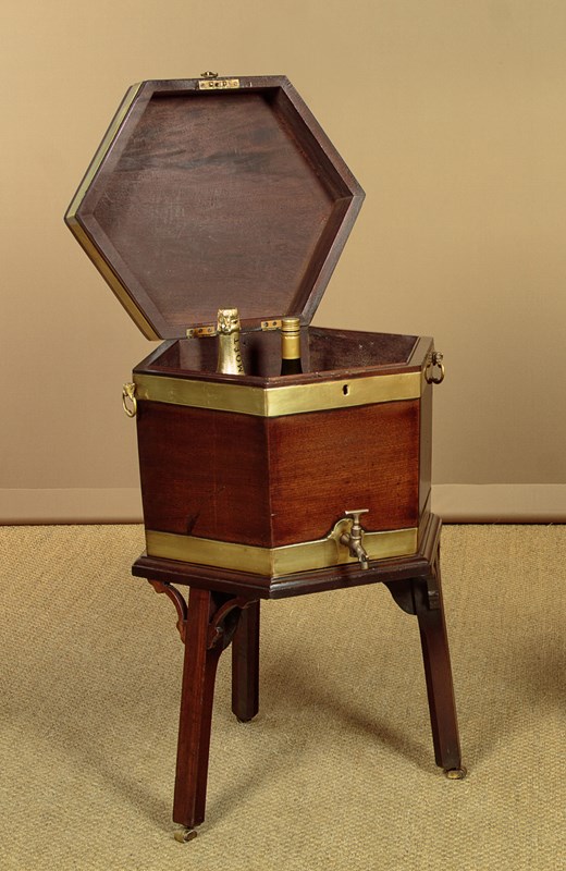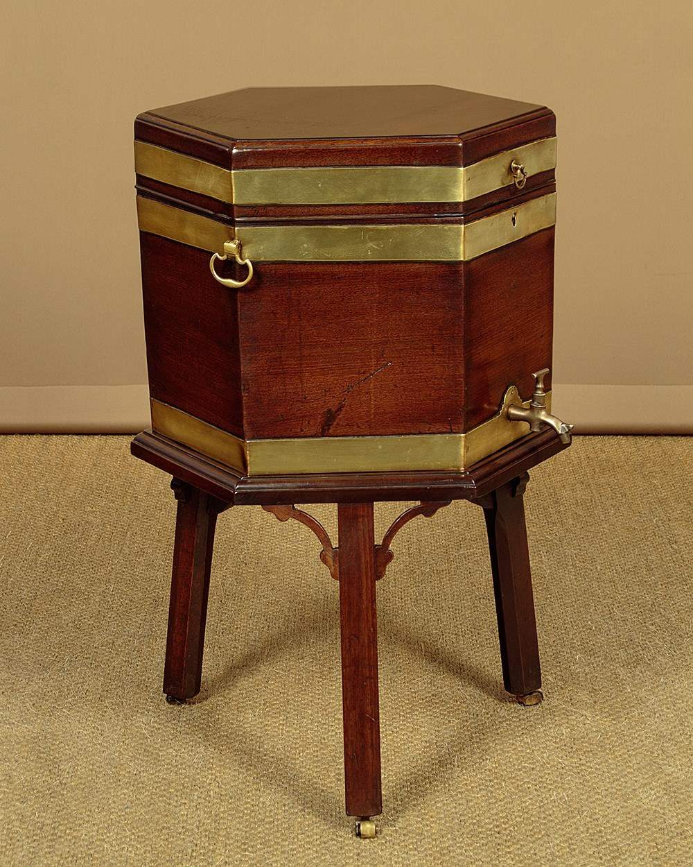 Large George III mahogany cellarette c.1800. Of tapering octagonal form with a useful flat-top opening to reveal space inside for 19 standard wine bottles (internal height 13"). Brass bindings around the lid and body, large carry handles at the sides and retaining the original drainage tap (the cellarette would originally have had a lead or zinc lining allowing bottles to be cooled in ice water). On a tripod stand with a moulded edge, legs splayed for stability with unusual pierced brackets at the tops and raised on the original brass barrel castors. Very good colour and condition, cleaned and waxed in our workshops.