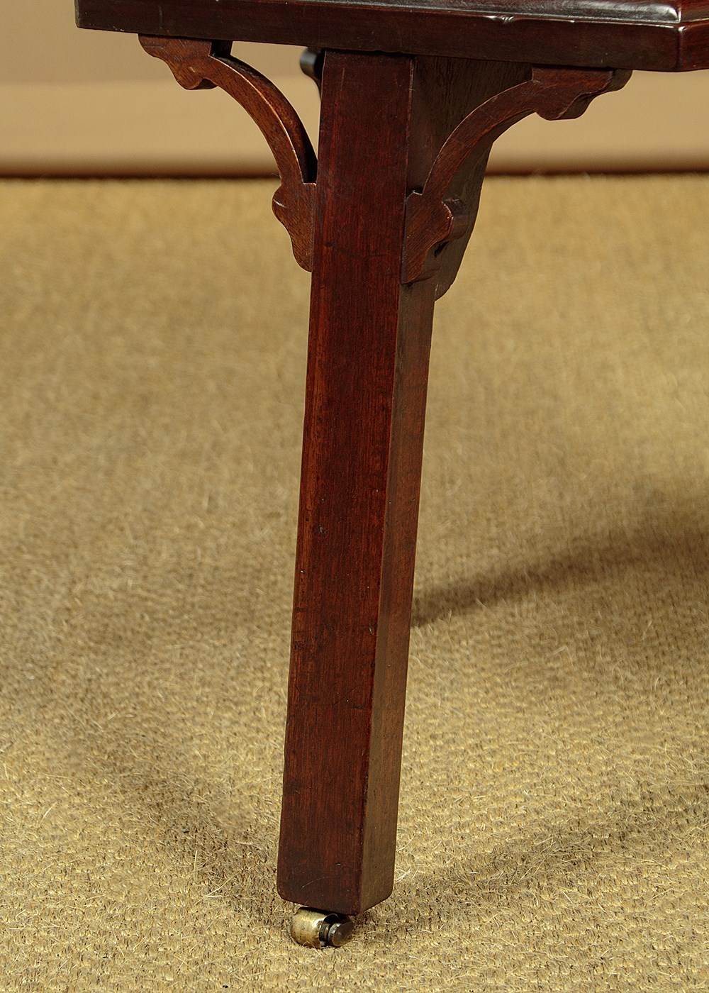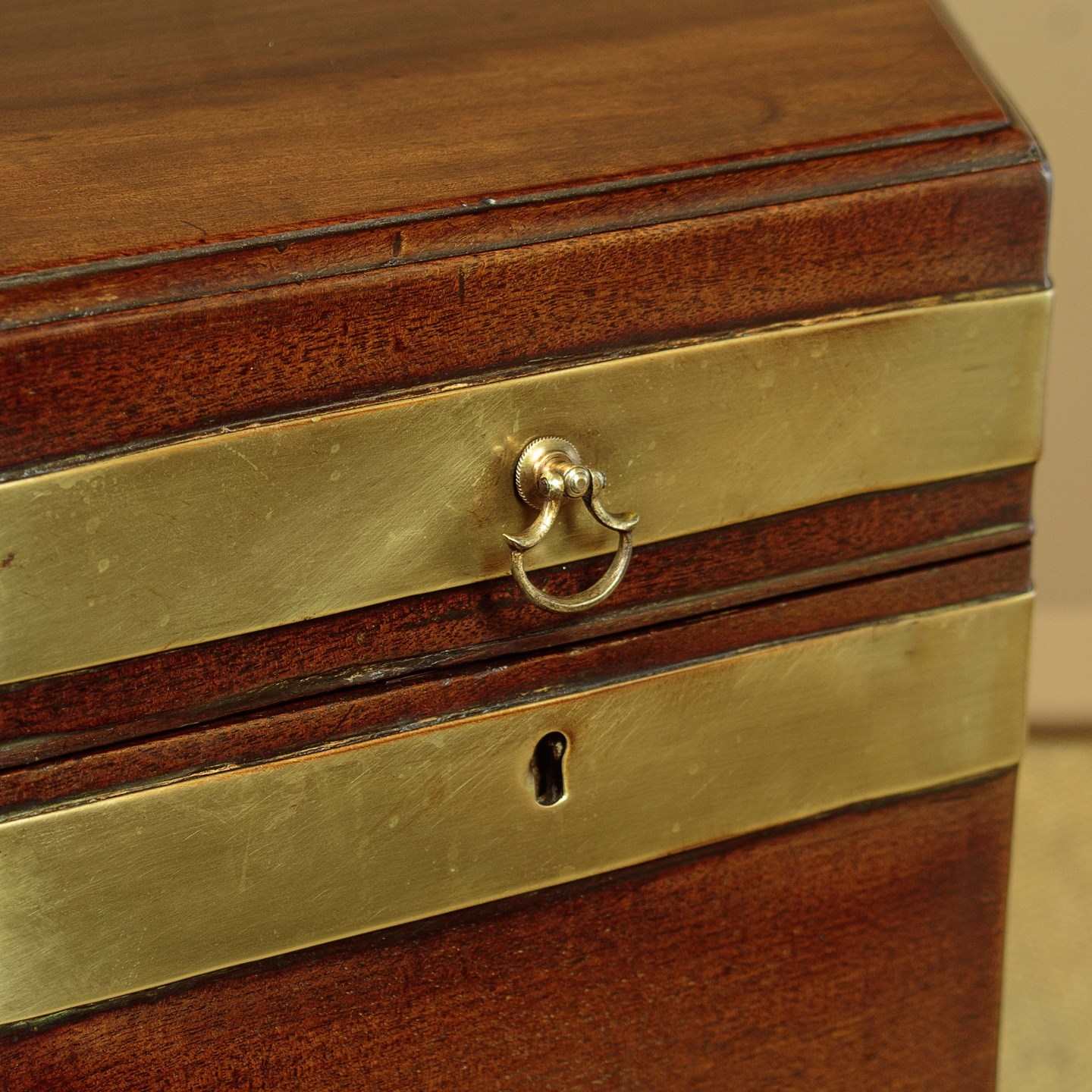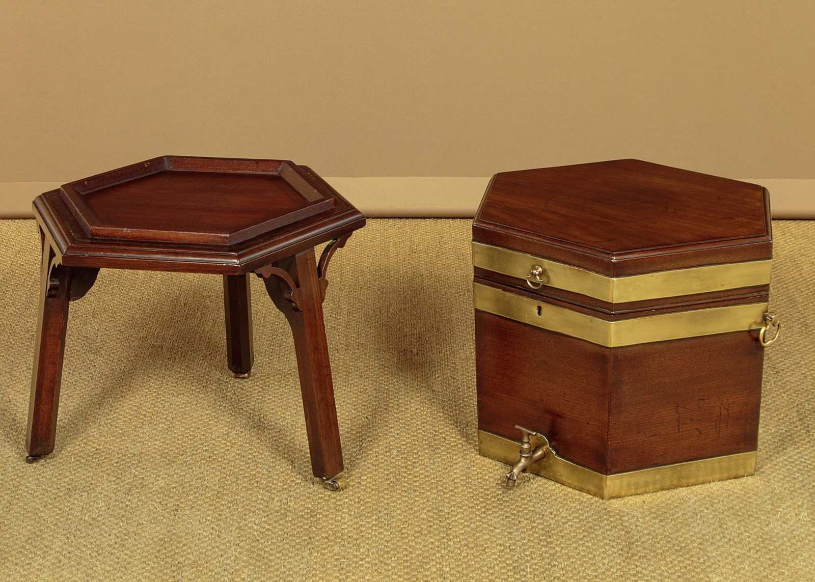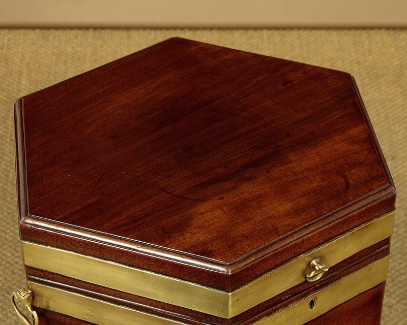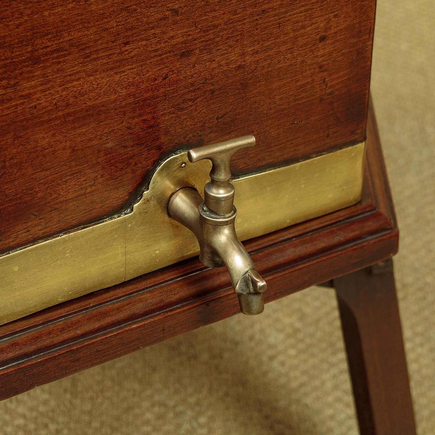 Large George III mahogany cellarette c.1800. Of tapering octagonal form with a useful flat-top opening to reveal space inside for 19 standard wine bottles (internal height 13"). Brass bindings around the lid and body, large carry handles at the sides and retaining the original drainage tap (the cellarette would originally have had a lead or zinc lining allowing bottles to be cooled in ice water). On a tripod stand with a moulded edge, legs splayed for stability with unusual pierced brackets at the tops and raised on the original brass barrel castors. Very good colour and condition, cleaned and waxed in our workshops.