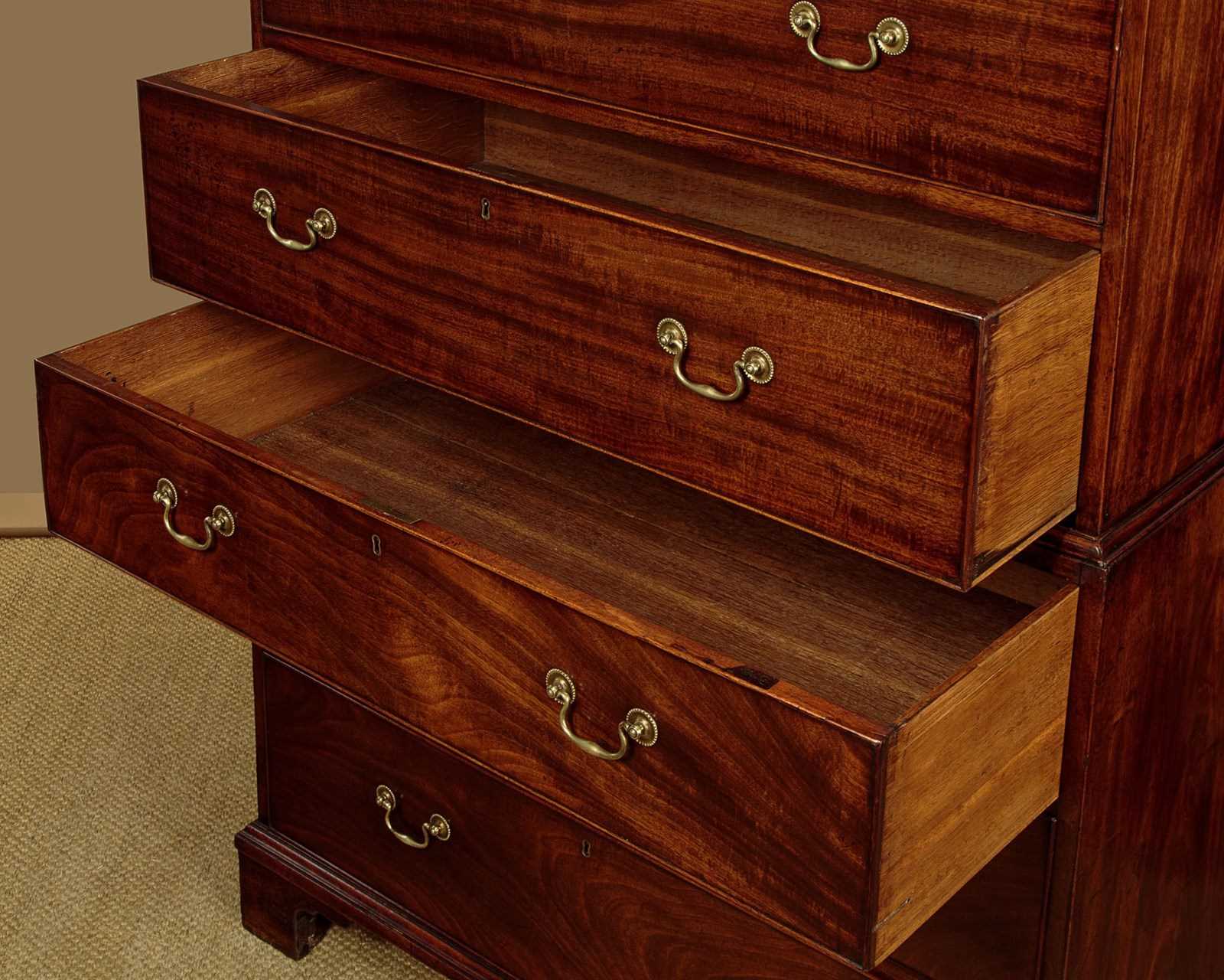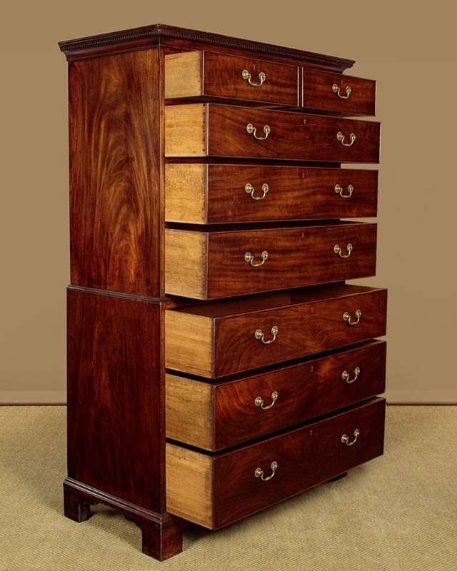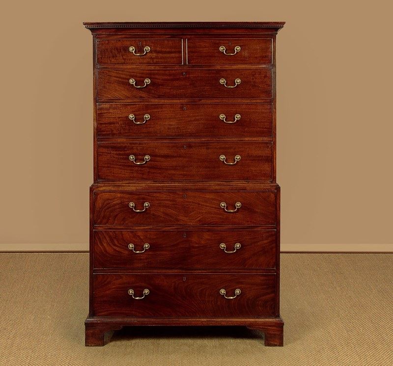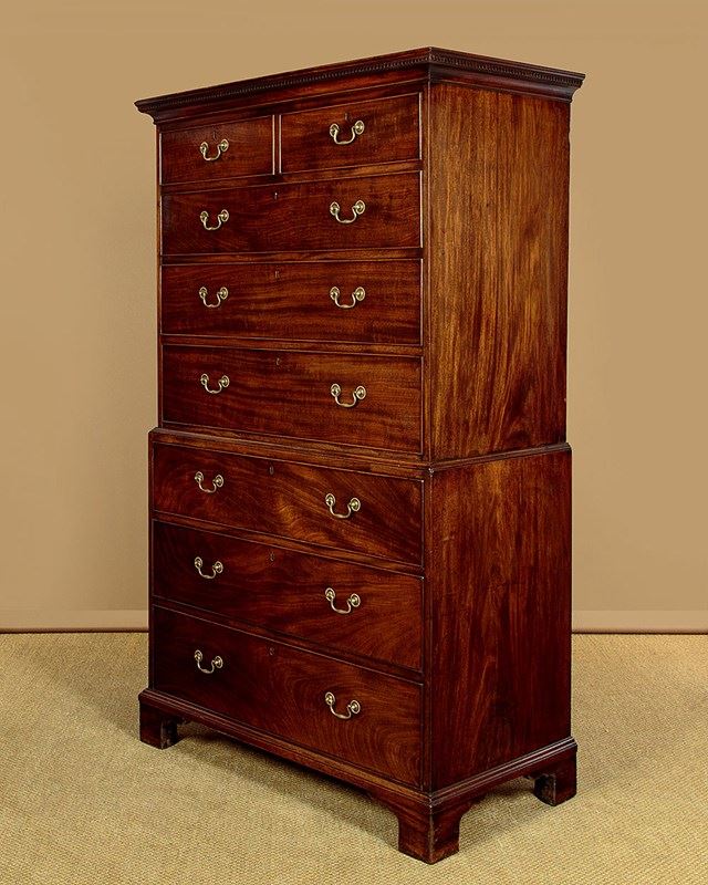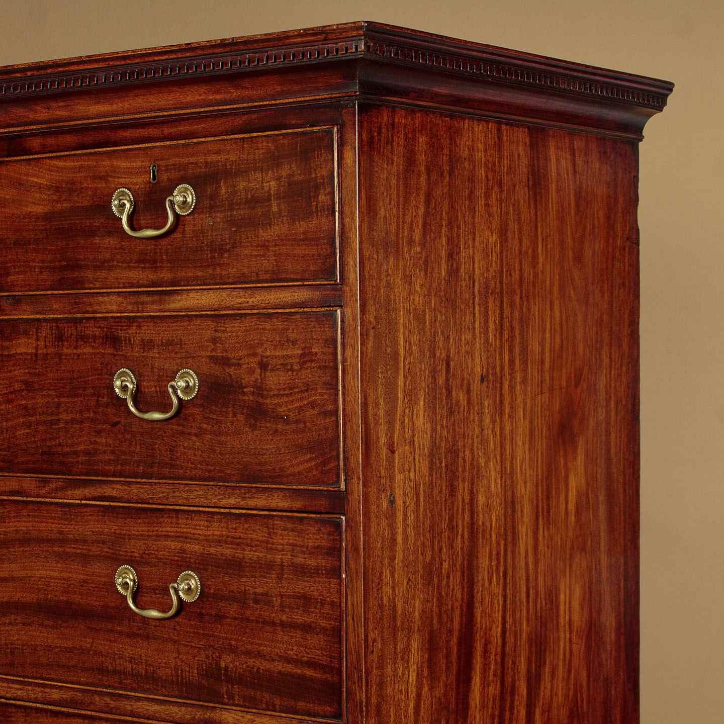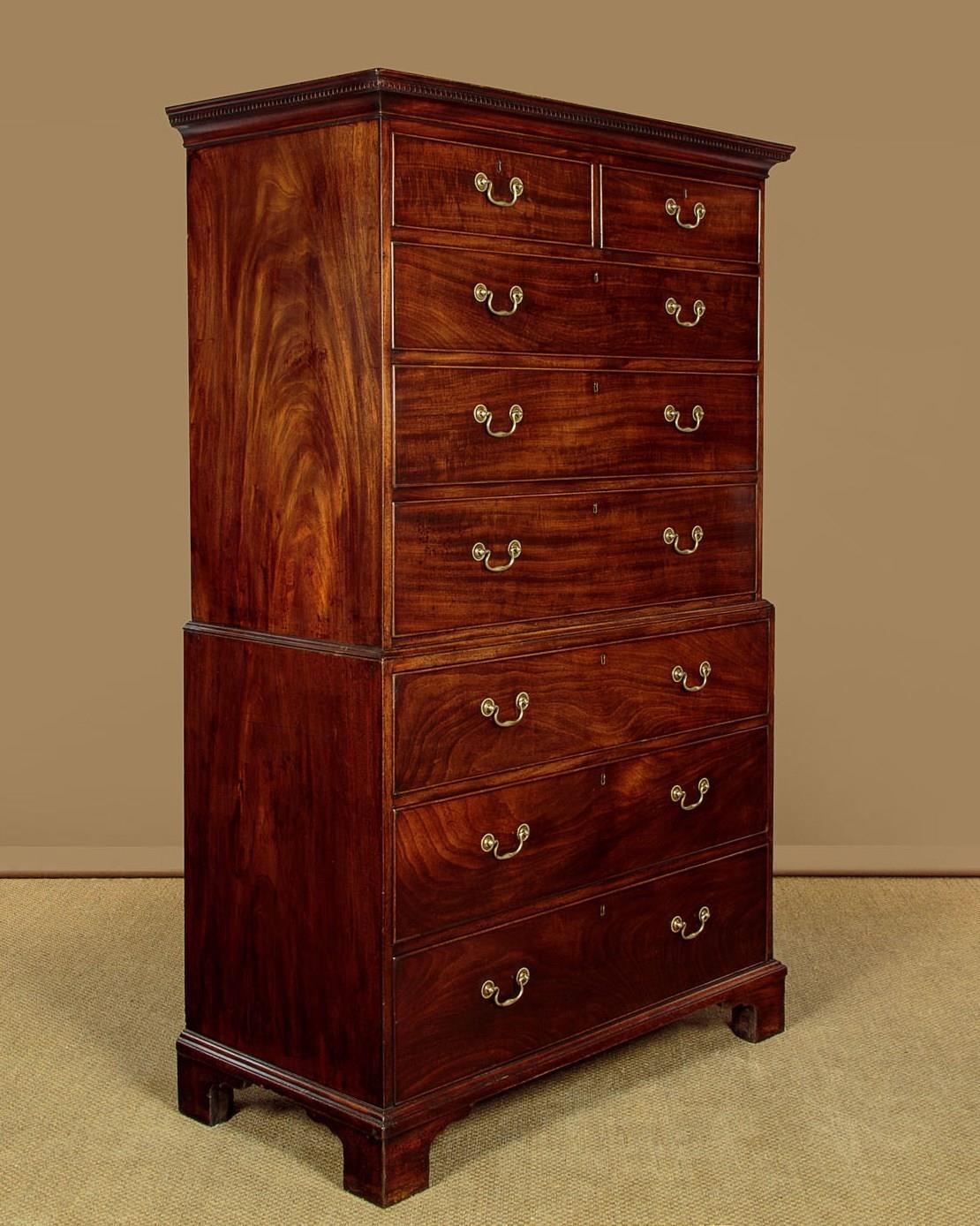Superb George III mahogany chest on chest c.1800. In two sections with two short drawers over six long drawers of graduated height. Slim flared and moulded cornice with a carved dentil frieze. Mahogany veneered drawer fronts with cockbeaded edges and retaining the original brass swan neck handles. Ogee mouldings to the waist and base. Raised on tall bracket feet front and rear. Superior quality with solid mahogany sides and oak drawer linings. Fabulous original colour and excellent condition, cleaned and waxed in our workshops.