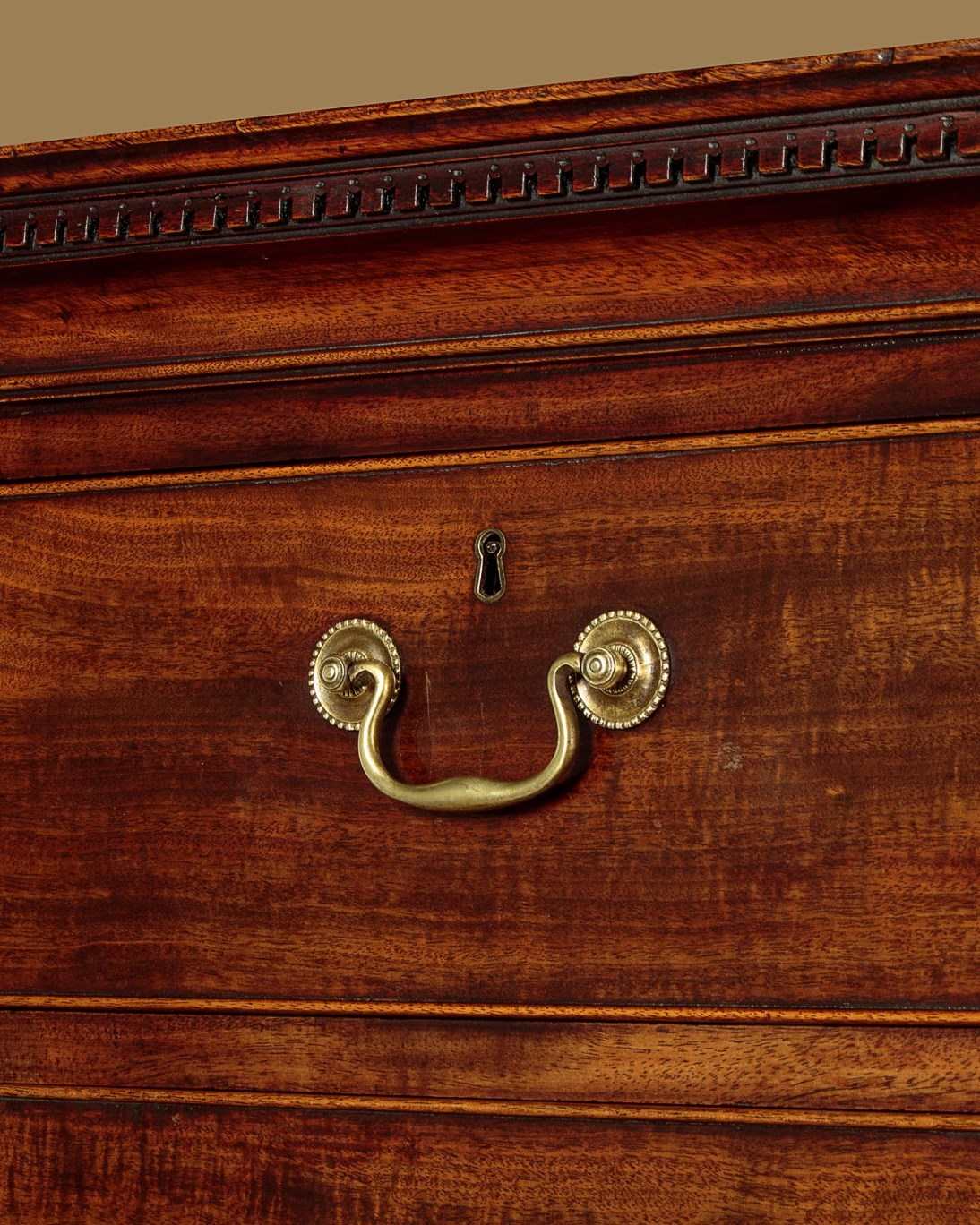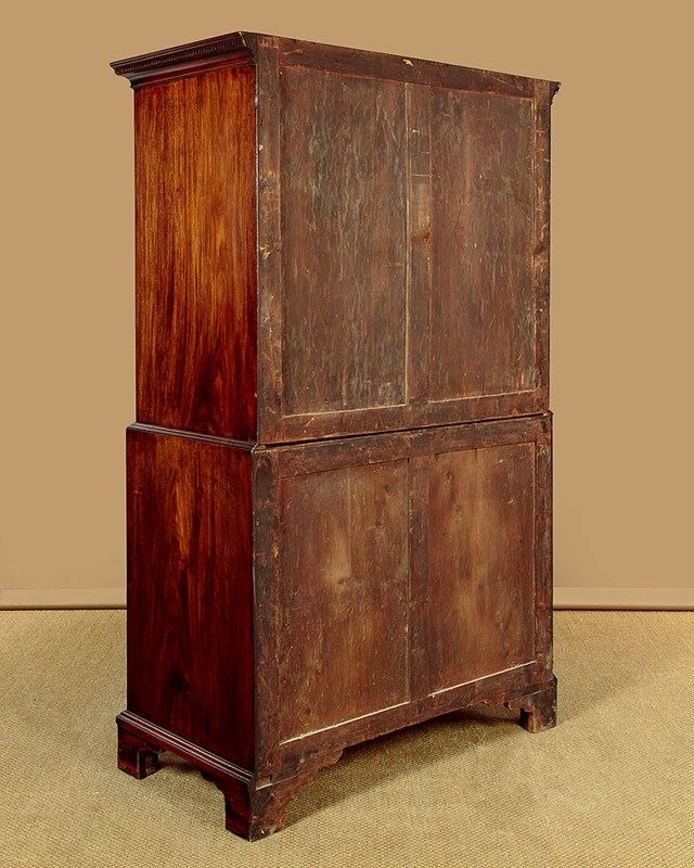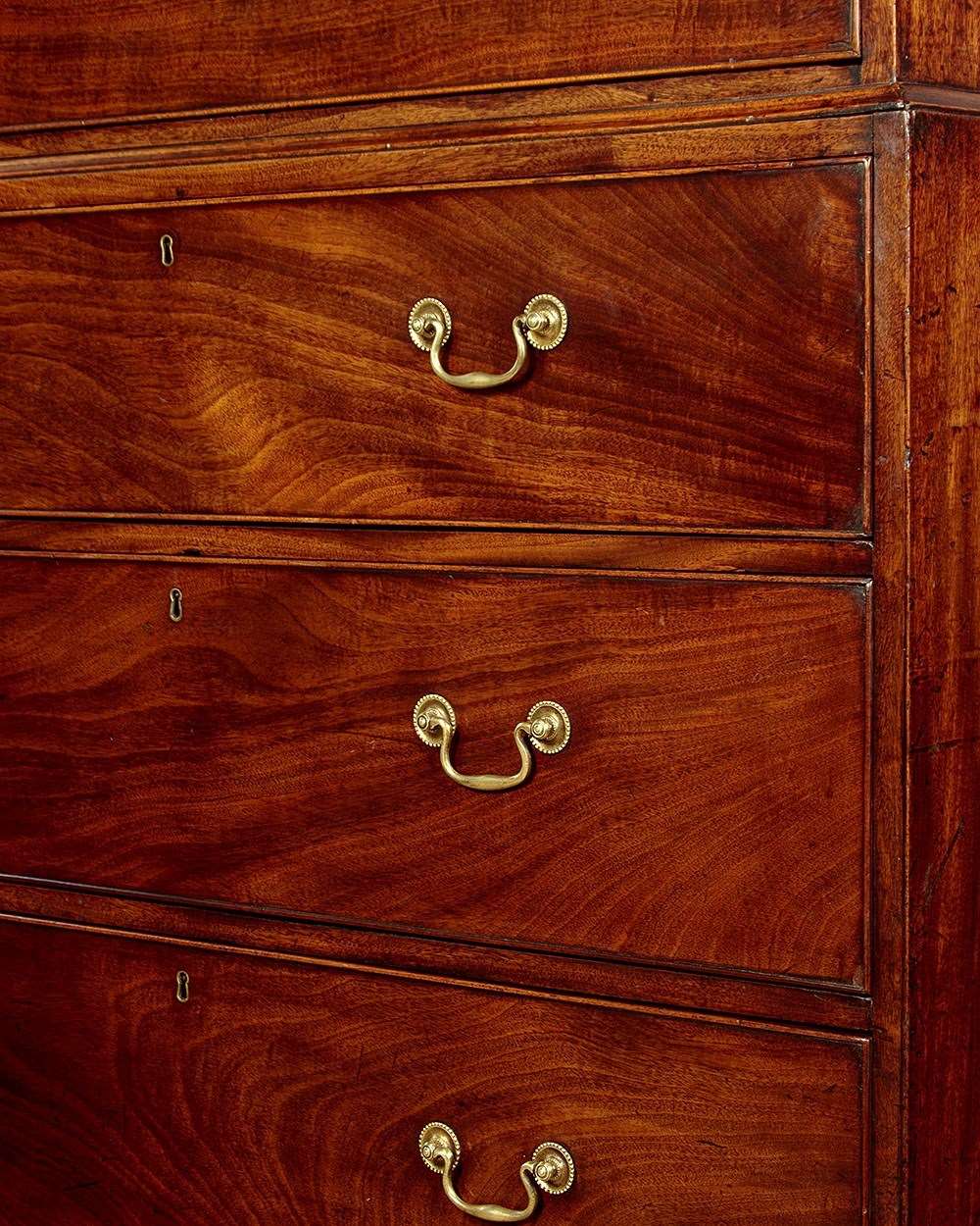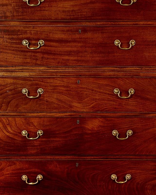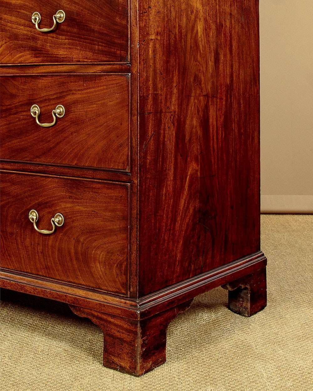 Superb George III mahogany chest on chest c.1800. In two sections with two short drawers over six long drawers of graduated height. Slim flared and moulded cornice with a carved dentil frieze. Mahogany veneered drawer fronts with cockbeaded edges and retaining the original brass swan neck handles. Ogee mouldings to the waist and base. Raised on tall bracket feet front and rear. Superior quality with solid mahogany sides and oak drawer linings. Fabulous original colour and excellent condition, cleaned and waxed in our workshops.