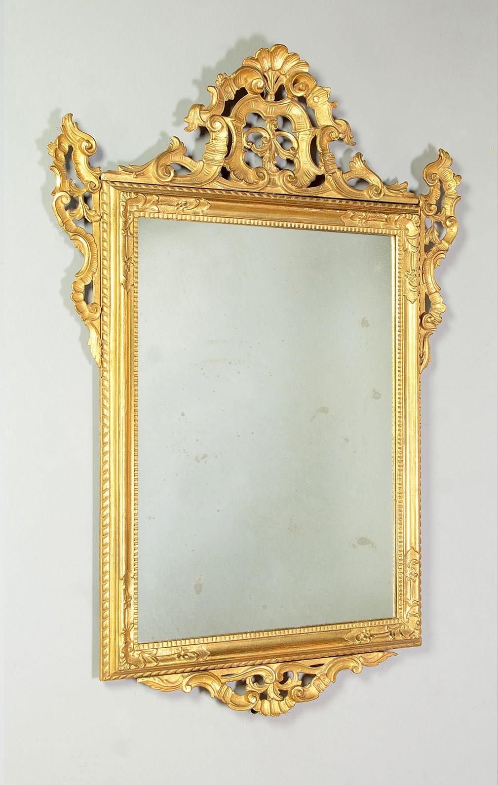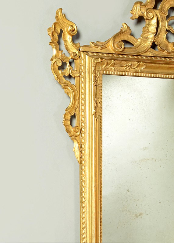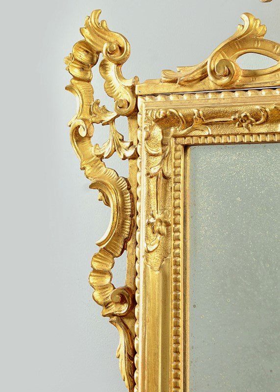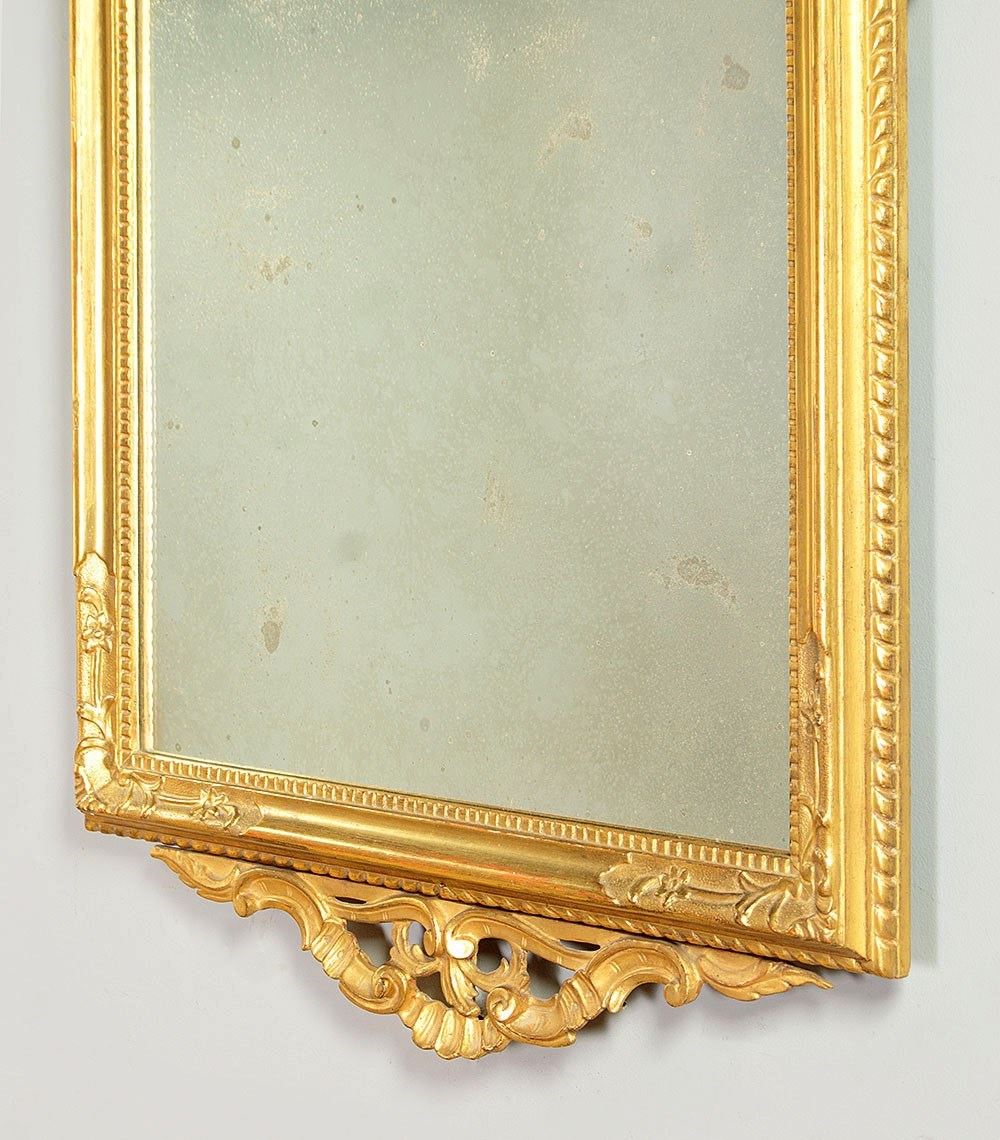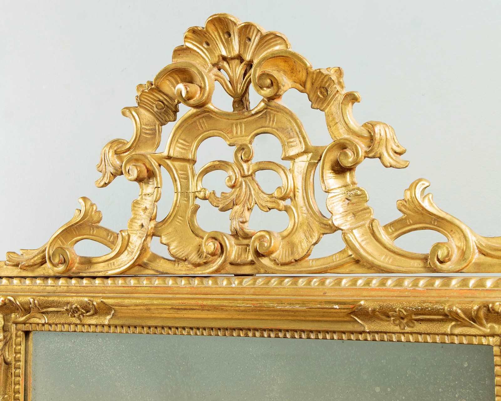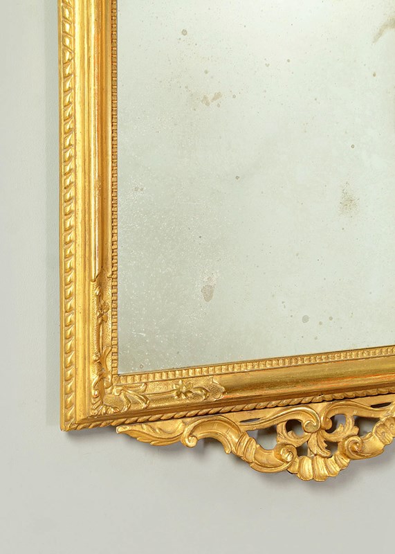 Mid 19th.c. French gilded wall mirror c.1840. Original 21½" x 29.5" mercury glass mirror plate within a wooden frame with moulded gesso decoration. With splendid original carved and pierced wooden elements featuring scrolling acanthus forms applied to the top, sides and bottom edge of the frame. Original gilt finish, a little rubbed and worn in places to reveal the red ground below. Obvious tarnish to the mirror and some minor retouching to the frame. Generally very good condition, cleaned and restored in our workshops.