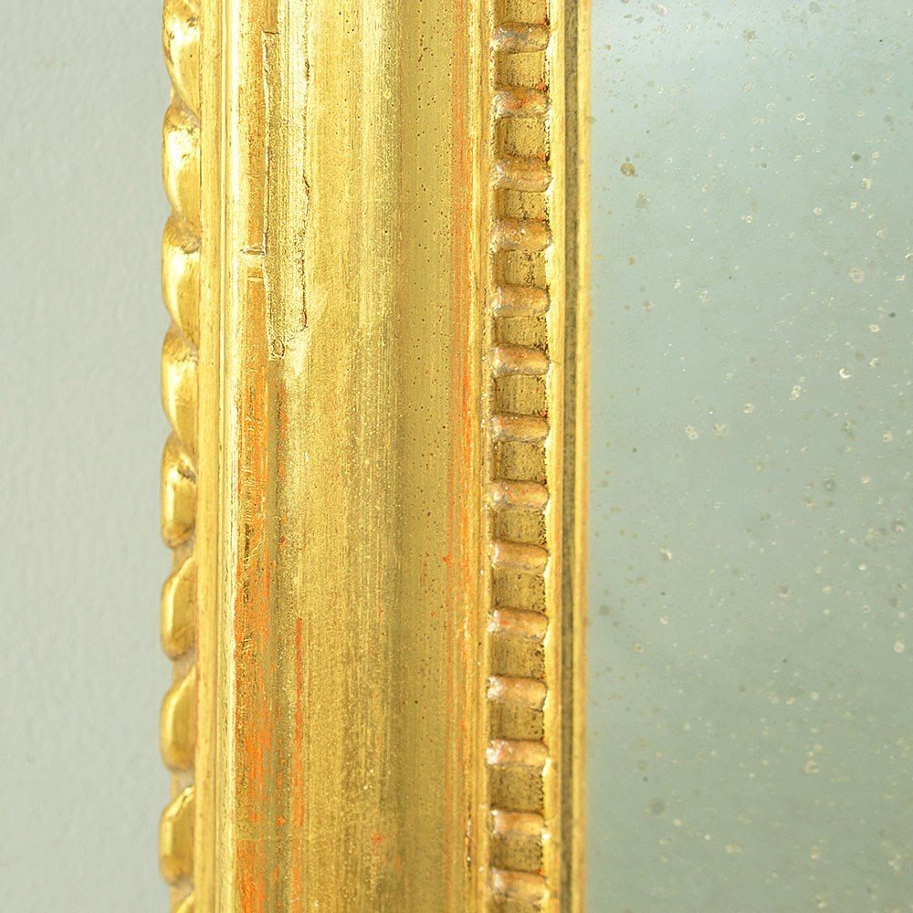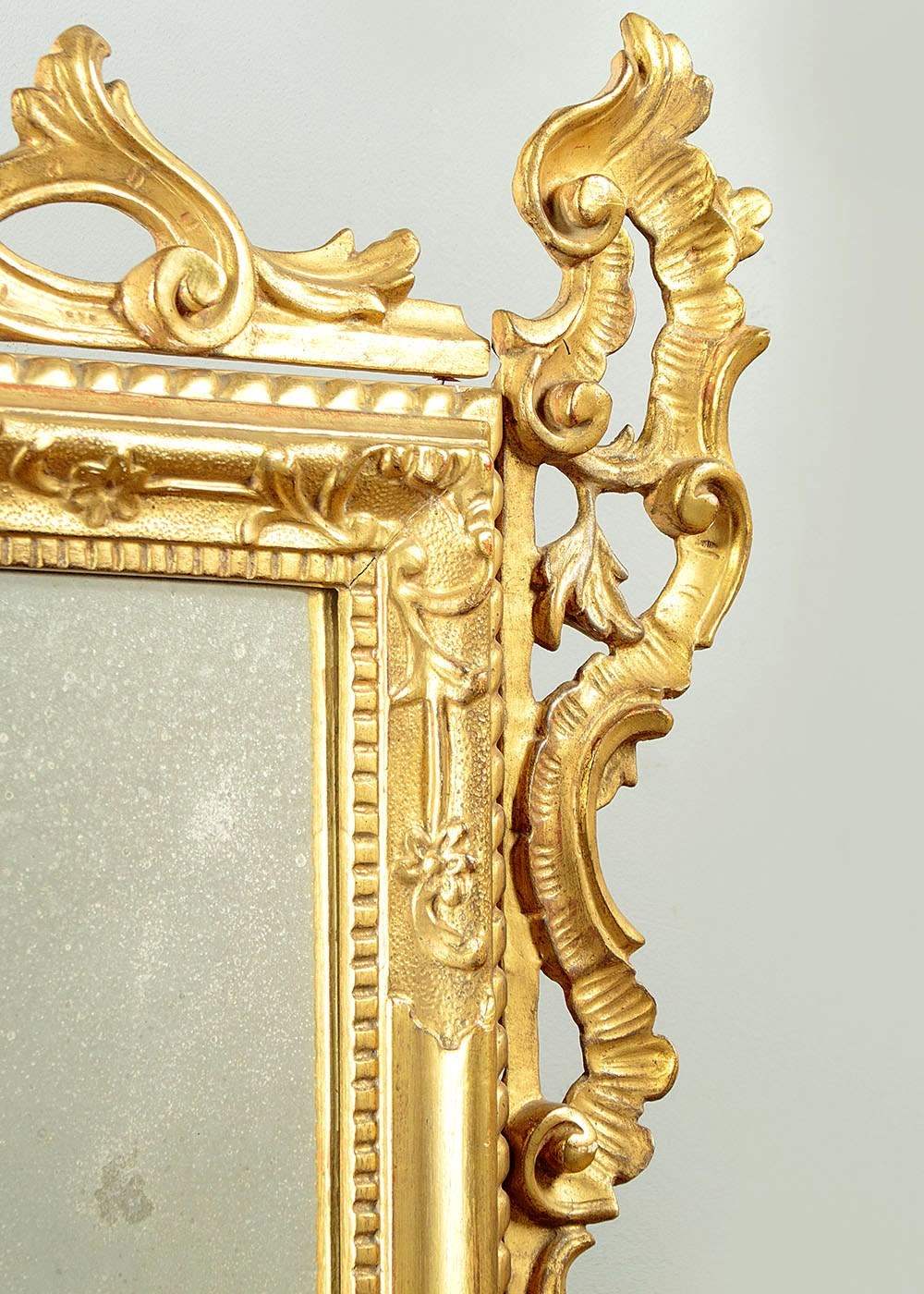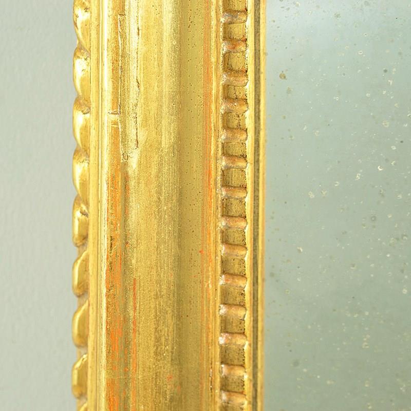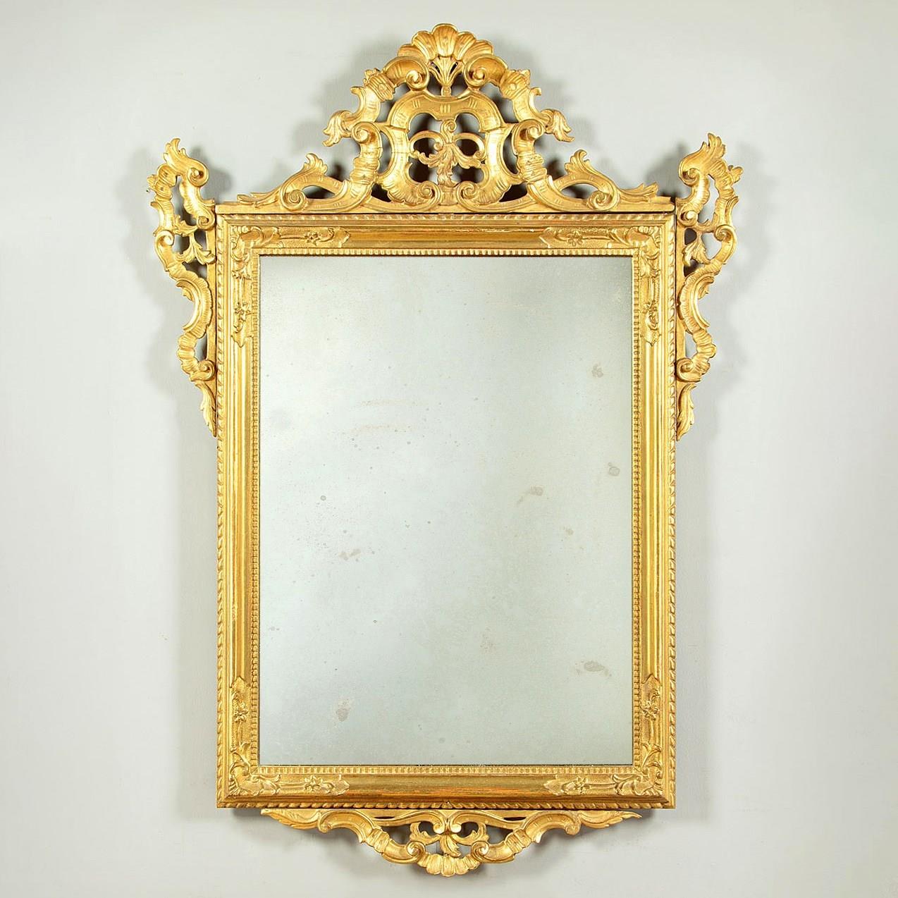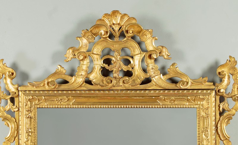 Mid 19th.c. French gilded wall mirror c.1840. Original 21½" x 29.5" mercury glass mirror plate within a wooden frame with moulded gesso decoration. With splendid original carved and pierced wooden elements featuring scrolling acanthus forms applied to the top, sides and bottom edge of the frame. Original gilt finish, a little rubbed and worn in places to reveal the red ground below. Obvious tarnish to the mirror and some minor retouching to the frame. Generally very good condition, cleaned and restored in our workshops.