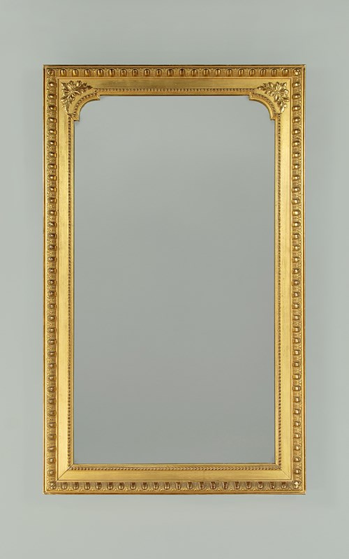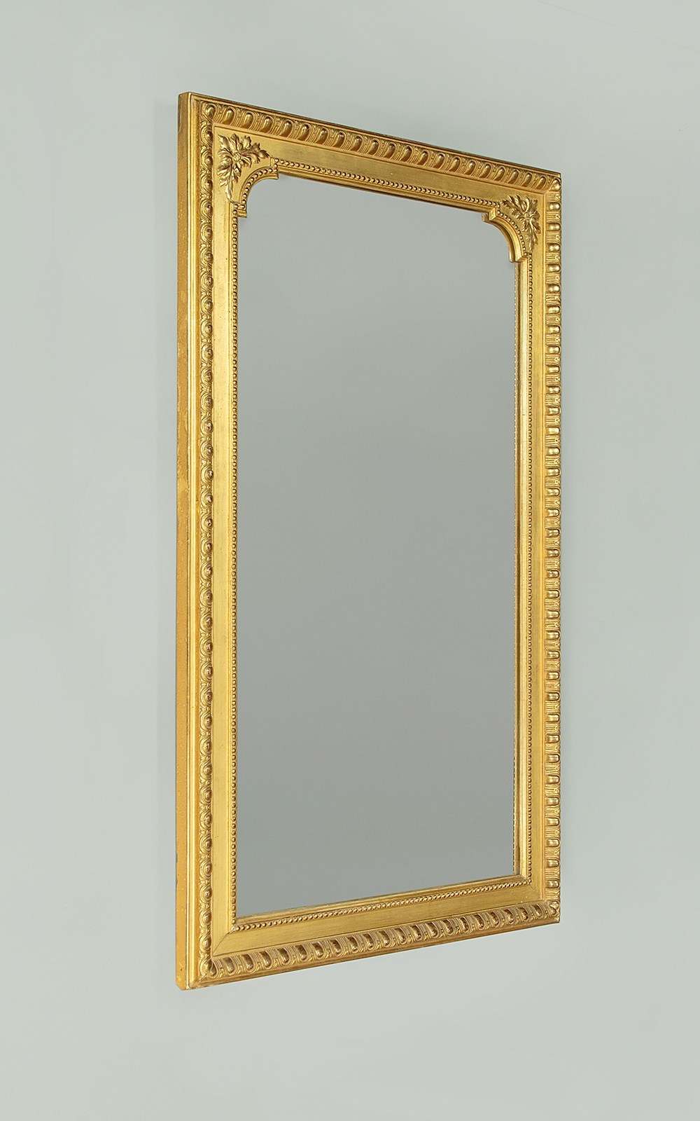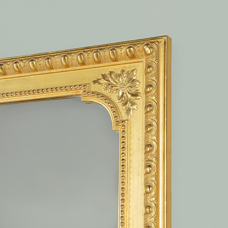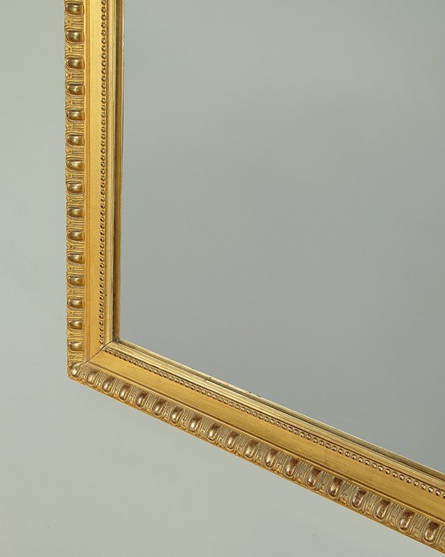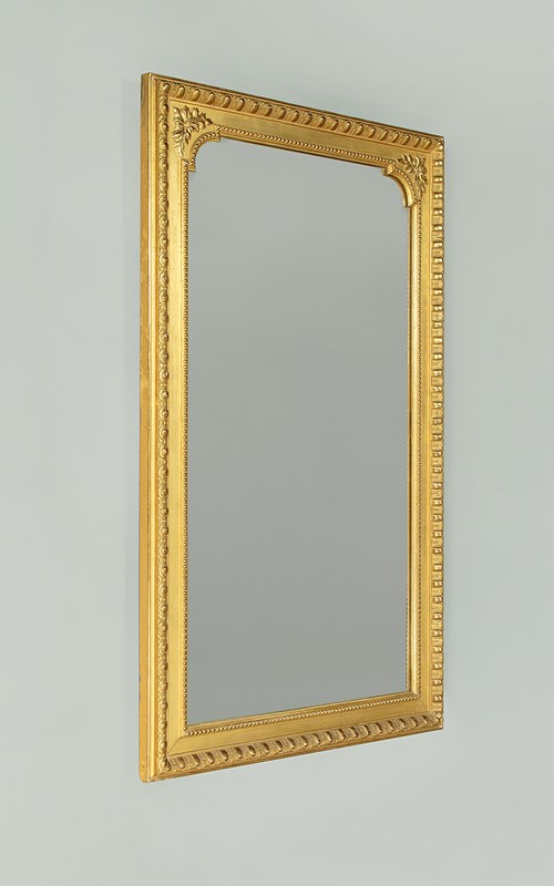 Giltwood wall mirror or pier glass c.1890. 25" x 46½" mirror plate within a giltwood frame with shaped detail and acanthus spandrels to the top corners. Gadroon moulded edge and a simple bead moulding around the glass. Original gilding, worn in places. Some very minor spotting to the mirror, generally excellent condition.
