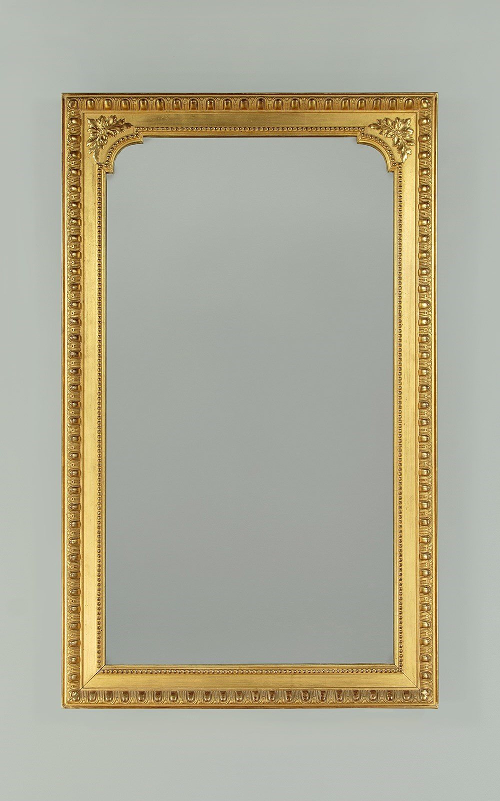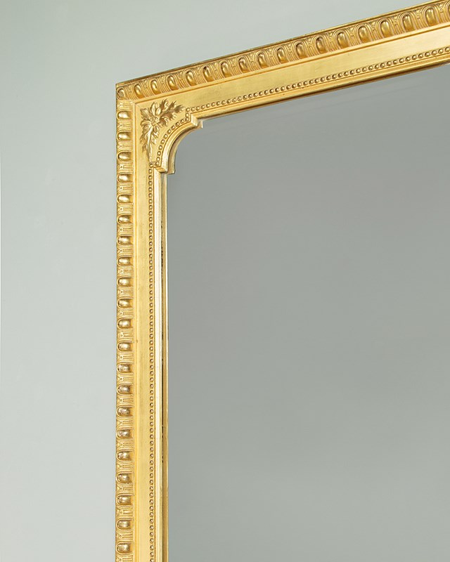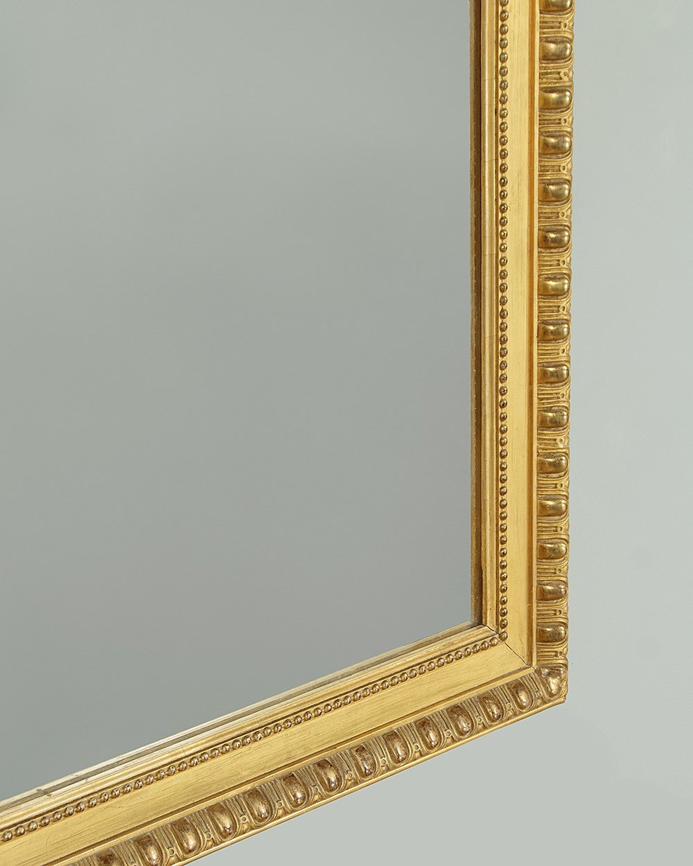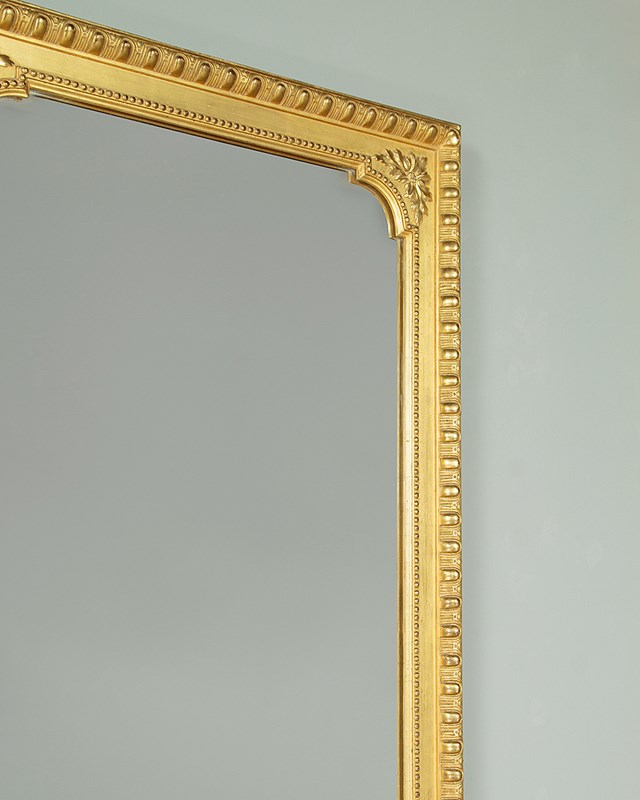 Giltwood wall mirror or pier glass c.1890. 25" x 46½" mirror plate within a giltwood frame with shaped detail and acanthus spandrels to the top corners. Gadroon moulded edge and a simple bead moulding around the glass. Original gilding, worn in places. Some very minor spotting to the mirror, generally excellent condition.