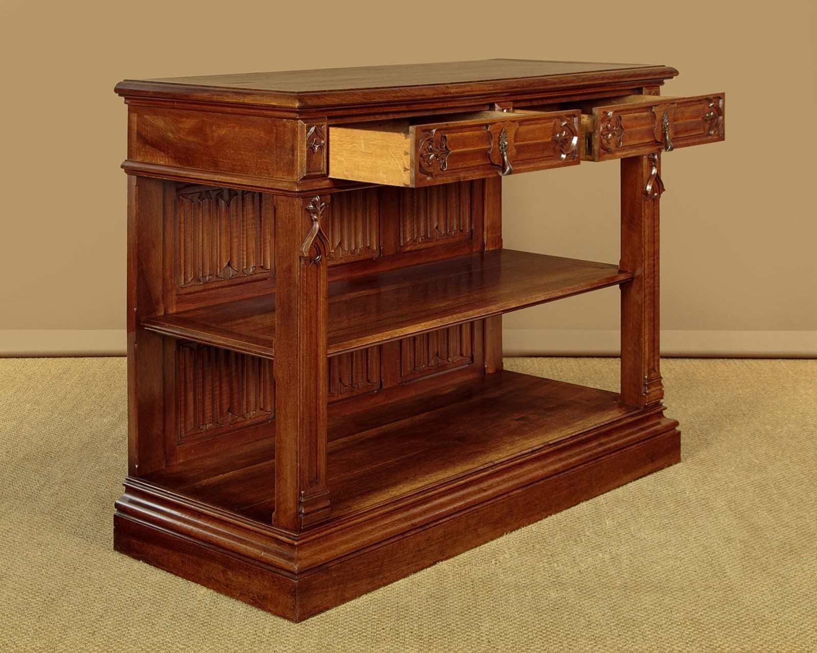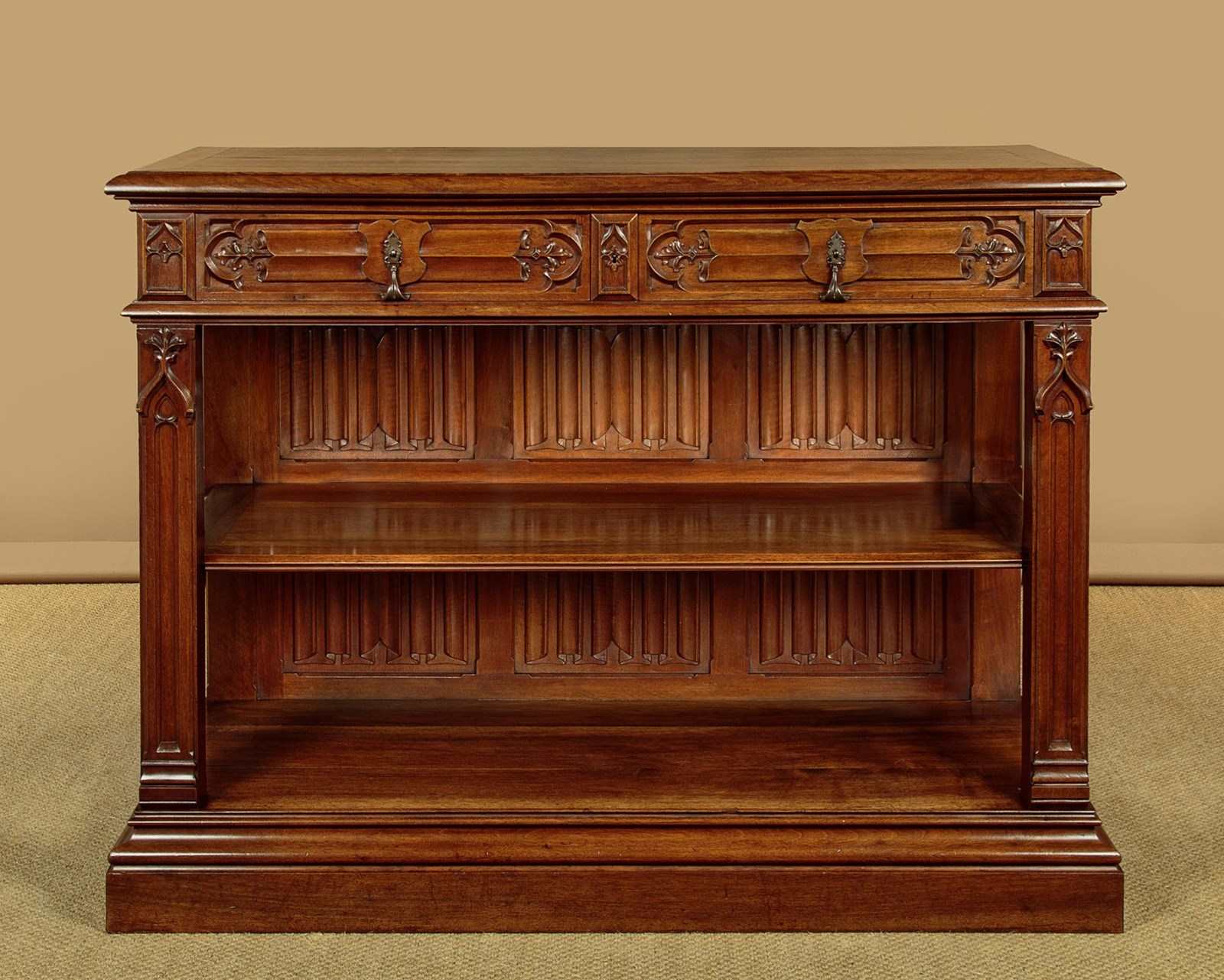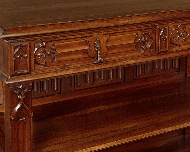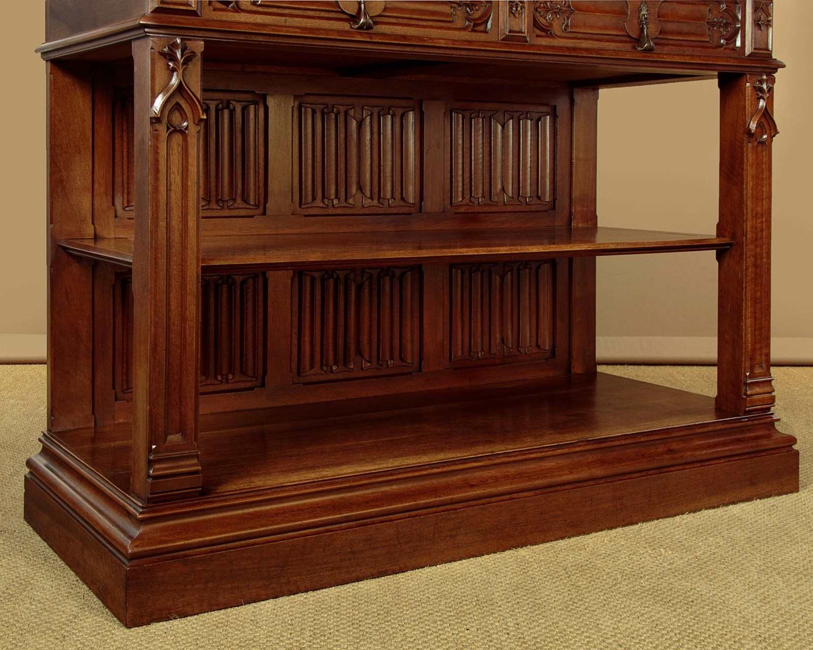 Superb quality Gothic revival carved buffet sideboard in walnut c.1880. Solid walnut top with a deep moulded edge over two drawers and two open shelves. Beautifully carved decoration to the drawer fronts featuring a shield cartouche over linenfold and trefoil leaf detail with fabulous original iron handles. Blind Gothic tracery carving flanking the drawers and running down the length of the front stiles. Note also the six linenfold carved back panels. Open sides. Raised on a substantial plinth with deep ogee moulded edge. Oak drawer linings. Excellent colour and condition, cleaned and waxed in our workshops.