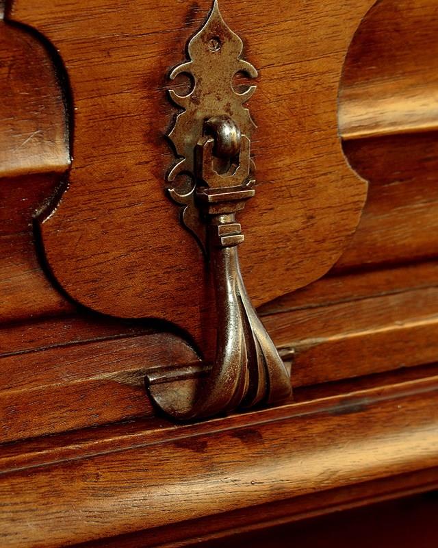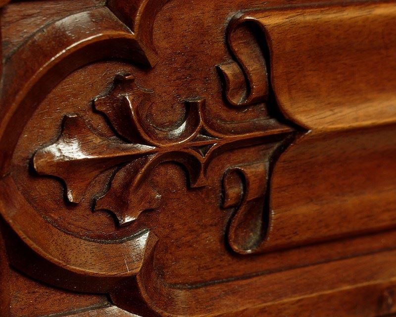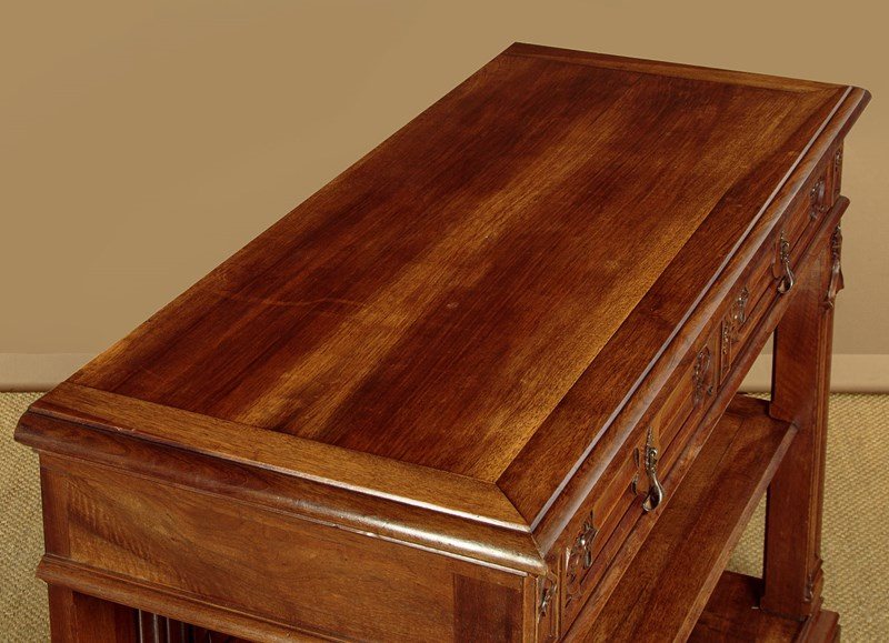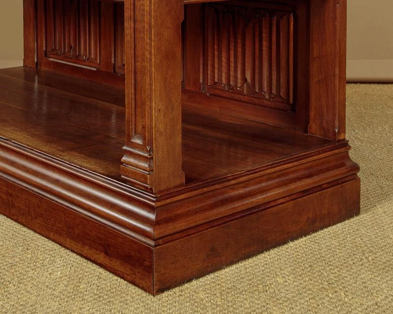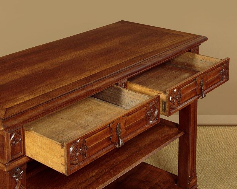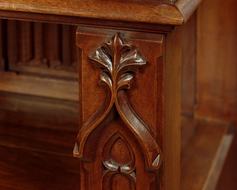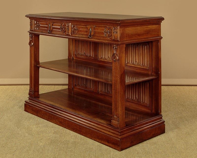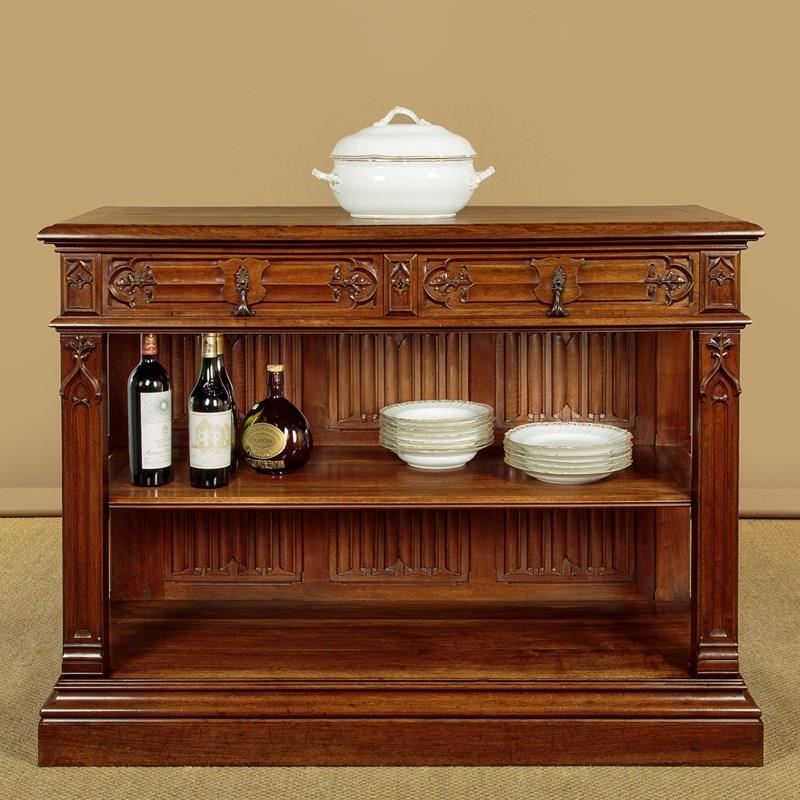 Superb quality Gothic revival carved buffet sideboard in walnut c.1880. Solid walnut top with a deep moulded edge over two drawers and two open shelves. Beautifully carved decoration to the drawer fronts featuring a shield cartouche over linenfold and trefoil leaf detail with fabulous original iron handles. Blind Gothic tracery carving flanking the drawers and running down the length of the front stiles. Note also the six linenfold carved back panels. Open sides. Raised on a substantial plinth with deep ogee moulded edge. Oak drawer linings. Excellent colour and condition, cleaned and waxed in our workshops.