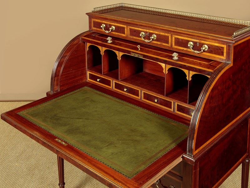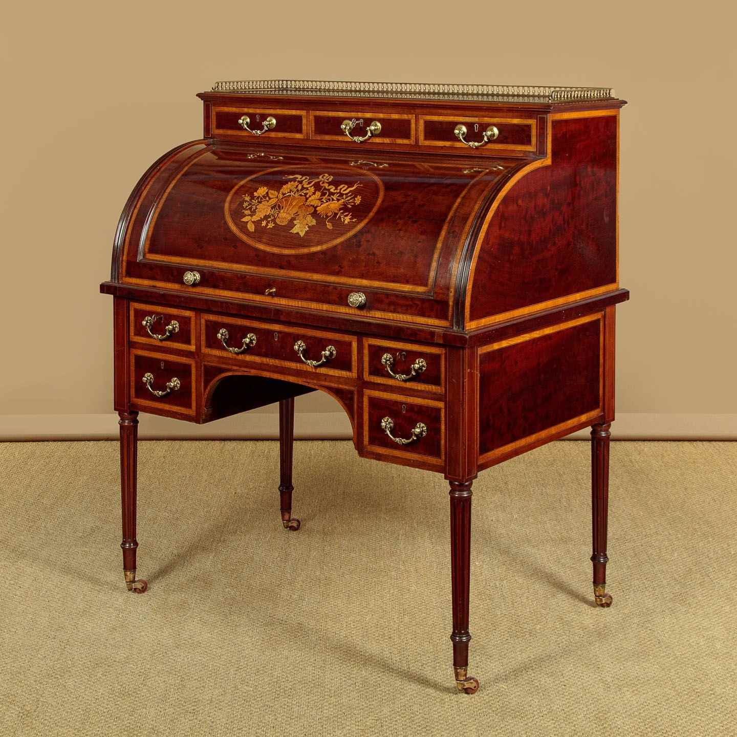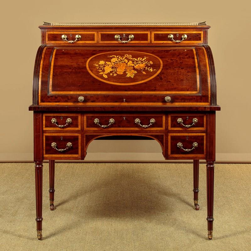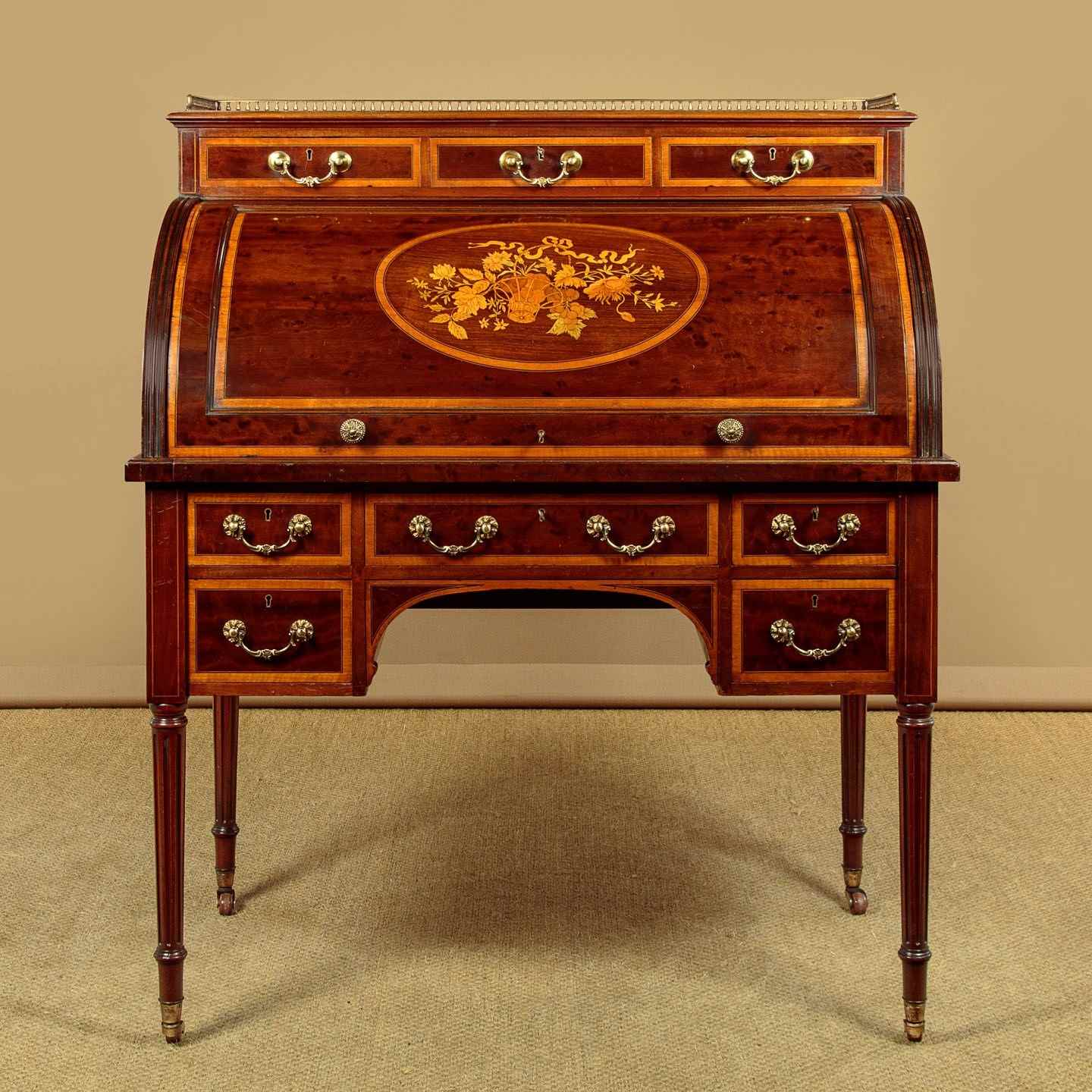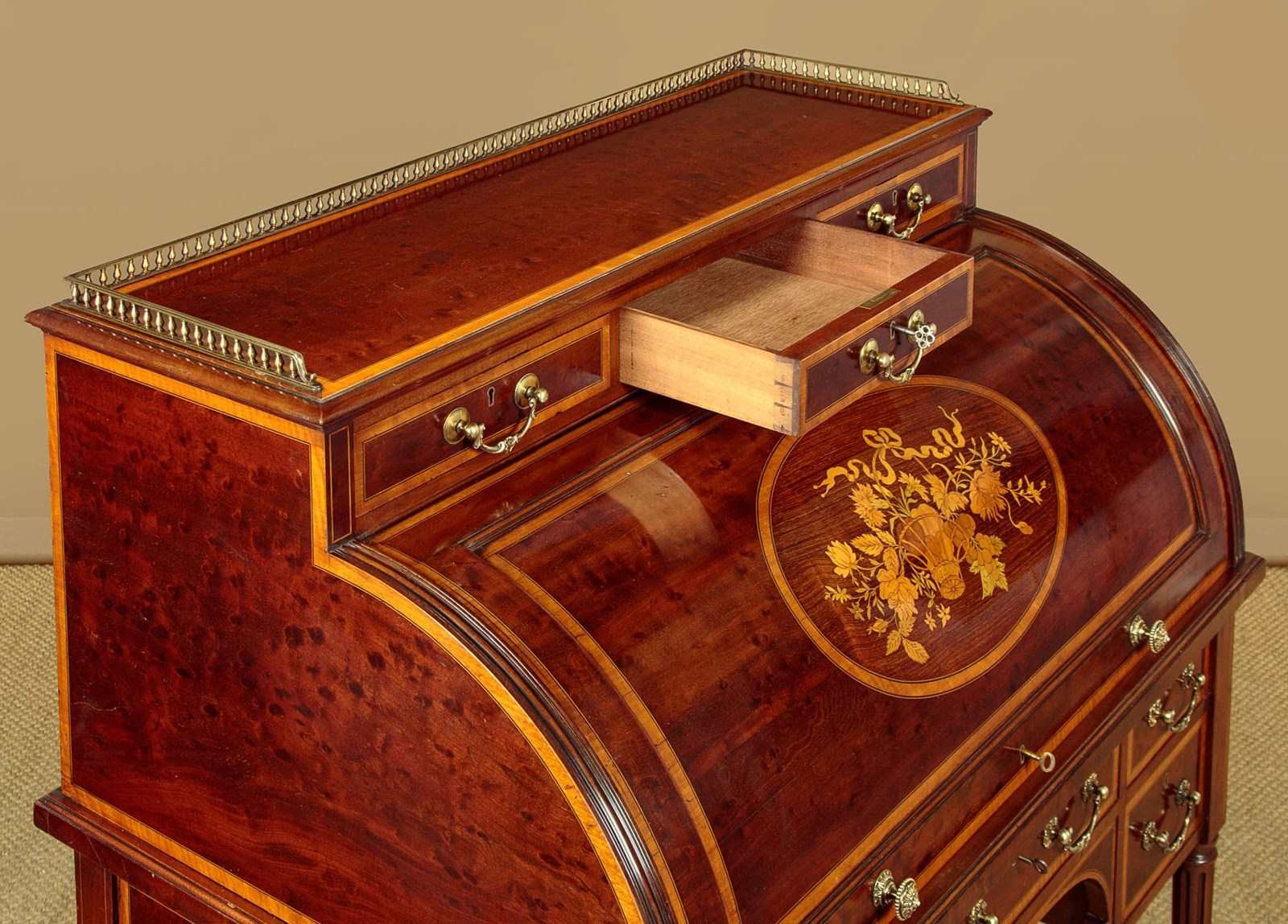 Superb quality Edwardian inlaid mahogany cylinder desk c.1905. Pierced brass gallery to the back and sides of the top over three small drawers and the cylinder beautifully inlaid with fine floral marquetry detail. Opening to reveal a fitted interior of pigeon holes over a slide out desk (height 28½") with a green leather skiver. Five larger drawers below the desk arranged around the central kneehole. Satinwood crossbanded drawer fronts with the original gilded brass handles. Raised on slim turned and fluted legs with the original castors. The crossbanding continues on the sides and the rear is plain but polished. Mahogany drawer linings. Wear to the surface of the flat top above the cylinder. Otherwise excellent colour and condition, cleaned and waxed in our workshops. Keys supplied for all the drawers and the cylinder.