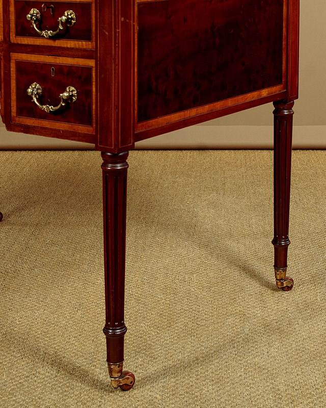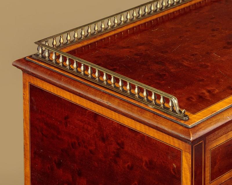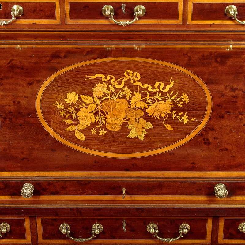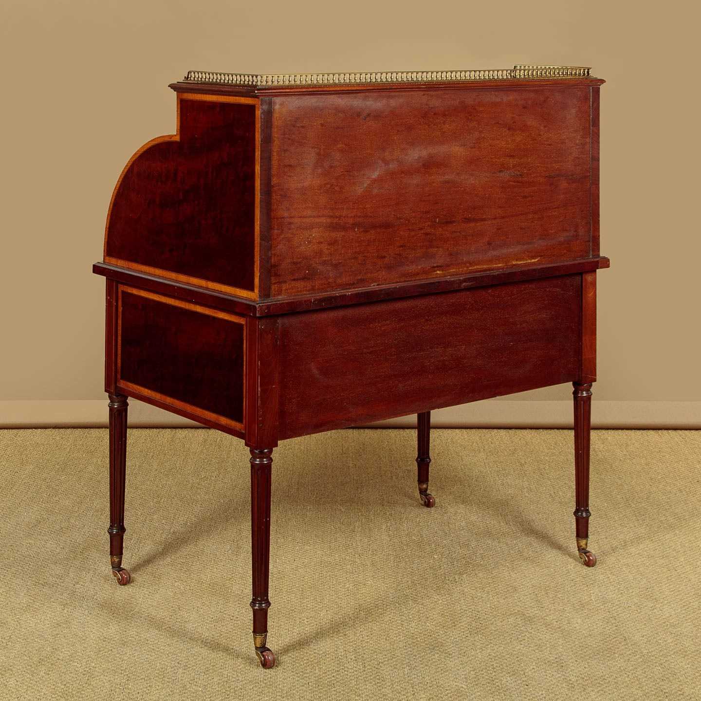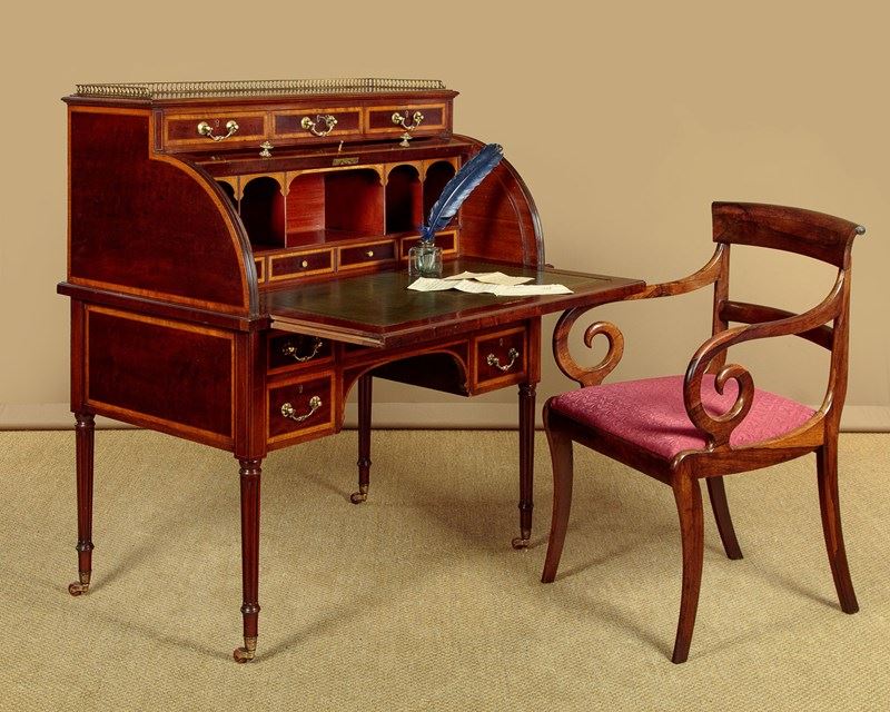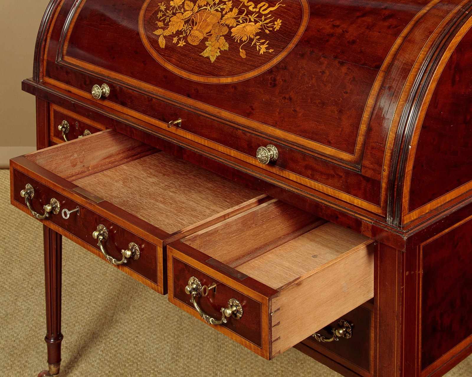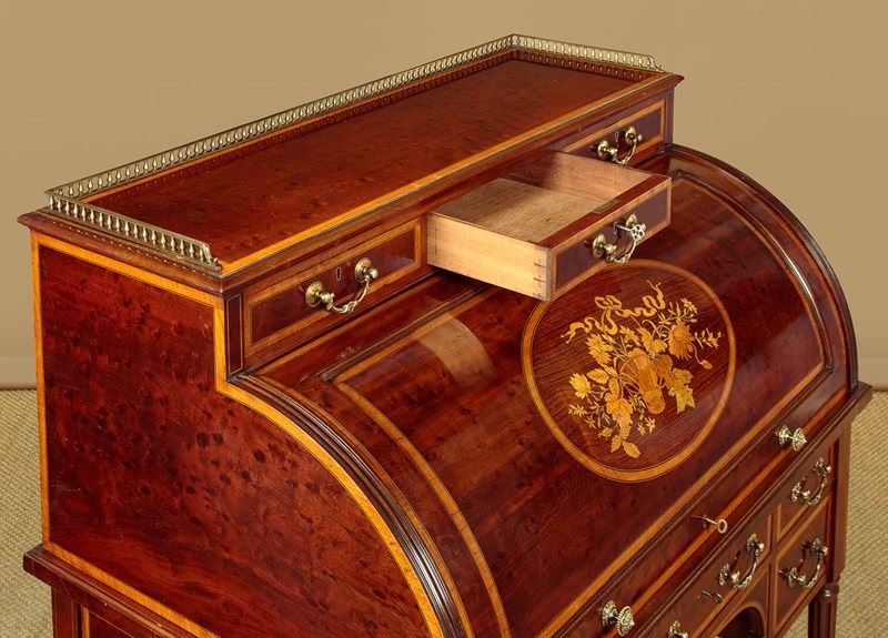 Superb quality Edwardian inlaid mahogany cylinder desk c.1905. Pierced brass gallery to the back and sides of the top over three small drawers and the cylinder beautifully inlaid with fine floral marquetry detail. Opening to reveal a fitted interior of pigeon holes over a slide out desk (height 28½") with a green leather skiver. Five larger drawers below the desk arranged around the central kneehole. Satinwood crossbanded drawer fronts with the original gilded brass handles. Raised on slim turned and fluted legs with the original castors. The crossbanding continues on the sides and the rear is plain but polished. Mahogany drawer linings. Wear to the surface of the flat top above the cylinder. Otherwise excellent colour and condition, cleaned and waxed in our workshops. Keys supplied for all the drawers and the cylinder.