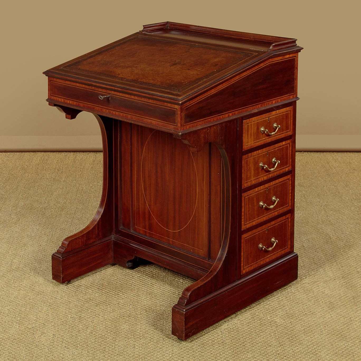 Neat little inlaid mahogany davenport writing desk c.1905. Just 24" wide. Raised and moulded gallery around the flat top, over a sloped writing surface with the original tooled tan leather skiver. The slope is hinged and lockable, opening to reveal storage below and 8 small pigeon holes. Knee height below the desk 25½". With four drawers of graduated height in the right hand side of the base with original handles and solid mahogany drawer linings. Satinwood crossbanded edges and inlaid stringing to the front and sides, polished rear. On a moulded plinth, raised and shaped at the front to allow space for the sitter's feet. Raised on the original brass barrel castors. Very good colour and condition, key supplied for the slope.
