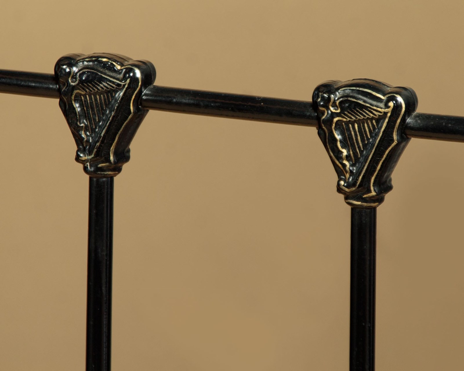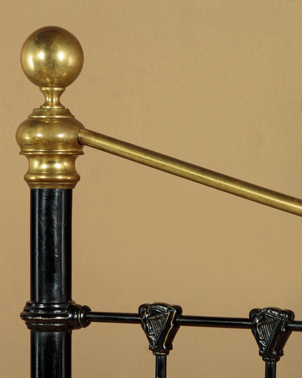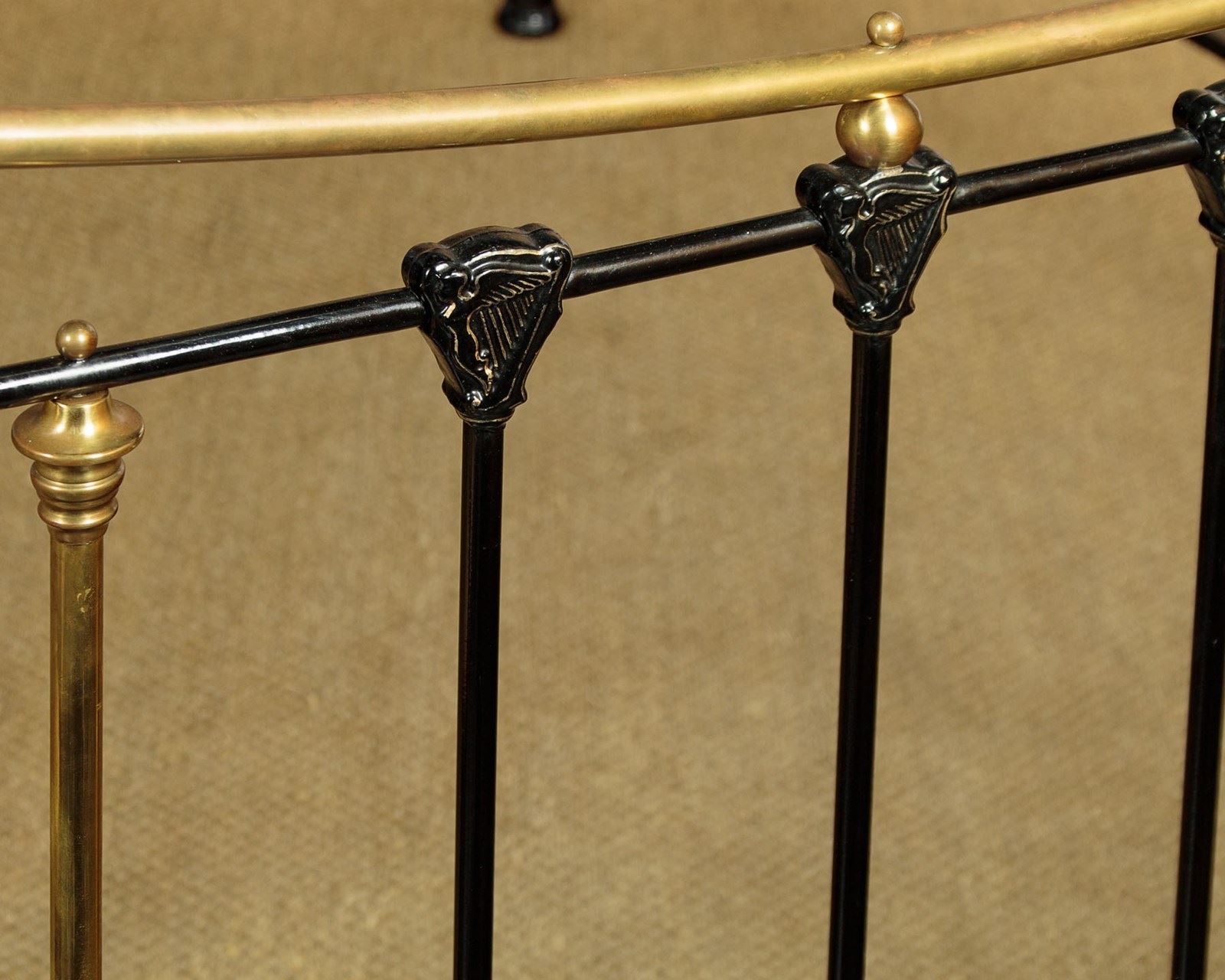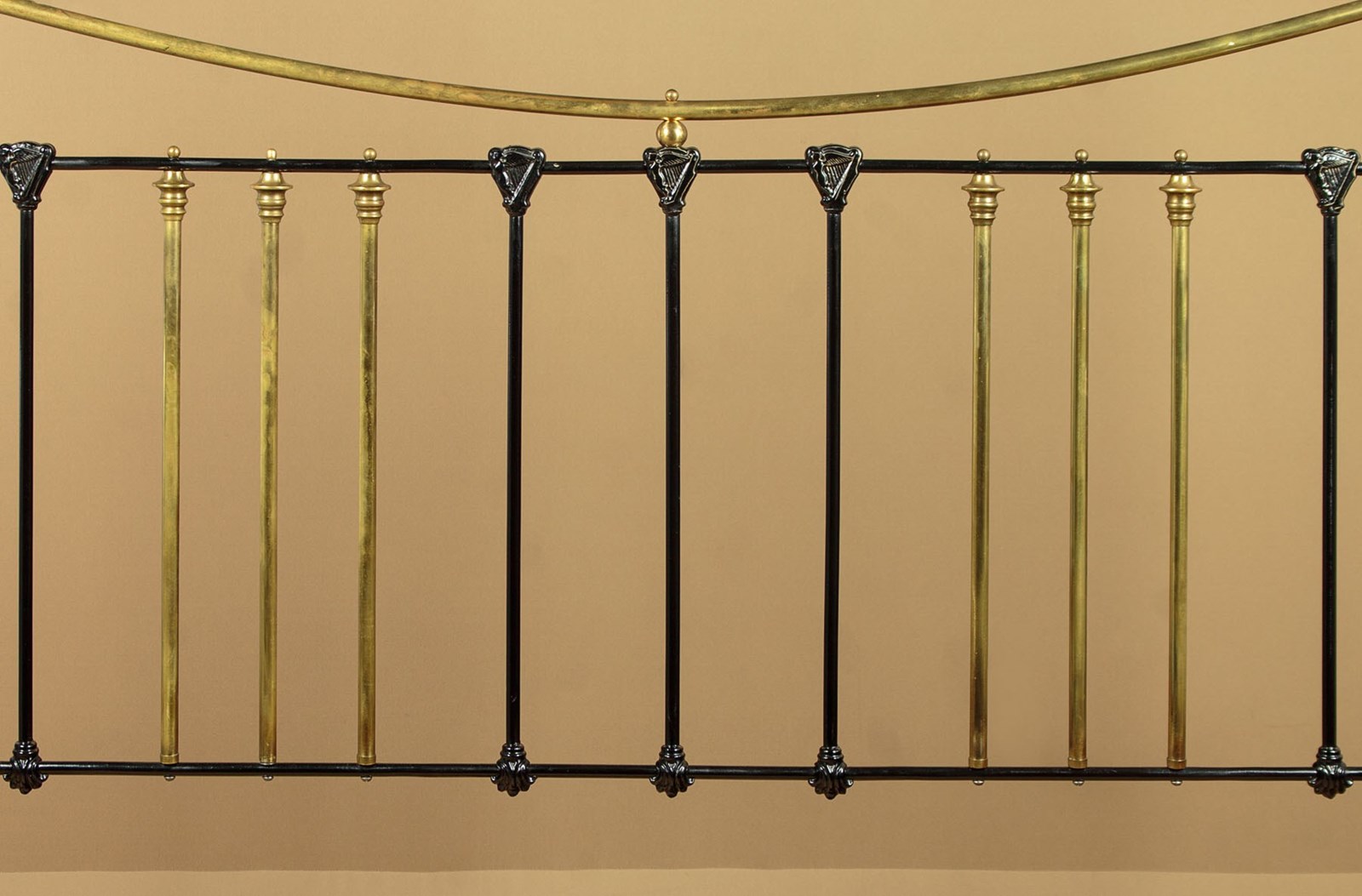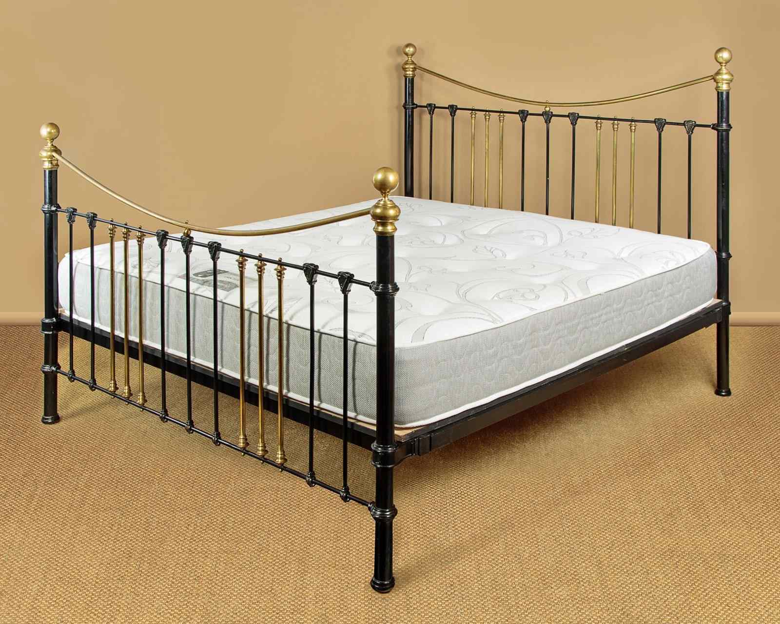 Very impressive king size brass and iron double bed c.1890. Iron frame with matching detail to the head and foot. Brass bed knobs and curved top rails over sets of iron and brass uprights. Note the Irish harp detail to the tops of the iron rods. To take a 72" x 78" king size mattress. Sold complete with side rails, wooden base boards,which are bolted to the side rails for extra stability, and a quality British made mattress. Excellent condition.