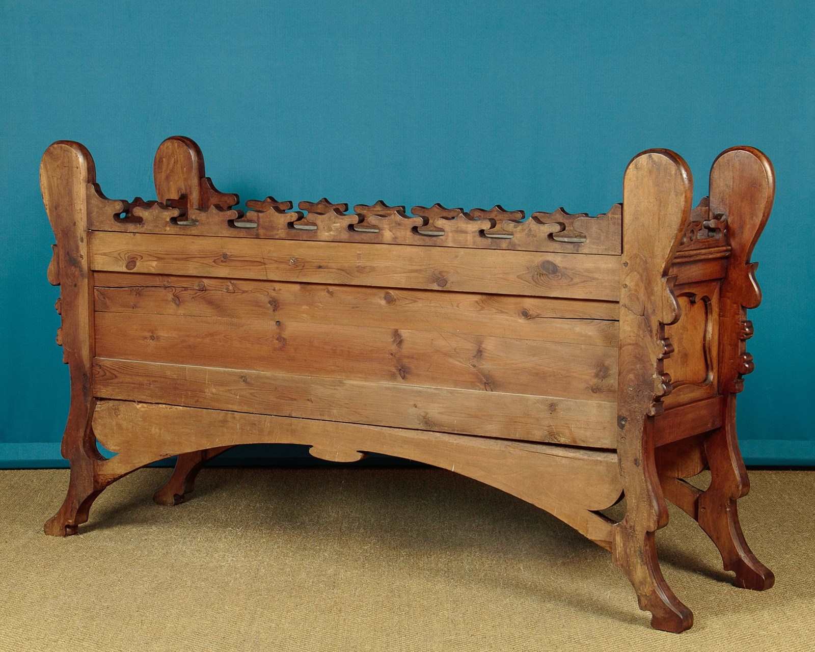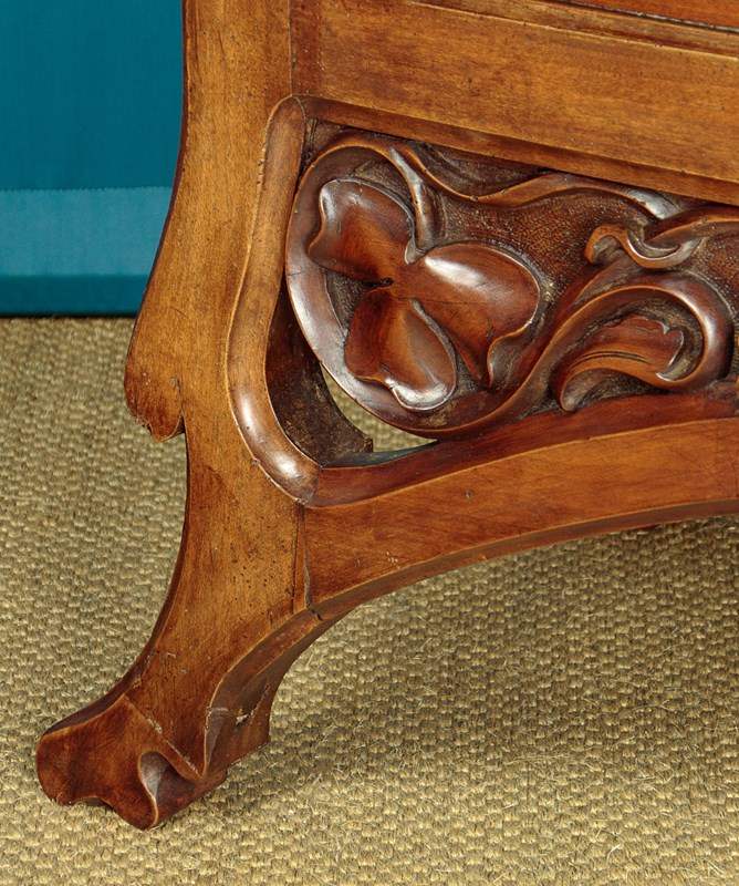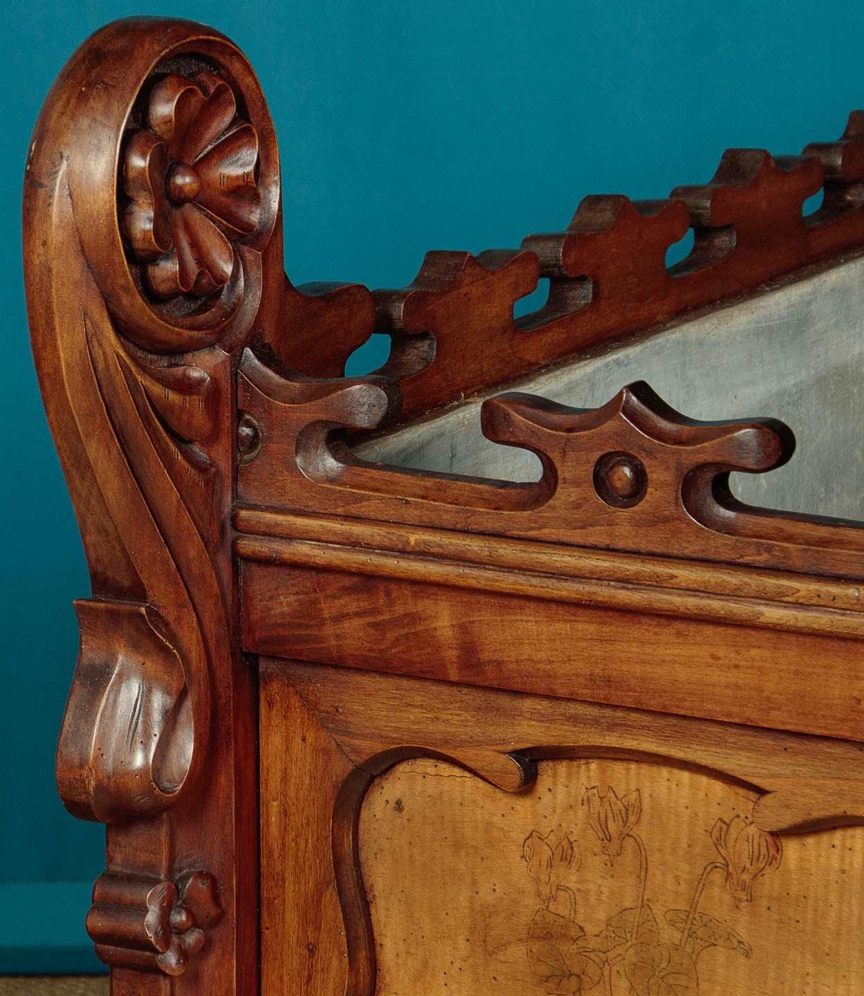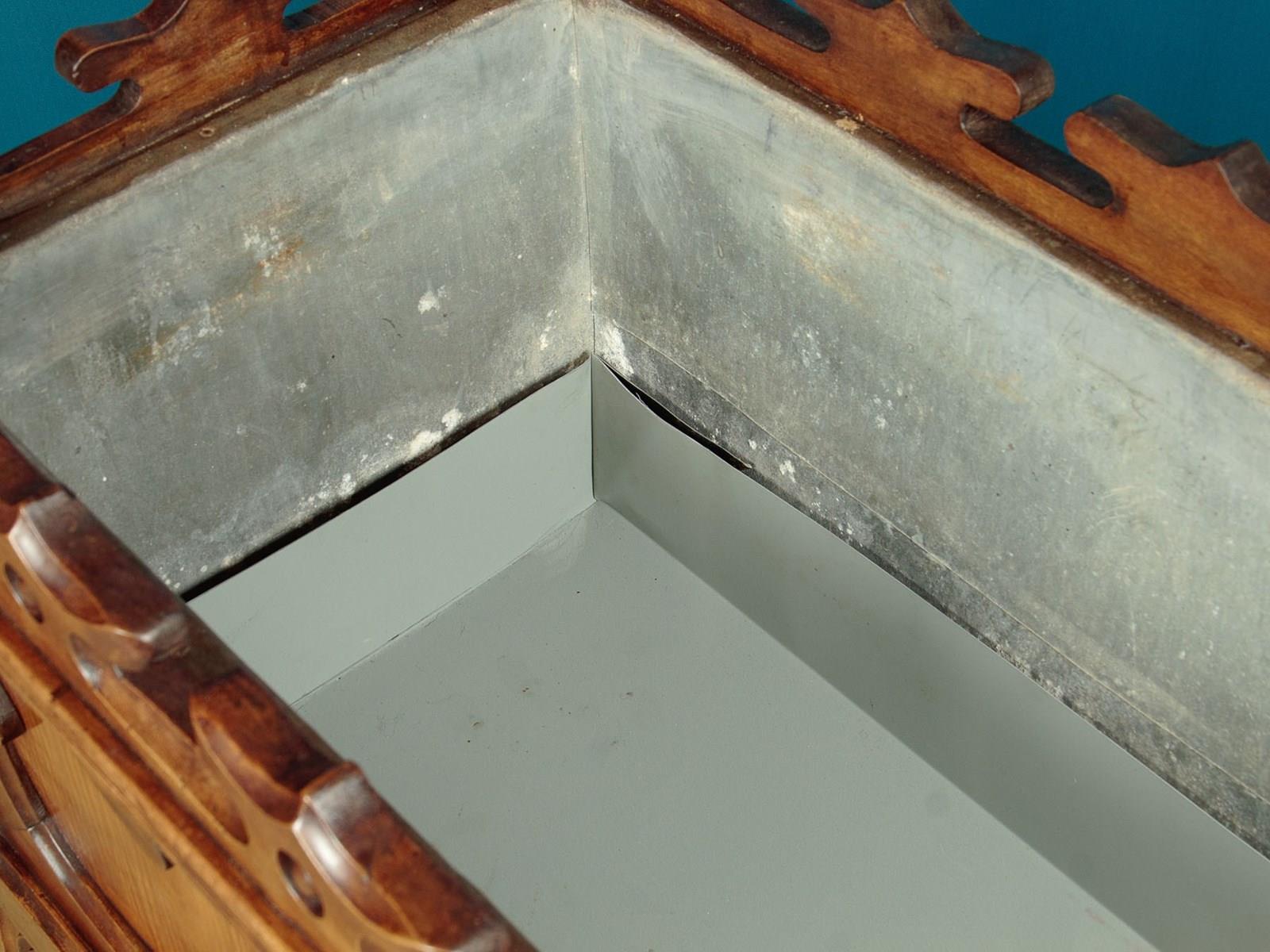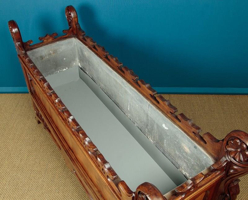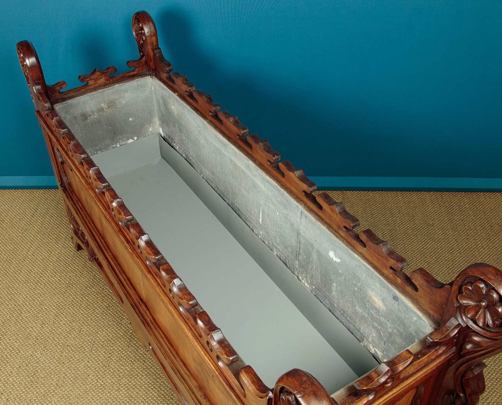 Remarkable large indoor plater or jardinière c.1890. Six feet long and 41" tall. Zinc lined trough (internal dimensions 59" x 16" x 16"). Beautiful carved walnut exterior with exuberant Gothic and Art Nouveau inspired decoration. Crenelated top edge and raised ends with carved flower head roundels and leaf detail. Veneered panels to the front and sides with charming Art Nouveau poker work decoration of plants. Shaped apron and legs with pierced brackets also carved with trailing foliage. Unfortunately the original zinc lining is badly perished but we have had a new liner made to fit inside (height 5") within which plant pots could be stood. Some old wood worm holes and repairs to the feet. Otherwise very good colour and condition, solid and sturdy. Cleaned and waxed in our workshops.