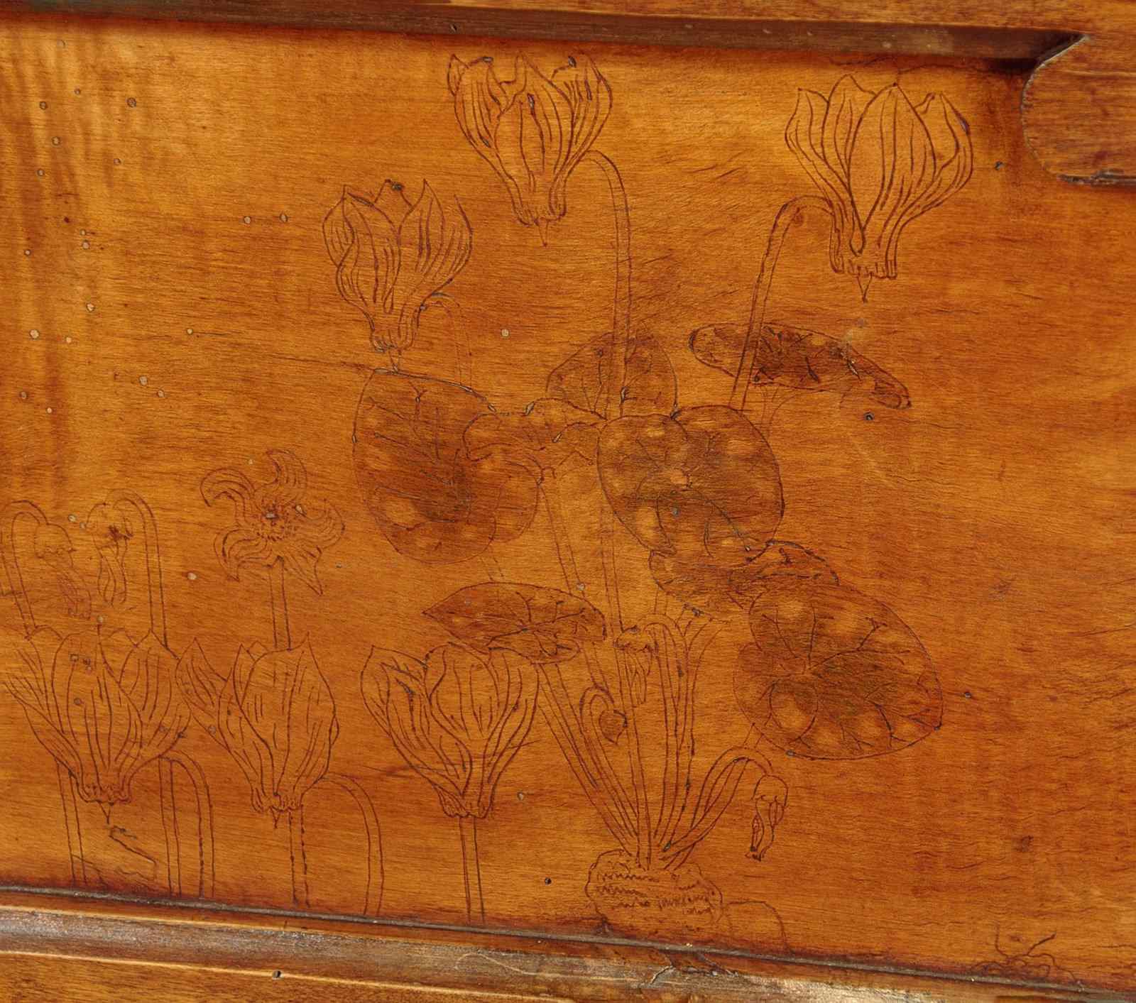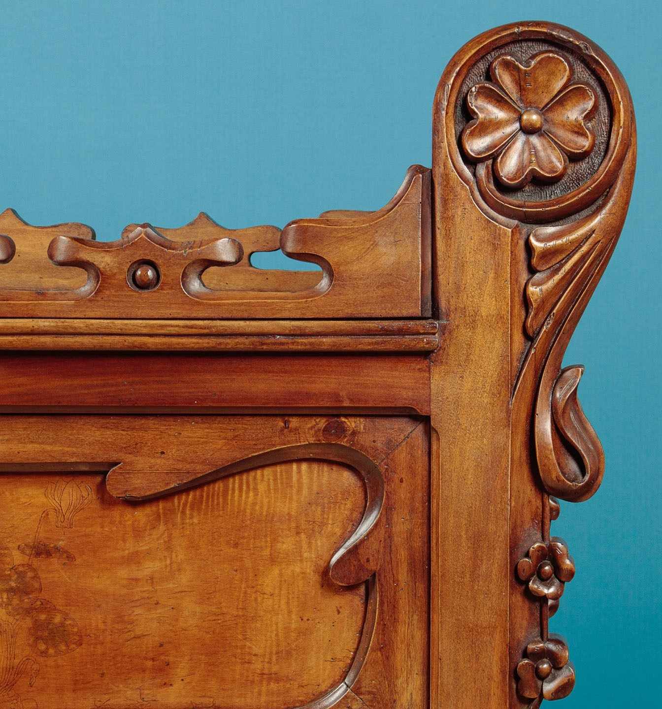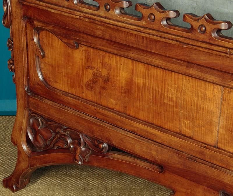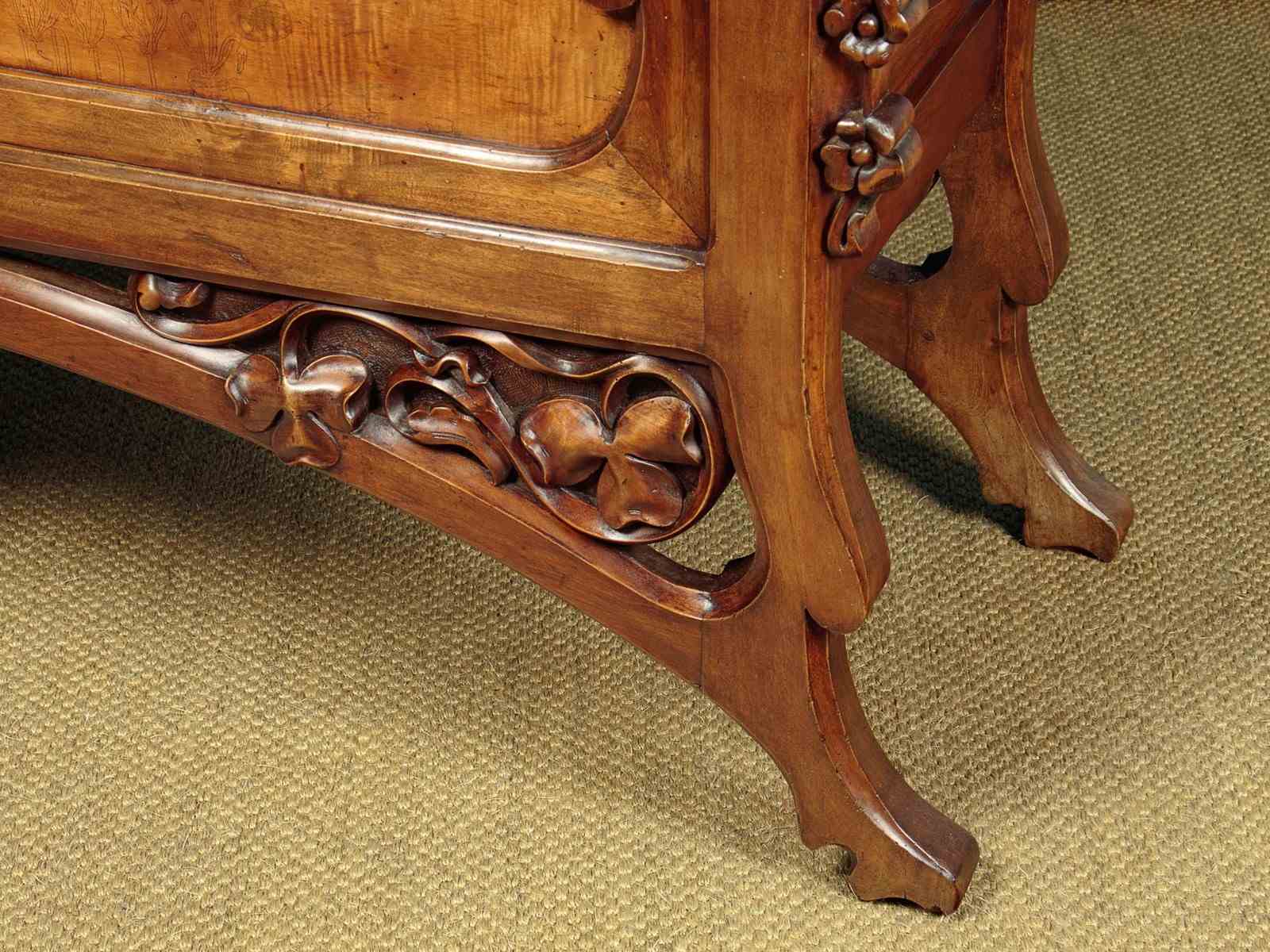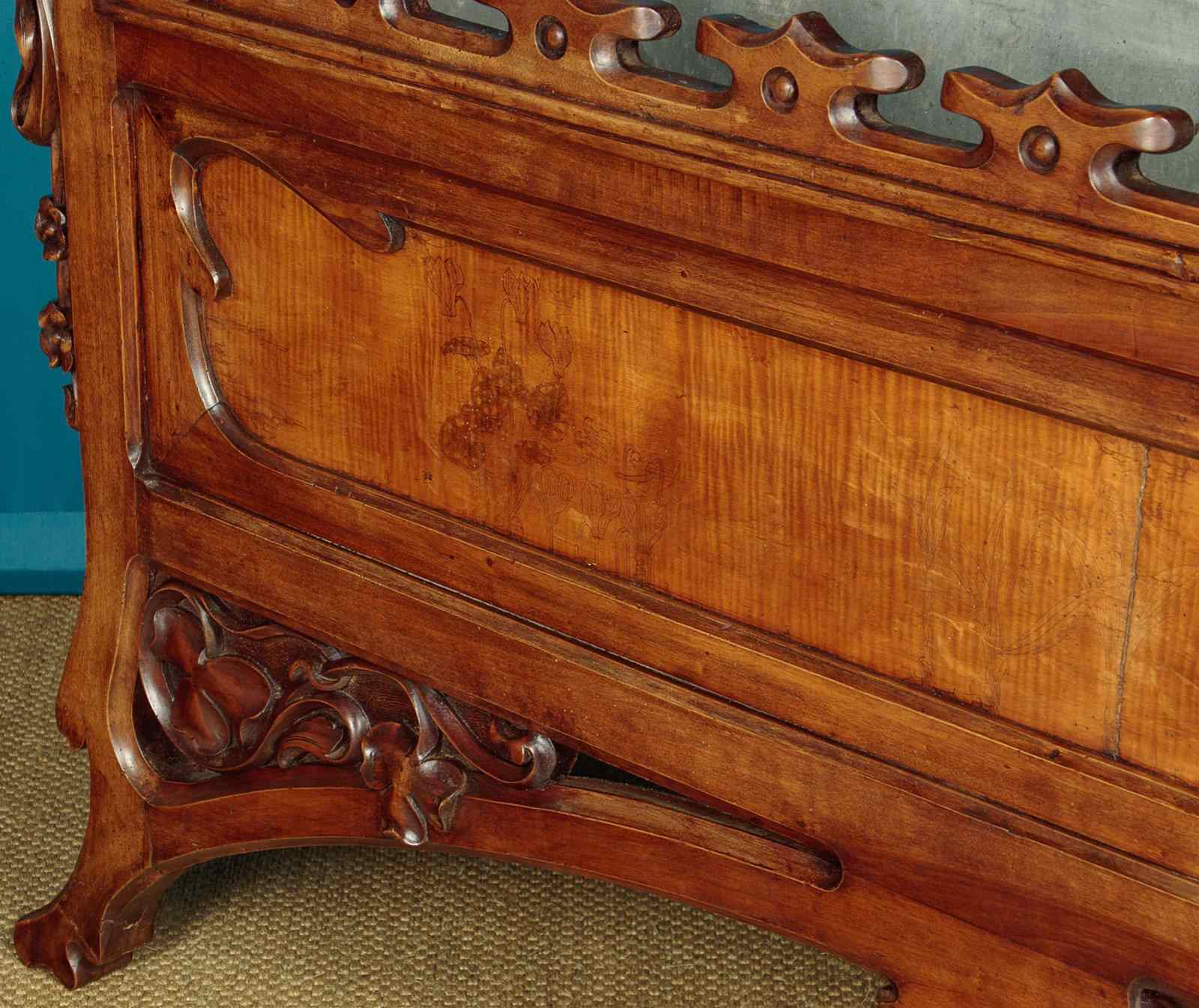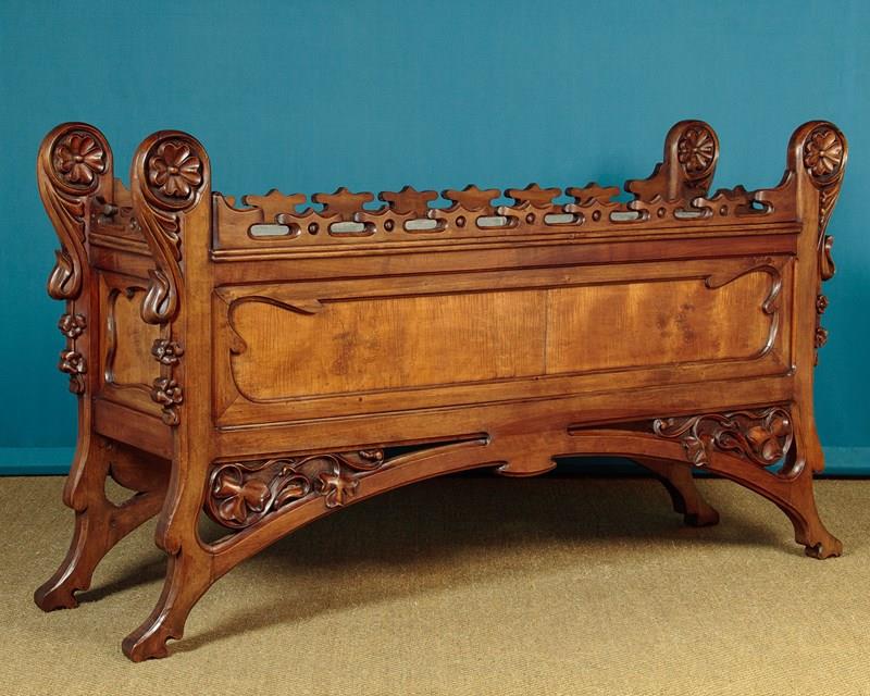 Remarkable large indoor plater or jardinière c.1890. Six feet long and 41" tall. Zinc lined trough (internal dimensions 59" x 16" x 16"). Beautiful carved walnut exterior with exuberant Gothic and Art Nouveau inspired decoration. Crenelated top edge and raised ends with carved flower head roundels and leaf detail. Veneered panels to the front and sides with charming Art Nouveau poker work decoration of plants. Shaped apron and legs with pierced brackets also carved with trailing foliage. Unfortunately the original zinc lining is badly perished but we have had a new liner made to fit inside (height 5") within which plant pots could be stood. Some old wood worm holes and repairs to the feet. Otherwise very good colour and condition, solid and sturdy. Cleaned and waxed in our workshops.