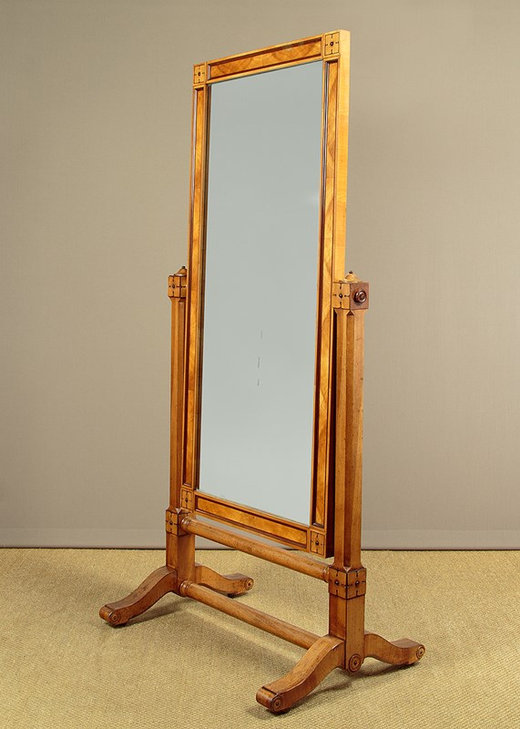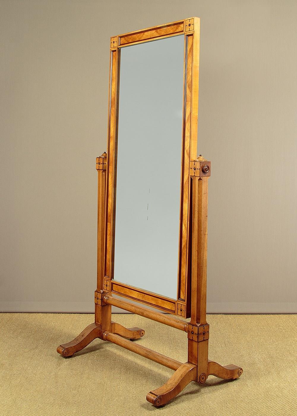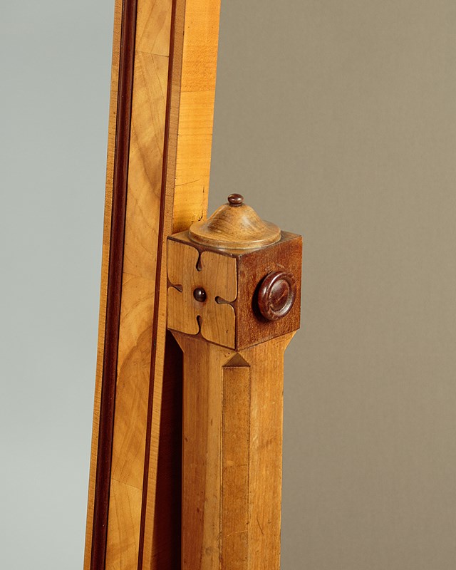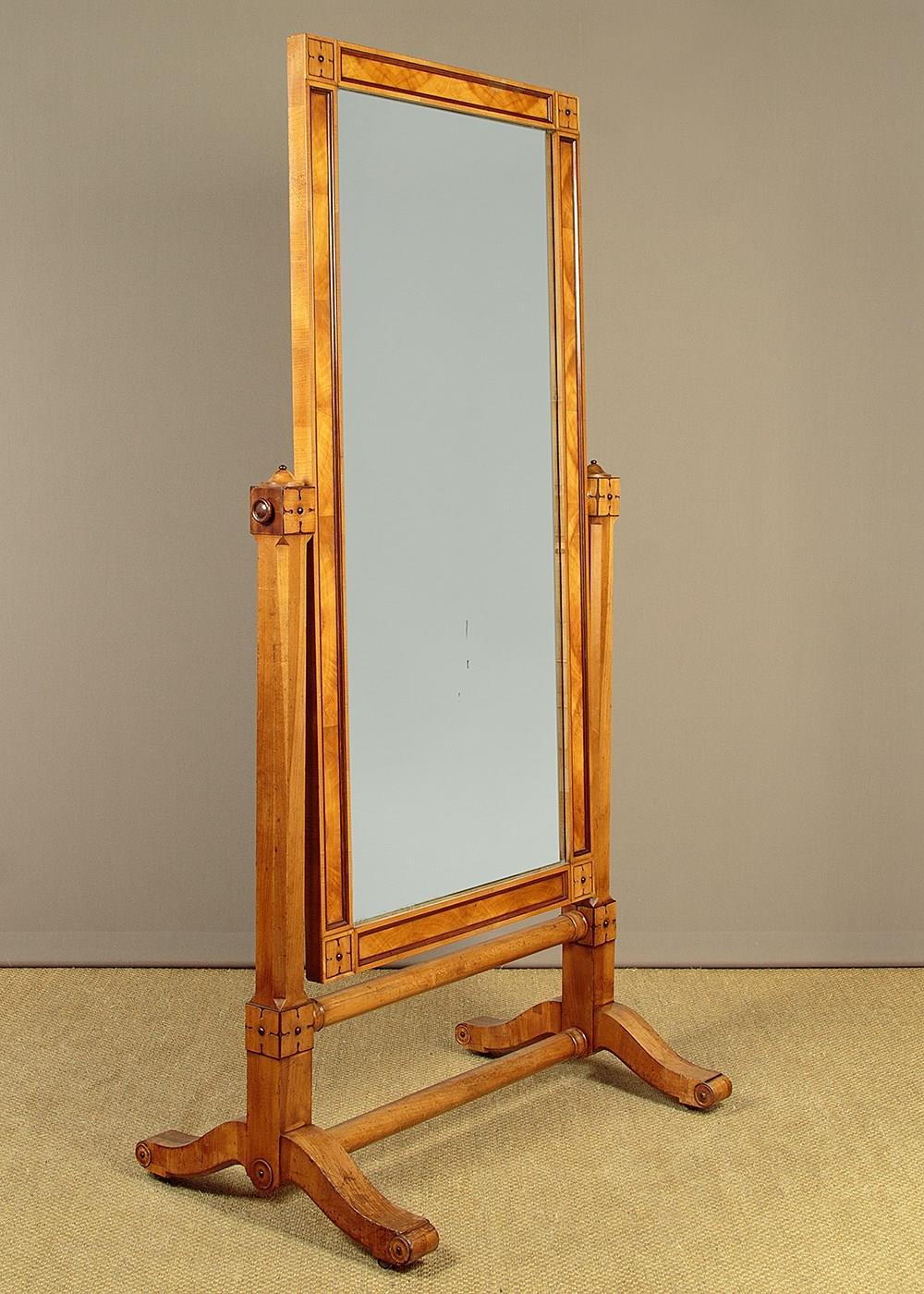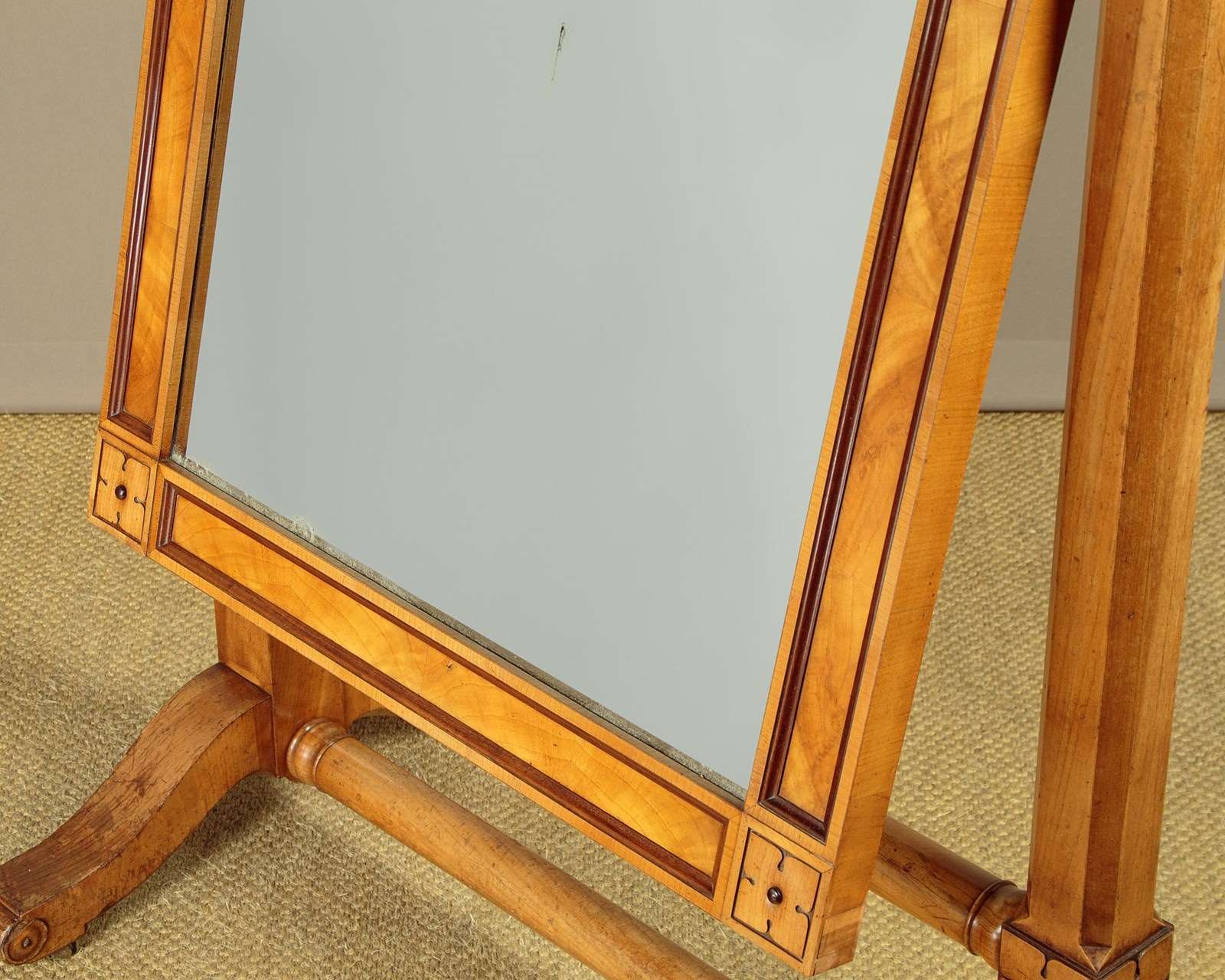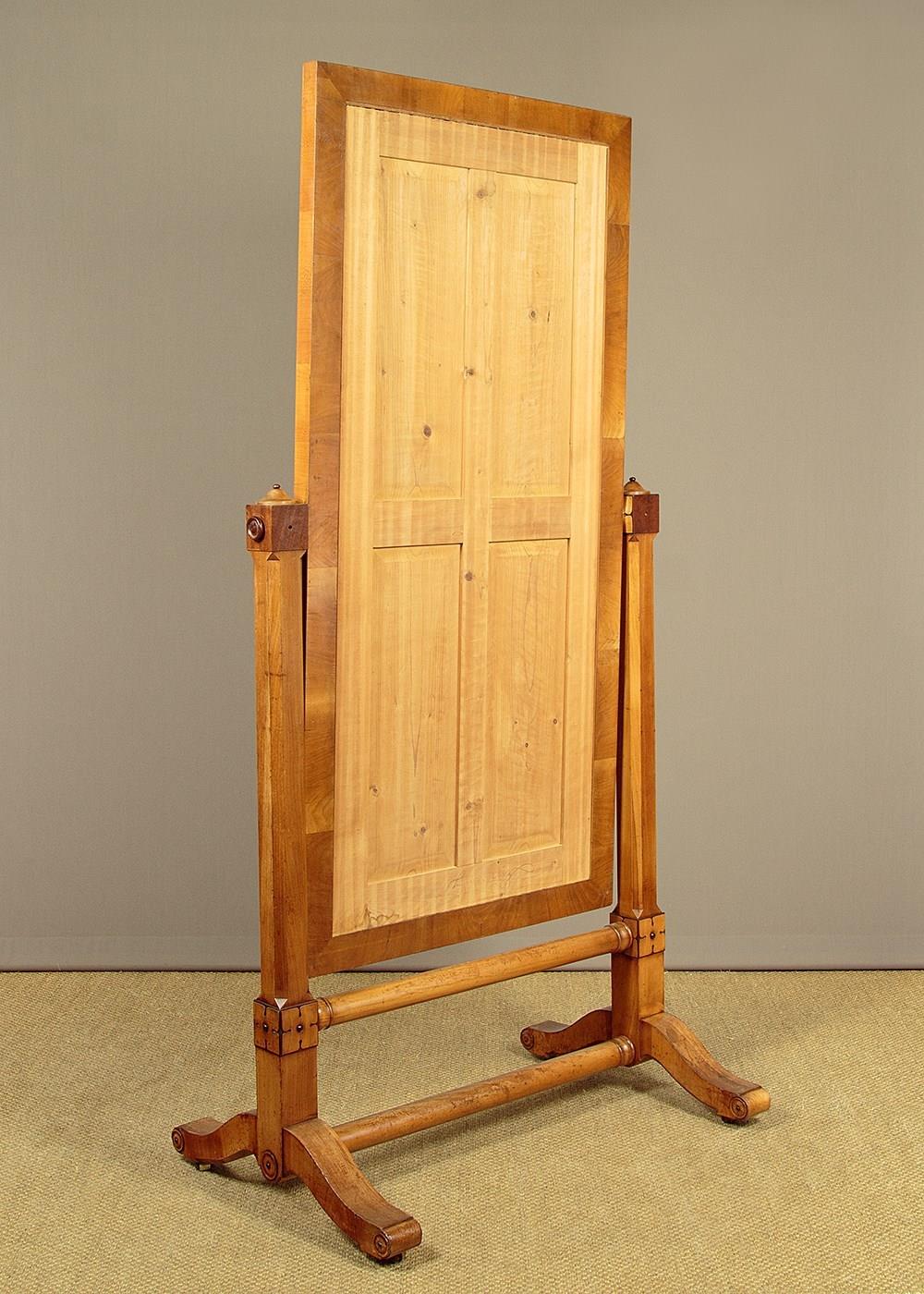Large late 19th.c. French cherrywood cheval or dressing mirror on stand c.1890. 24" x 55" mirror plate within a moulded frame with symmetrically arranged cherry veneers and a carved quatrefoil detail at each corner. Angle adjustable on a stand with chamfered square columns with the same quatrefoil details top and bottom. Joined with turned double stretchers and raised on wide curving feet with turned roundels at the toes and brass barrel castors below. Some small marks to the mirror (which could be replaced if preferred) and minor wear to the stand, most obvious around the feet. Generally very good colour and condition, cleaned and waxed in our workshops.