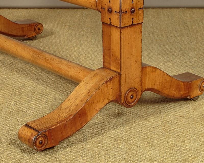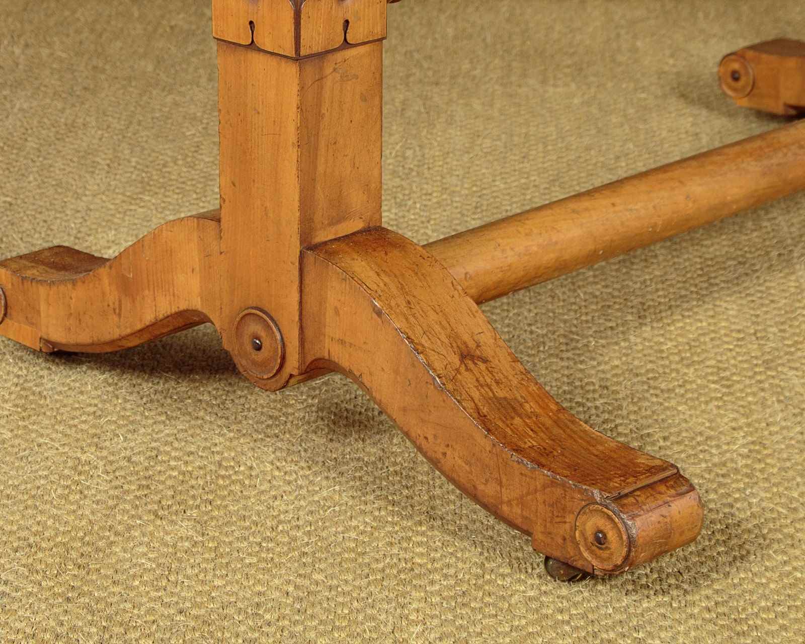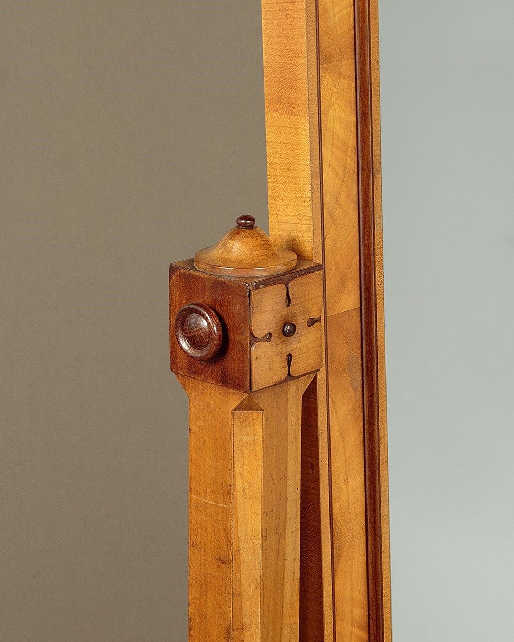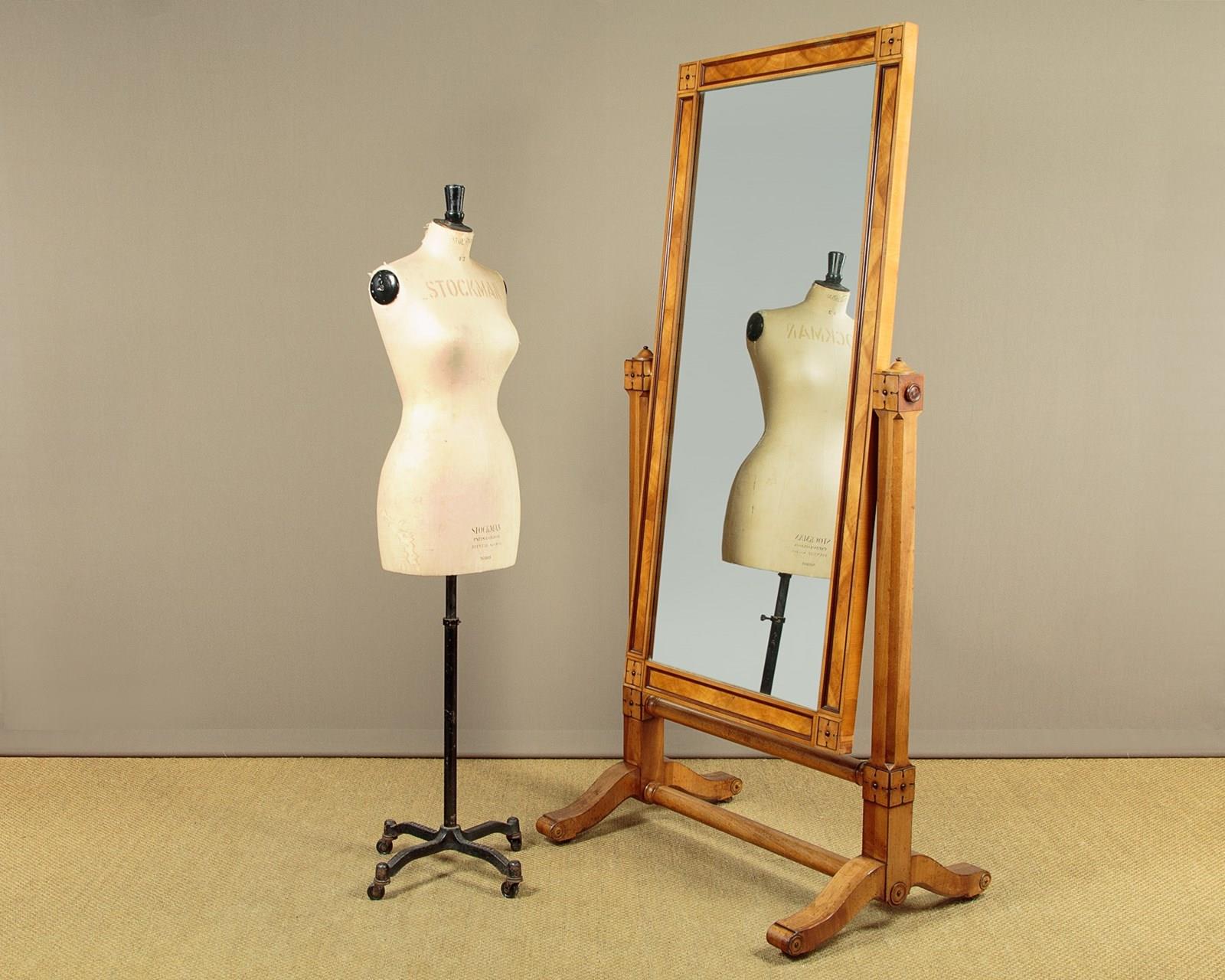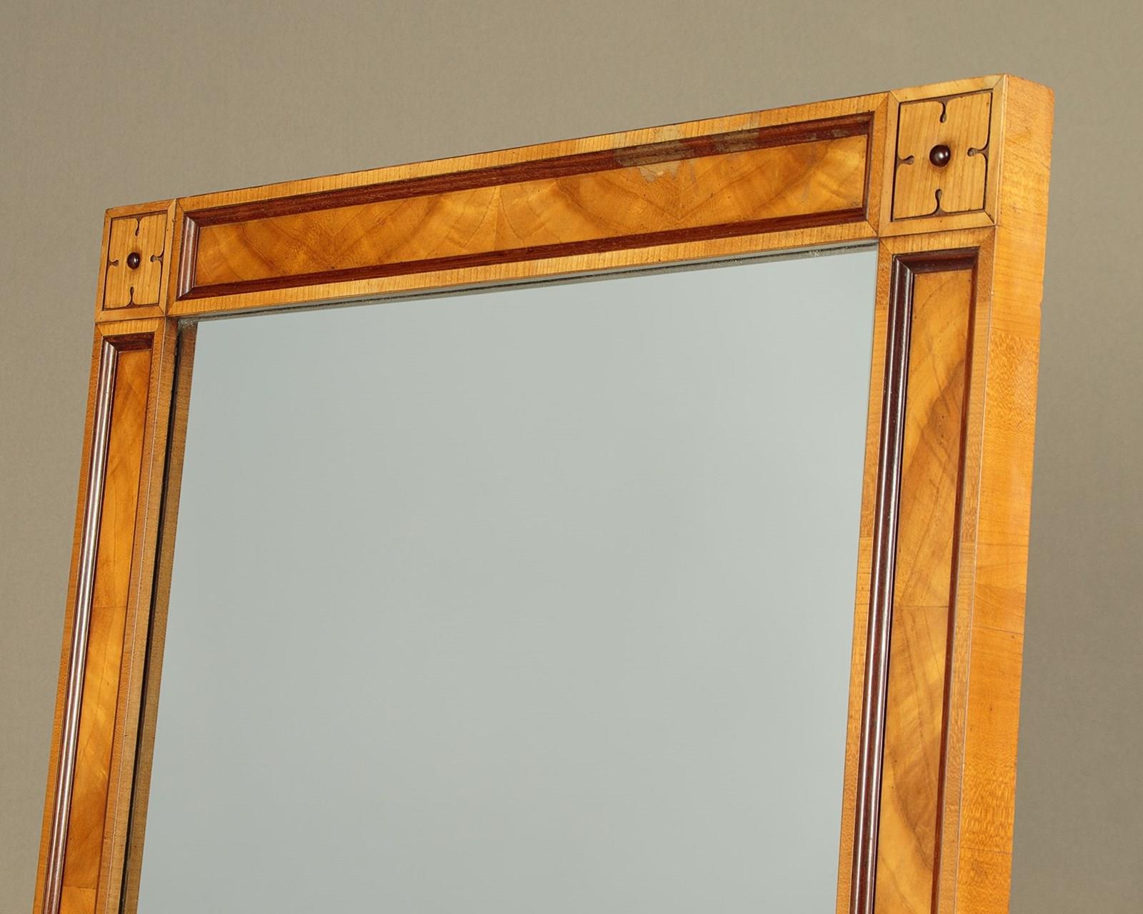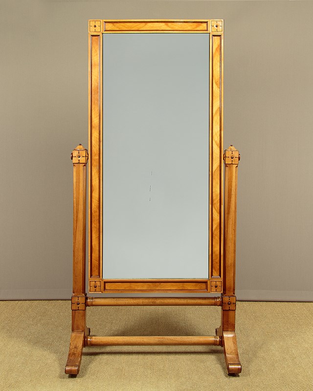 Large late 19th.c. French cherrywood cheval or dressing mirror on stand c.1890. 24" x 55" mirror plate within a moulded frame with symmetrically arranged cherry veneers and a carved quatrefoil detail at each corner. Angle adjustable on a stand with chamfered square columns with the same quatrefoil details top and bottom. Joined with turned double stretchers and raised on wide curving feet with turned roundels at the toes and brass barrel castors below. Some small marks to the mirror (which could be replaced if preferred) and minor wear to the stand, most obvious around the feet. Generally very good colour and condition, cleaned and waxed in our workshops.