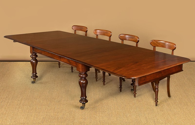 Impressive mid 19th.c. mahogany extending dining table by Pratt & Prince of Bradford Yorkshire c.1860. The top extending on a corkscrew mechanism and telescopic frame from a comfortable six seater table (length 59") to a maximum length of 128", with four additional leaves to seat 10 - 14 people. Solid mahogany top with a moulded edge and rounded corners. Good turned and segmented tulip legs with the original brass collared castors. Paper maker's label to the frame. Some old marks to the top, generally very good colour and condition, cleaned and waxed in our workshops. Winding handle supplied.