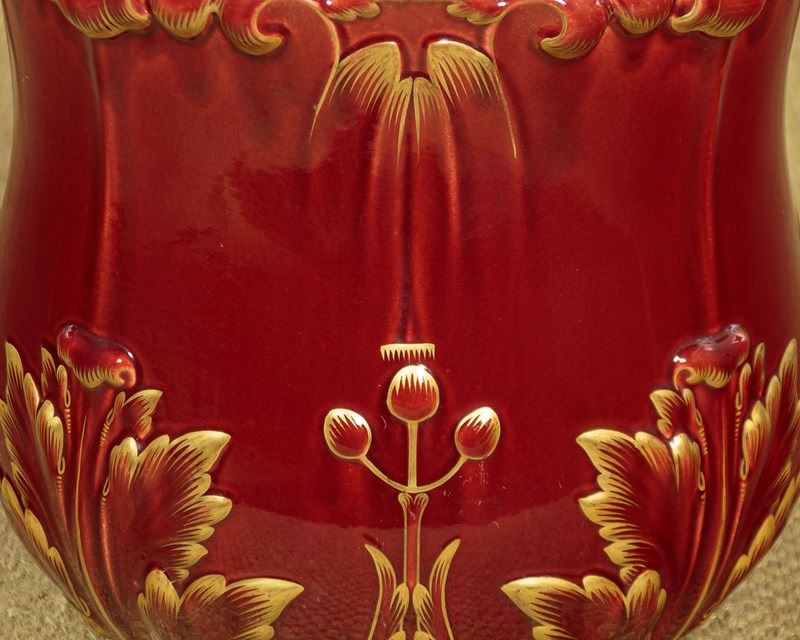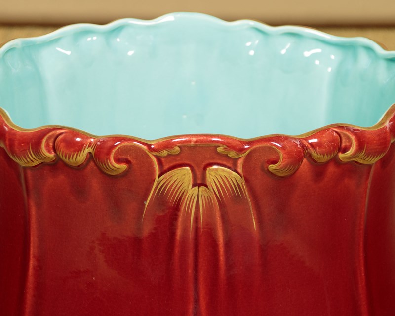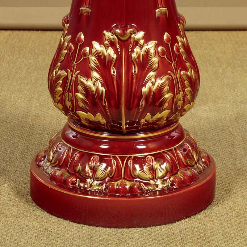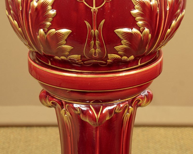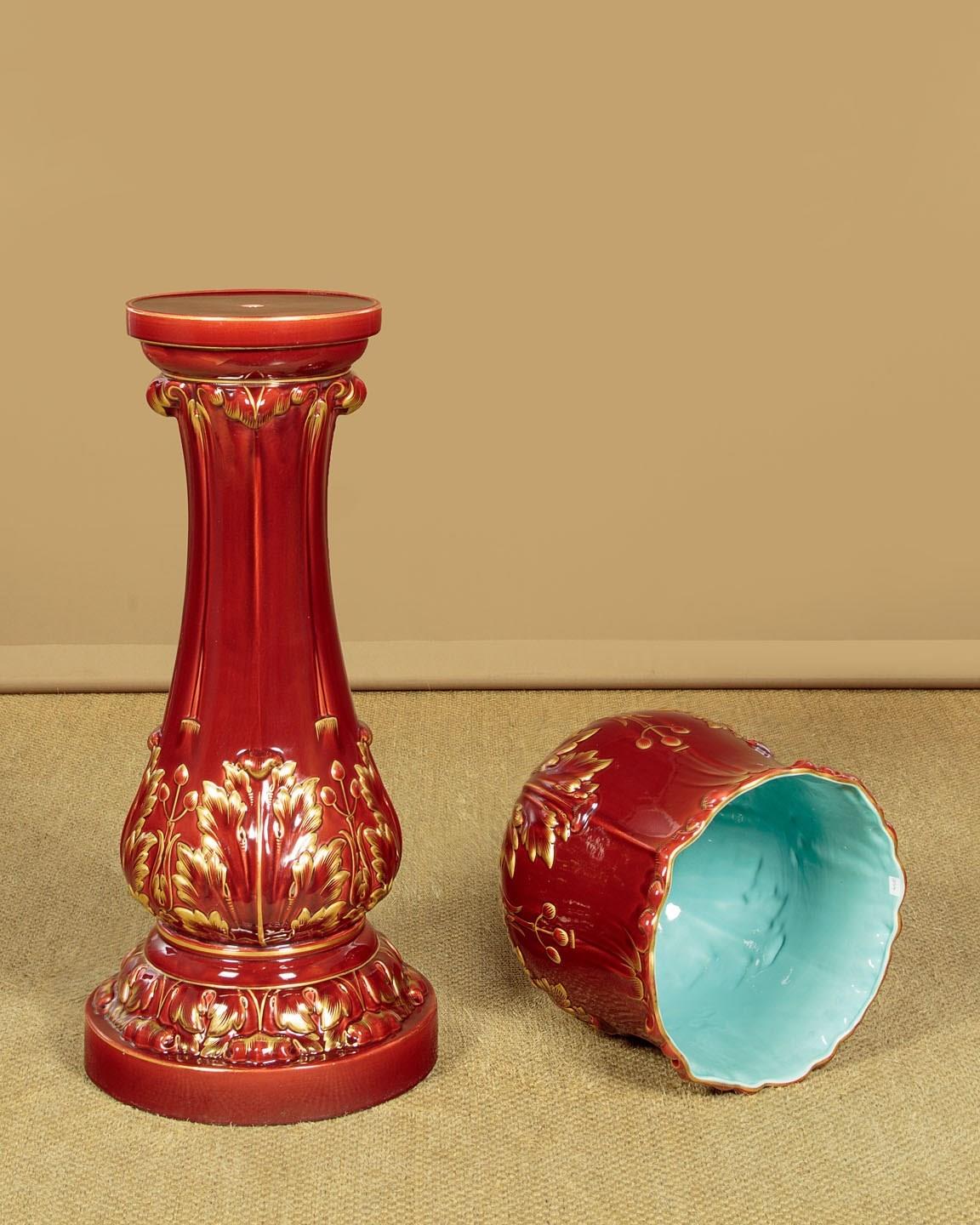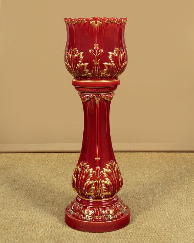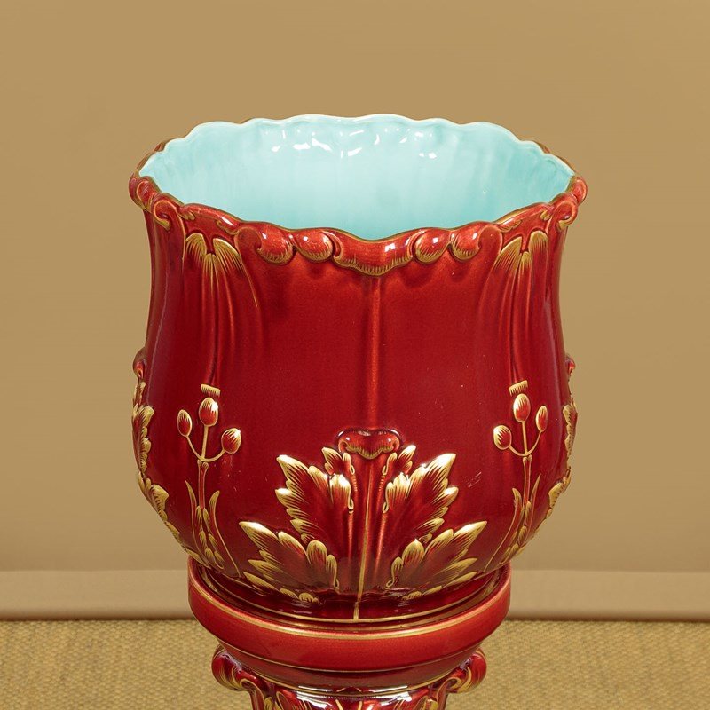 Splendid large majolica ware jardinière in stand by the French makers Sarreguemines (of the town with the same name in North East France) c.1880. 14" diameter jardinière (height 14") raised on the original column with 16" diameter base. Both modelled with acanthus form decoration, in a rich red majolica glaze with gilded detail. Pale blue interior to the jardinière bowl. Clear set of marks to the underside. Excellent condition.