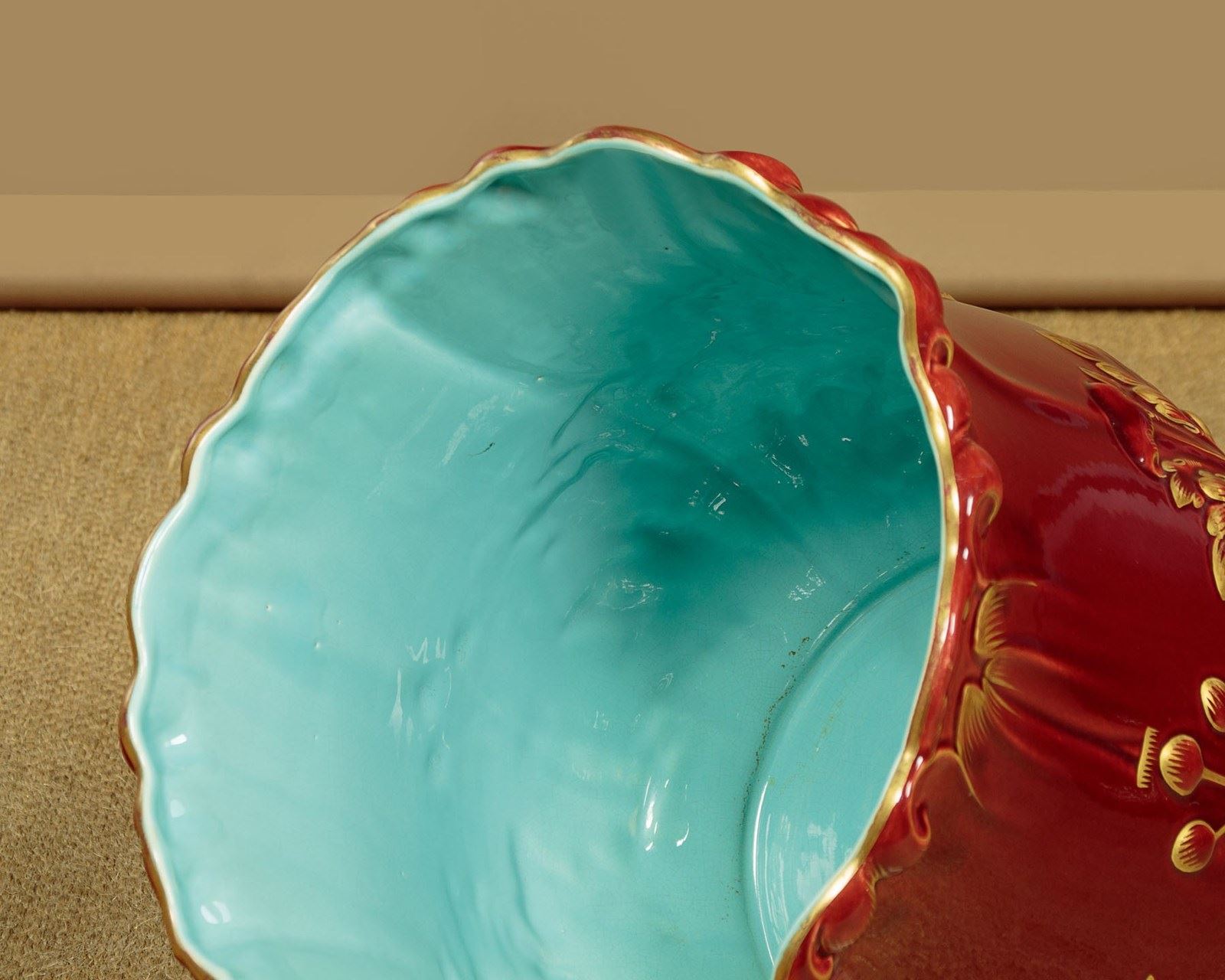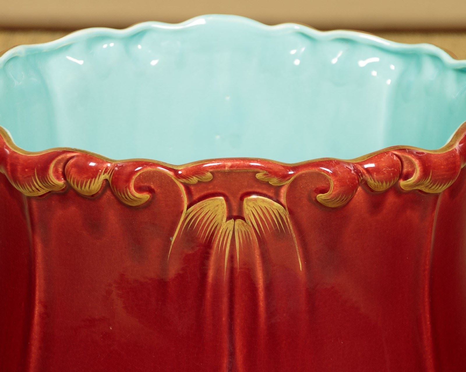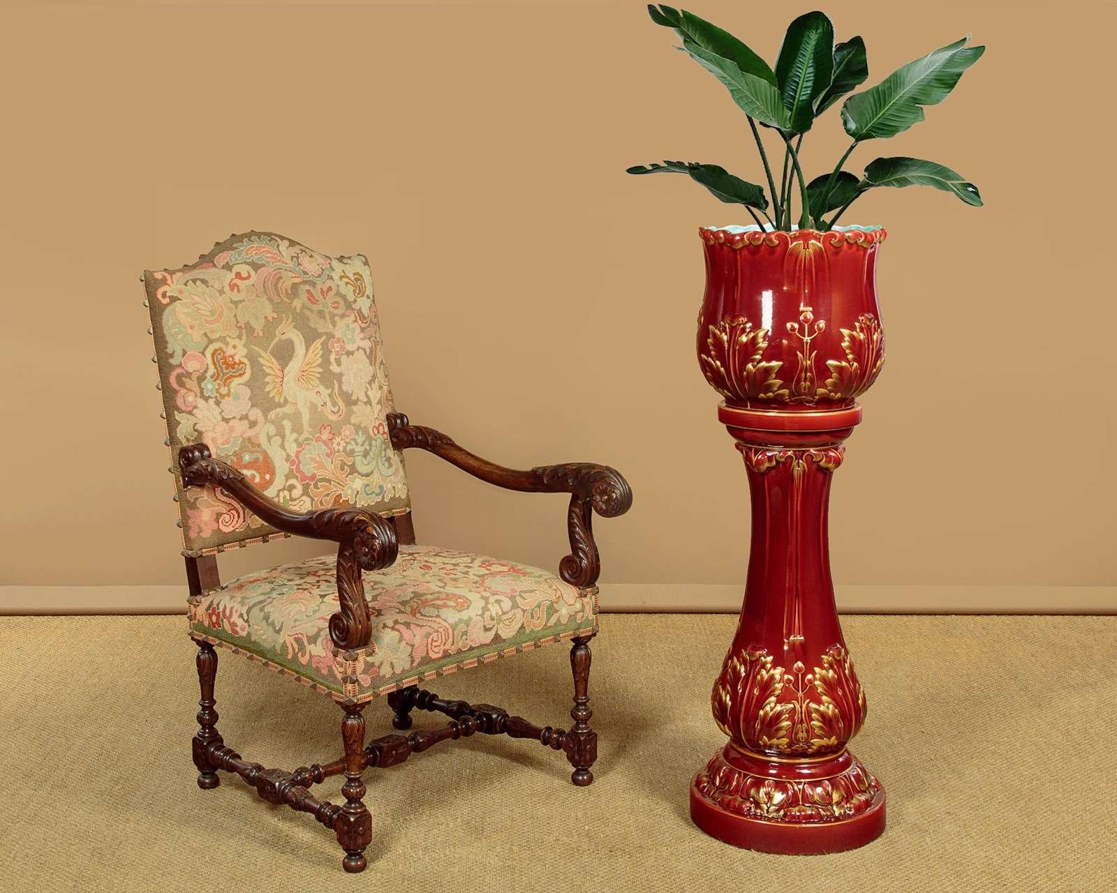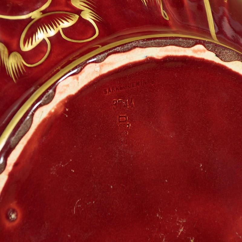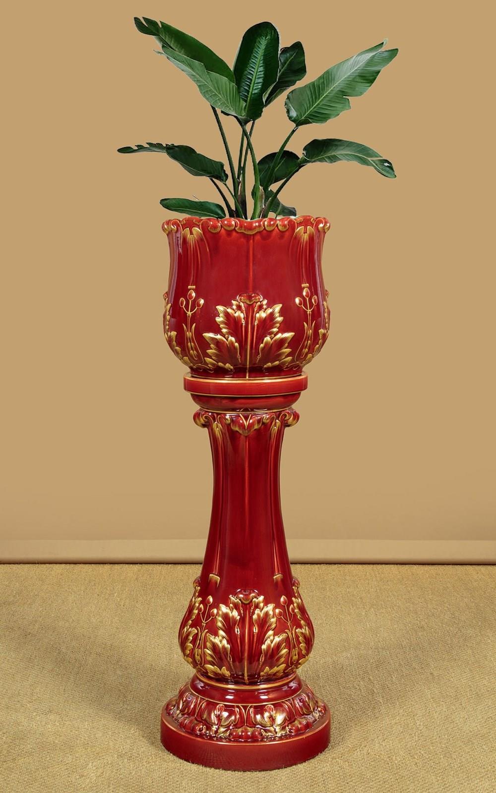 Splendid large majolica ware jardinière in stand by the French makers Sarreguemines (of the town with the same name in North East France) c.1880. 14" diameter jardinière (height 14") raised on the original column with 16" diameter base. Both modelled with acanthus form decoration, in a rich red majolica glaze with gilded detail. Pale blue interior to the jardinière bowl. Clear set of marks to the underside. Excellent condition.